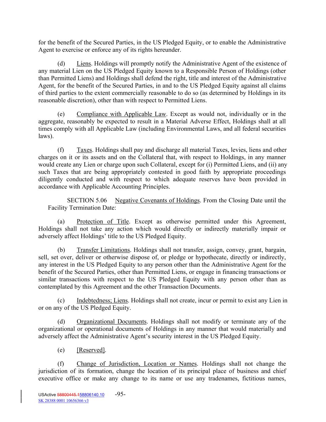 for the benefit of the Secured Parties, in the US Pledged Equity, or to enable the Administrative Agent to exercise or enforce any of its rights hereunder. (d) Liens. Holdings will promptly notify the Administrative Agent of the existence of any material Lien on the US Pledged Equity known to a Responsible Person of Holdings (other than Permitted Liens) and Holdings shall defend the right, title and interest of the Administrative Agent, for the benefit of the Secured Parties, in and to the US Pledged Equity against all claims of third parties to the extent commercially reasonable to do so (as determined by Holdings in its reasonable discretion), other than with respect to Permitted Liens. (e) Compliance with Applicable Law. Except as would not, individually or in the aggregate, reasonably be expected to result in a Material Adverse Effect, Holdings shall at all times comply with all Applicable Law (including Environmental Laws, and all federal securities laws). (f) Taxes. Holdings shall pay and discharge all material Taxes, levies, liens and other charges on it or its assets and on the Collateral that, with respect to Holdings, in any manner would create any Lien or charge upon such Collateral, except for (i) Permitted Liens, and (ii) any such Taxes that are being appropriately contested in good faith by appropriate proceedings diligently conducted and with respect to which adequate reserves have been provided in accordance with Applicable Accounting Principles. SECTION 5.06 Negative Covenants of Holdings. From the Closing Date until the Facility Termination Date: (a) Protection of Title. Except as otherwise permitted under this Agreement, Holdings shall not take any action which would directly or indirectly materially impair or adversely affect Holdings’ title to the US Pledged Equity. (b) Transfer Limitations. Holdings shall not transfer, assign, convey, grant, bargain, sell, set over, deliver or otherwise dispose of, or pledge or hypothecate, directly or indirectly, any interest in the US Pledged Equity to any person other than the Administrative Agent for the benefit of the Secured Parties, other than Permitted Liens, or engage in financing transactions or similar transactions with respect to the US Pledged Equity with any person other than as contemplated by this Agreement and the other Transaction Documents. (c) Indebtedness; Liens. Holdings shall not create, incur or permit to exist any Lien in or on any of the US Pledged Equity. (d) Organizational Documents. Holdings shall not modify or terminate any of the organizational or operational documents of Holdings in any manner that would materially and adversely affect the Administrative Agent’s security interest in the US Pledged Equity. (e) [Reserved]. (f) Change of Jurisdiction, Location or Names. Holdings shall not change the jurisdiction of its formation, change the location of its principal place of business and chief executive office or make any change to its name or use any tradenames, fictitious names, USActive 58800445.158806140.10 -95- SK 28388 0001 10656366 v3