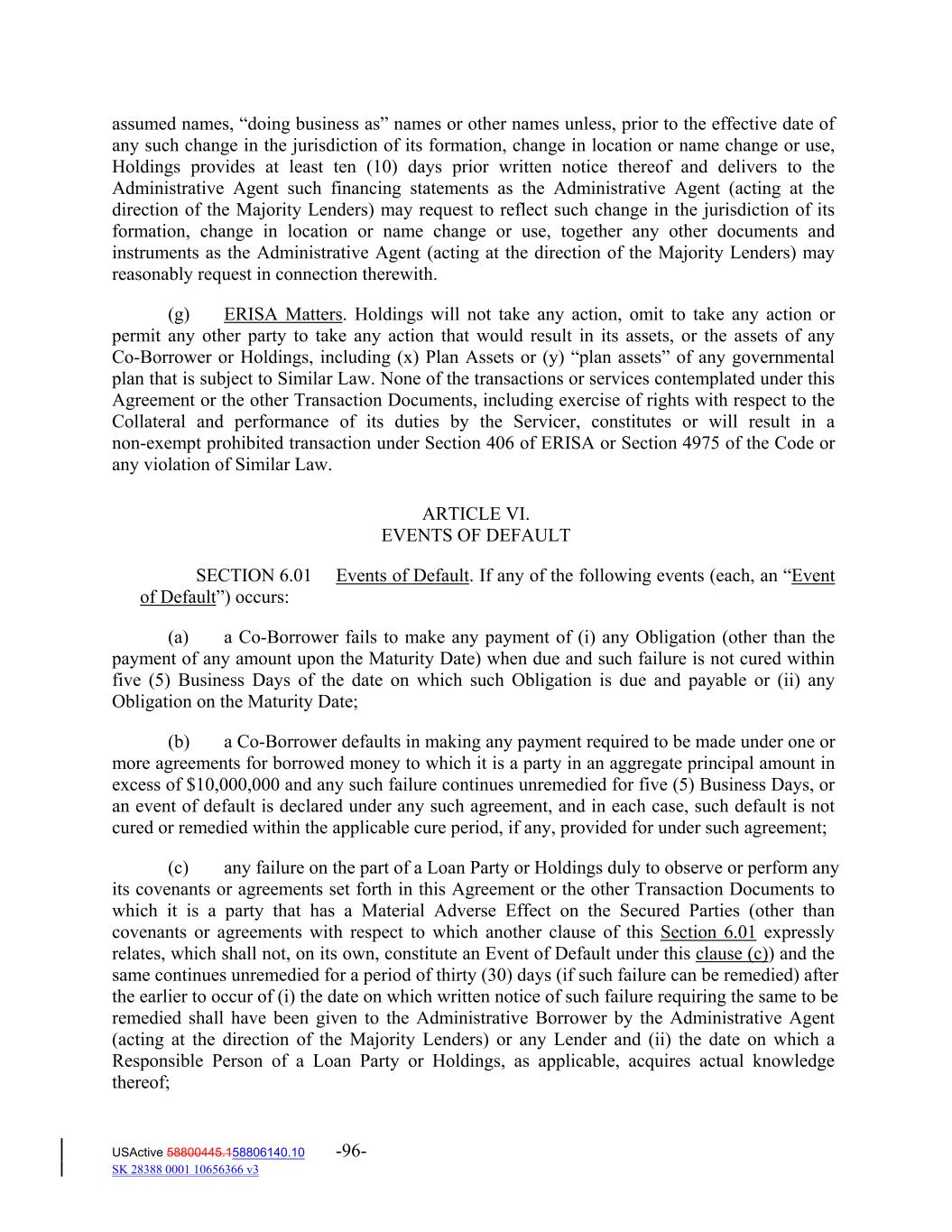 assumed names, “doing business as” names or other names unless, prior to the effective date of any such change in the jurisdiction of its formation, change in location or name change or use, Holdings provides at least ten (10) days prior written notice thereof and delivers to the Administrative Agent such financing statements as the Administrative Agent (acting at the direction of the Majority Lenders) may request to reflect such change in the jurisdiction of its formation, change in location or name change or use, together any other documents and instruments as the Administrative Agent (acting at the direction of the Majority Lenders) may reasonably request in connection therewith. (g) ERISA Matters. Holdings will not take any action, omit to take any action or permit any other party to take any action that would result in its assets, or the assets of any Co‐Borrower or Holdings, including (x) Plan Assets or (y) “plan assets” of any governmental plan that is subject to Similar Law. None of the transactions or services contemplated under this Agreement or the other Transaction Documents, including exercise of rights with respect to the Collateral and performance of its duties by the Servicer, constitutes or will result in a non‐exempt prohibited transaction under Section 406 of ERISA or Section 4975 of the Code or any violation of Similar Law. ARTICLE VI. EVENTS OF DEFAULT SECTION 6.01 Events of Default. If any of the following events (each, an “Event of Default”) occurs: (a) a Co‐Borrower fails to make any payment of (i) any Obligation (other than the payment of any amount upon the Maturity Date) when due and such failure is not cured within five (5) Business Days of the date on which such Obligation is due and payable or (ii) any Obligation on the Maturity Date; (b) a Co‐Borrower defaults in making any payment required to be made under one or more agreements for borrowed money to which it is a party in an aggregate principal amount in excess of $10,000,000 and any such failure continues unremedied for five (5) Business Days, or an event of default is declared under any such agreement, and in each case, such default is not cured or remedied within the applicable cure period, if any, provided for under such agreement; (c) any failure on the part of a Loan Party or Holdings duly to observe or perform any its covenants or agreements set forth in this Agreement or the other Transaction Documents to which it is a party that has a Material Adverse Effect on the Secured Parties (other than covenants or agreements with respect to which another clause of this Section 6.01 expressly relates, which shall not, on its own, constitute an Event of Default under this clause (c)) and the same continues unremedied for a period of thirty (30) days (if such failure can be remedied) after the earlier to occur of (i) the date on which written notice of such failure requiring the same to be remedied shall have been given to the Administrative Borrower by the Administrative Agent (acting at the direction of the Majority Lenders) or any Lender and (ii) the date on which a Responsible Person of a Loan Party or Holdings, as applicable, acquires actual knowledge thereof; USActive 58800445.158806140.10 -96- SK 28388 0001 10656366 v3