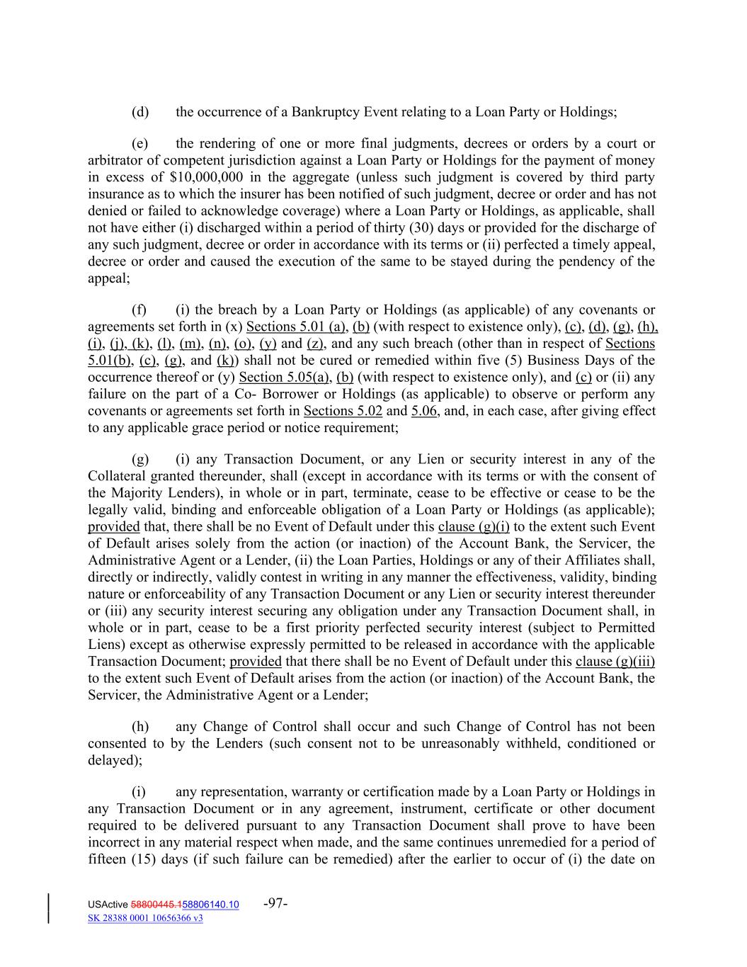 (d) the occurrence of a Bankruptcy Event relating to a Loan Party or Holdings; (e) the rendering of one or more final judgments, decrees or orders by a court or arbitrator of competent jurisdiction against a Loan Party or Holdings for the payment of money in excess of $10,000,000 in the aggregate (unless such judgment is covered by third party insurance as to which the insurer has been notified of such judgment, decree or order and has not denied or failed to acknowledge coverage) where a Loan Party or Holdings, as applicable, shall not have either (i) discharged within a period of thirty (30) days or provided for the discharge of any such judgment, decree or order in accordance with its terms or (ii) perfected a timely appeal, decree or order and caused the execution of the same to be stayed during the pendency of the appeal; (f) (i) the breach by a Loan Party or Holdings (as applicable) of any covenants or agreements set forth in (x) Sections 5.01 (a), (b) (with respect to existence only), (c), (d), (g), (h), (i), (j), (k), (l), (m), (n), (o), (y) and (z), and any such breach (other than in respect of Sections 5.01(b), (c), (g), and (k)) shall not be cured or remedied within five (5) Business Days of the occurrence thereof or (y) Section 5.05(a), (b) (with respect to existence only), and (c) or (ii) any failure on the part of a Co‐ Borrower or Holdings (as applicable) to observe or perform any covenants or agreements set forth in Sections 5.02 and 5.06, and, in each case, after giving effect to any applicable grace period or notice requirement; (g) (i) any Transaction Document, or any Lien or security interest in any of the Collateral granted thereunder, shall (except in accordance with its terms or with the consent of the Majority Lenders), in whole or in part, terminate, cease to be effective or cease to be the legally valid, binding and enforceable obligation of a Loan Party or Holdings (as applicable); provided that, there shall be no Event of Default under this clause (g)(i) to the extent such Event of Default arises solely from the action (or inaction) of the Account Bank, the Servicer, the Administrative Agent or a Lender, (ii) the Loan Parties, Holdings or any of their Affiliates shall, directly or indirectly, validly contest in writing in any manner the effectiveness, validity, binding nature or enforceability of any Transaction Document or any Lien or security interest thereunder or (iii) any security interest securing any obligation under any Transaction Document shall, in whole or in part, cease to be a first priority perfected security interest (subject to Permitted Liens) except as otherwise expressly permitted to be released in accordance with the applicable Transaction Document; provided that there shall be no Event of Default under this clause (g)(iii) to the extent such Event of Default arises from the action (or inaction) of the Account Bank, the Servicer, the Administrative Agent or a Lender; (h) any Change of Control shall occur and such Change of Control has not been consented to by the Lenders (such consent not to be unreasonably withheld, conditioned or delayed); (i) any representation, warranty or certification made by a Loan Party or Holdings in any Transaction Document or in any agreement, instrument, certificate or other document required to be delivered pursuant to any Transaction Document shall prove to have been incorrect in any material respect when made, and the same continues unremedied for a period of fifteen (15) days (if such failure can be remedied) after the earlier to occur of (i) the date on USActive 58800445.158806140.10 -97- SK 28388 0001 10656366 v3