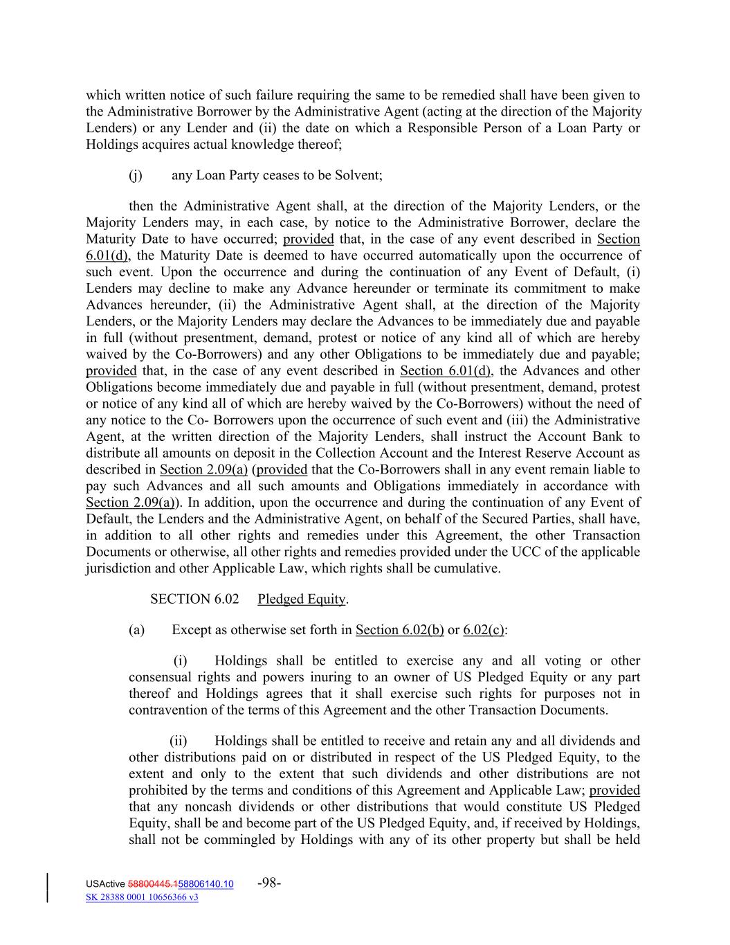 which written notice of such failure requiring the same to be remedied shall have been given to the Administrative Borrower by the Administrative Agent (acting at the direction of the Majority Lenders) or any Lender and (ii) the date on which a Responsible Person of a Loan Party or Holdings acquires actual knowledge thereof; (j) any Loan Party ceases to be Solvent; then the Administrative Agent shall, at the direction of the Majority Lenders, or the Majority Lenders may, in each case, by notice to the Administrative Borrower, declare the Maturity Date to have occurred; provided that, in the case of any event described in Section 6.01(d), the Maturity Date is deemed to have occurred automatically upon the occurrence of such event. Upon the occurrence and during the continuation of any Event of Default, (i) Lenders may decline to make any Advance hereunder or terminate its commitment to make Advances hereunder, (ii) the Administrative Agent shall, at the direction of the Majority Lenders, or the Majority Lenders may declare the Advances to be immediately due and payable in full (without presentment, demand, protest or notice of any kind all of which are hereby waived by the Co‐Borrowers) and any other Obligations to be immediately due and payable; provided that, in the case of any event described in Section 6.01(d), the Advances and other Obligations become immediately due and payable in full (without presentment, demand, protest or notice of any kind all of which are hereby waived by the Co‐Borrowers) without the need of any notice to the Co‐ Borrowers upon the occurrence of such event and (iii) the Administrative Agent, at the written direction of the Majority Lenders, shall instruct the Account Bank to distribute all amounts on deposit in the Collection Account and the Interest Reserve Account as described in Section 2.09(a) (provided that the Co‐Borrowers shall in any event remain liable to pay such Advances and all such amounts and Obligations immediately in accordance with Section 2.09(a)). In addition, upon the occurrence and during the continuation of any Event of Default, the Lenders and the Administrative Agent, on behalf of the Secured Parties, shall have, in addition to all other rights and remedies under this Agreement, the other Transaction Documents or otherwise, all other rights and remedies provided under the UCC of the applicable jurisdiction and other Applicable Law, which rights shall be cumulative. SECTION 6.02 Pledged Equity. (a) Except as otherwise set forth in Section 6.02(b) or 6.02(c): (i) Holdings shall be entitled to exercise any and all voting or other consensual rights and powers inuring to an owner of US Pledged Equity or any part thereof and Holdings agrees that it shall exercise such rights for purposes not in contravention of the terms of this Agreement and the other Transaction Documents. (ii) Holdings shall be entitled to receive and retain any and all dividends and other distributions paid on or distributed in respect of the US Pledged Equity, to the extent and only to the extent that such dividends and other distributions are not prohibited by the terms and conditions of this Agreement and Applicable Law; provided that any noncash dividends or other distributions that would constitute US Pledged Equity, shall be and become part of the US Pledged Equity, and, if received by Holdings, shall not be commingled by Holdings with any of its other property but shall be held USActive 58800445.158806140.10 -98- SK 28388 0001 10656366 v3