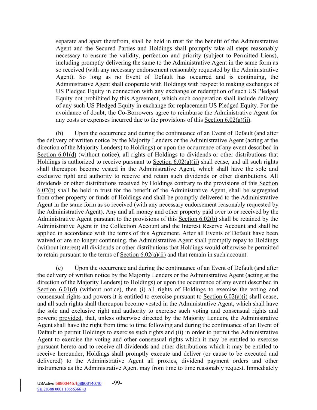 separate and apart therefrom, shall be held in trust for the benefit of the Administrative Agent and the Secured Parties and Holdings shall promptly take all steps reasonably necessary to ensure the validity, perfection and priority (subject to Permitted Liens), including promptly delivering the same to the Administrative Agent in the same form as so received (with any necessary endorsement reasonably requested by the Administrative Agent). So long as no Event of Default has occurred and is continuing, the Administrative Agent shall cooperate with Holdings with respect to making exchanges of US Pledged Equity in connection with any exchange or redemption of such US Pledged Equity not prohibited by this Agreement, which such cooperation shall include delivery of any such US Pledged Equity in exchange for replacement US Pledged Equity. For the avoidance of doubt, the Co‐Borrowers agree to reimburse the Administrative Agent for any costs or expenses incurred due to the provisions of this Section 6.02(a)(ii). (b) Upon the occurrence and during the continuance of an Event of Default (and after the delivery of written notice by the Majority Lenders or the Administrative Agent (acting at the direction of the Majority Lenders) to Holdings) or upon the occurrence of any event described in Section 6.01(d) (without notice), all rights of Holdings to dividends or other distributions that Holdings is authorized to receive pursuant to Section 6.02(a)(ii) shall cease, and all such rights shall thereupon become vested in the Administrative Agent, which shall have the sole and exclusive right and authority to receive and retain such dividends or other distributions. All dividends or other distributions received by Holdings contrary to the provisions of this Section 6.02(b) shall be held in trust for the benefit of the Administrative Agent, shall be segregated from other property or funds of Holdings and shall be promptly delivered to the Administrative Agent in the same form as so received (with any necessary endorsement reasonably requested by the Administrative Agent). Any and all money and other property paid over to or received by the Administrative Agent pursuant to the provisions of this Section 6.02(b) shall be retained by the Administrative Agent in the Collection Account and the Interest Reserve Account and shall be applied in accordance with the terms of this Agreement. After all Events of Default have been waived or are no longer continuing, the Administrative Agent shall promptly repay to Holdings (without interest) all dividends or other distributions that Holdings would otherwise be permitted to retain pursuant to the terms of Section 6.02(a)(ii) and that remain in such account. (c) Upon the occurrence and during the continuance of an Event of Default (and after the delivery of written notice by the Majority Lenders or the Administrative Agent (acting at the direction of the Majority Lenders) to Holdings) or upon the occurrence of any event described in Section 6.01(d) (without notice), then (i) all rights of Holdings to exercise the voting and consensual rights and powers it is entitled to exercise pursuant to Section 6.02(a)(i) shall cease, and all such rights shall thereupon become vested in the Administrative Agent, which shall have the sole and exclusive right and authority to exercise such voting and consensual rights and powers; provided, that, unless otherwise directed by the Majority Lenders, the Administrative Agent shall have the right from time to time following and during the continuance of an Event of Default to permit Holdings to exercise such rights and (ii) in order to permit the Administrative Agent to exercise the voting and other consensual rights which it may be entitled to exercise pursuant hereto and to receive all dividends and other distributions which it may be entitled to receive hereunder, Holdings shall promptly execute and deliver (or cause to be executed and delivered) to the Administrative Agent all proxies, dividend payment orders and other instruments as the Administrative Agent may from time to time reasonably request. Immediately USActive 58800445.158806140.10 -99- SK 28388 0001 10656366 v3