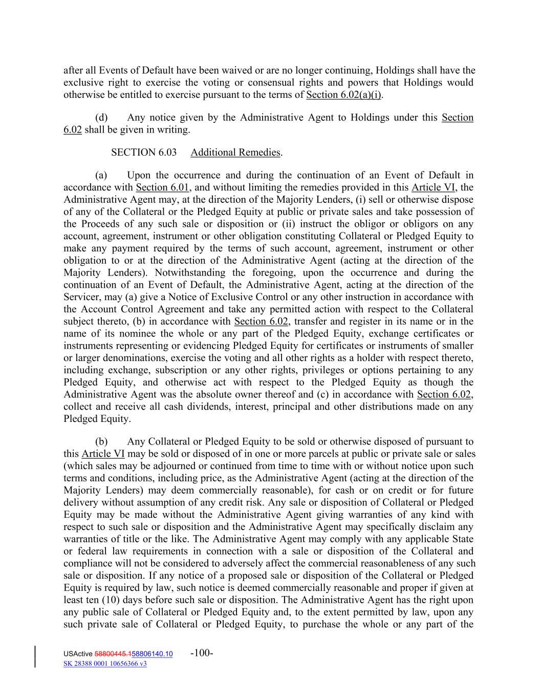 after all Events of Default have been waived or are no longer continuing, Holdings shall have the exclusive right to exercise the voting or consensual rights and powers that Holdings would otherwise be entitled to exercise pursuant to the terms of Section 6.02(a)(i). (d) Any notice given by the Administrative Agent to Holdings under this Section 6.02 shall be given in writing. SECTION 6.03 Additional Remedies. (a) Upon the occurrence and during the continuation of an Event of Default in accordance with Section 6.01, and without limiting the remedies provided in this Article VI, the Administrative Agent may, at the direction of the Majority Lenders, (i) sell or otherwise dispose of any of the Collateral or the Pledged Equity at public or private sales and take possession of the Proceeds of any such sale or disposition or (ii) instruct the obligor or obligors on any account, agreement, instrument or other obligation constituting Collateral or Pledged Equity to make any payment required by the terms of such account, agreement, instrument or other obligation to or at the direction of the Administrative Agent (acting at the direction of the Majority Lenders). Notwithstanding the foregoing, upon the occurrence and during the continuation of an Event of Default, the Administrative Agent, acting at the direction of the Servicer, may (a) give a Notice of Exclusive Control or any other instruction in accordance with the Account Control Agreement and take any permitted action with respect to the Collateral subject thereto, (b) in accordance with Section 6.02, transfer and register in its name or in the name of its nominee the whole or any part of the Pledged Equity, exchange certificates or instruments representing or evidencing Pledged Equity for certificates or instruments of smaller or larger denominations, exercise the voting and all other rights as a holder with respect thereto, including exchange, subscription or any other rights, privileges or options pertaining to any Pledged Equity, and otherwise act with respect to the Pledged Equity as though the Administrative Agent was the absolute owner thereof and (c) in accordance with Section 6.02, collect and receive all cash dividends, interest, principal and other distributions made on any Pledged Equity. (b) Any Collateral or Pledged Equity to be sold or otherwise disposed of pursuant to this Article VI may be sold or disposed of in one or more parcels at public or private sale or sales (which sales may be adjourned or continued from time to time with or without notice upon such terms and conditions, including price, as the Administrative Agent (acting at the direction of the Majority Lenders) may deem commercially reasonable), for cash or on credit or for future delivery without assumption of any credit risk. Any sale or disposition of Collateral or Pledged Equity may be made without the Administrative Agent giving warranties of any kind with respect to such sale or disposition and the Administrative Agent may specifically disclaim any warranties of title or the like. The Administrative Agent may comply with any applicable State or federal law requirements in connection with a sale or disposition of the Collateral and compliance will not be considered to adversely affect the commercial reasonableness of any such sale or disposition. If any notice of a proposed sale or disposition of the Collateral or Pledged Equity is required by law, such notice is deemed commercially reasonable and proper if given at least ten (10) days before such sale or disposition. The Administrative Agent has the right upon any public sale of Collateral or Pledged Equity and, to the extent permitted by law, upon any such private sale of Collateral or Pledged Equity, to purchase the whole or any part of the USActive 58800445.158806140.10 -100- SK 28388 0001 10656366 v3