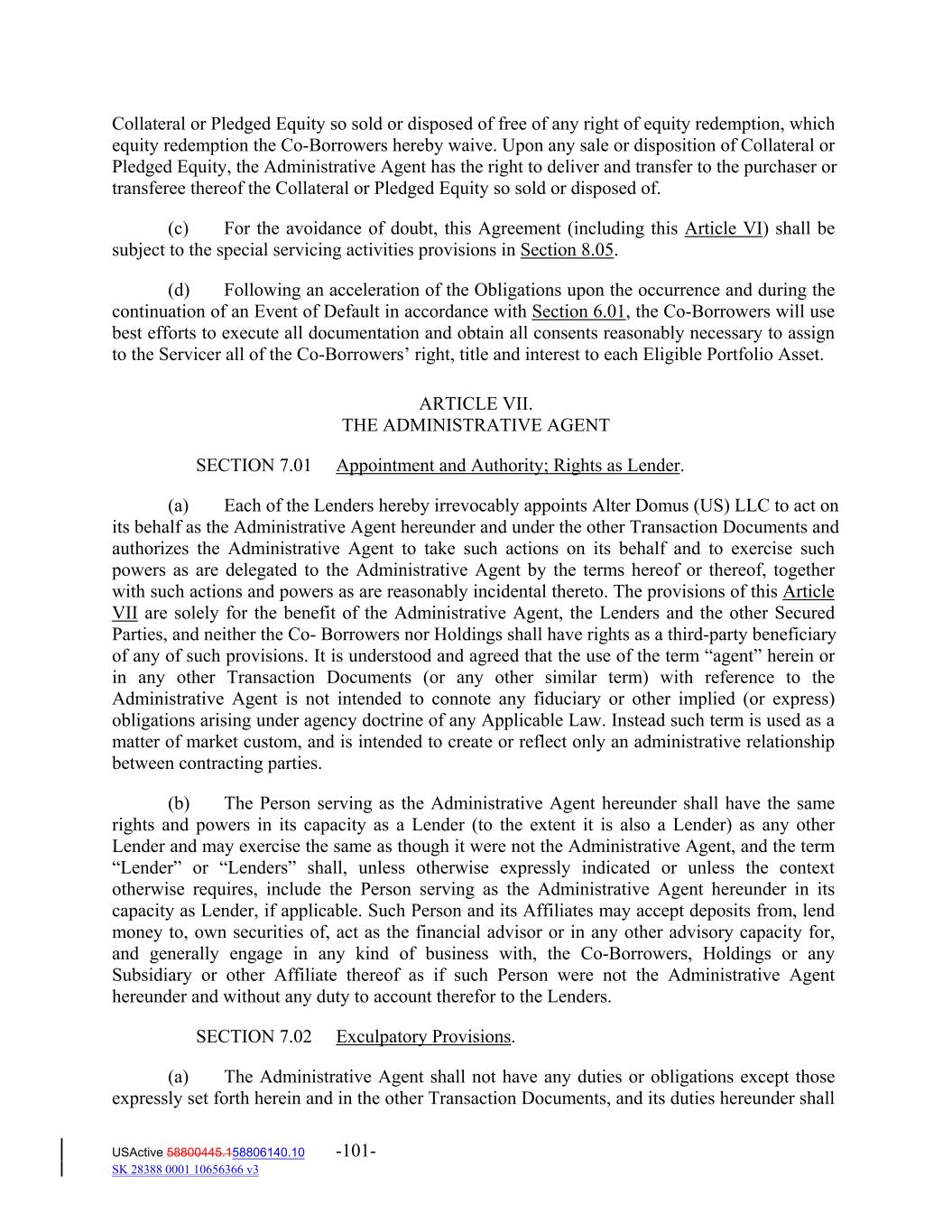 Collateral or Pledged Equity so sold or disposed of free of any right of equity redemption, which equity redemption the Co‐Borrowers hereby waive. Upon any sale or disposition of Collateral or Pledged Equity, the Administrative Agent has the right to deliver and transfer to the purchaser or transferee thereof the Collateral or Pledged Equity so sold or disposed of. (c) For the avoidance of doubt, this Agreement (including this Article VI) shall be subject to the special servicing activities provisions in Section 8.05. (d) Following an acceleration of the Obligations upon the occurrence and during the continuation of an Event of Default in accordance with Section 6.01, the Co‐Borrowers will use best efforts to execute all documentation and obtain all consents reasonably necessary to assign to the Servicer all of the Co‐Borrowers’ right, title and interest to each Eligible Portfolio Asset. ARTICLE VII. THE ADMINISTRATIVE AGENT SECTION 7.01 Appointment and Authority; Rights as Lender. (a) Each of the Lenders hereby irrevocably appoints Alter Domus (US) LLC to act on its behalf as the Administrative Agent hereunder and under the other Transaction Documents and authorizes the Administrative Agent to take such actions on its behalf and to exercise such powers as are delegated to the Administrative Agent by the terms hereof or thereof, together with such actions and powers as are reasonably incidental thereto. The provisions of this Article VII are solely for the benefit of the Administrative Agent, the Lenders and the other Secured Parties, and neither the Co‐ Borrowers nor Holdings shall have rights as a third‐party beneficiary of any of such provisions. It is understood and agreed that the use of the term “agent” herein or in any other Transaction Documents (or any other similar term) with reference to the Administrative Agent is not intended to connote any fiduciary or other implied (or express) obligations arising under agency doctrine of any Applicable Law. Instead such term is used as a matter of market custom, and is intended to create or reflect only an administrative relationship between contracting parties. (b) The Person serving as the Administrative Agent hereunder shall have the same rights and powers in its capacity as a Lender (to the extent it is also a Lender) as any other Lender and may exercise the same as though it were not the Administrative Agent, and the term “Lender” or “Lenders” shall, unless otherwise expressly indicated or unless the context otherwise requires, include the Person serving as the Administrative Agent hereunder in its capacity as Lender, if applicable. Such Person and its Affiliates may accept deposits from, lend money to, own securities of, act as the financial advisor or in any other advisory capacity for, and generally engage in any kind of business with, the Co‐Borrowers, Holdings or any Subsidiary or other Affiliate thereof as if such Person were not the Administrative Agent hereunder and without any duty to account therefor to the Lenders. SECTION 7.02 Exculpatory Provisions. (a) The Administrative Agent shall not have any duties or obligations except those expressly set forth herein and in the other Transaction Documents, and its duties hereunder shall USActive 58800445.158806140.10 -101- SK 28388 0001 10656366 v3