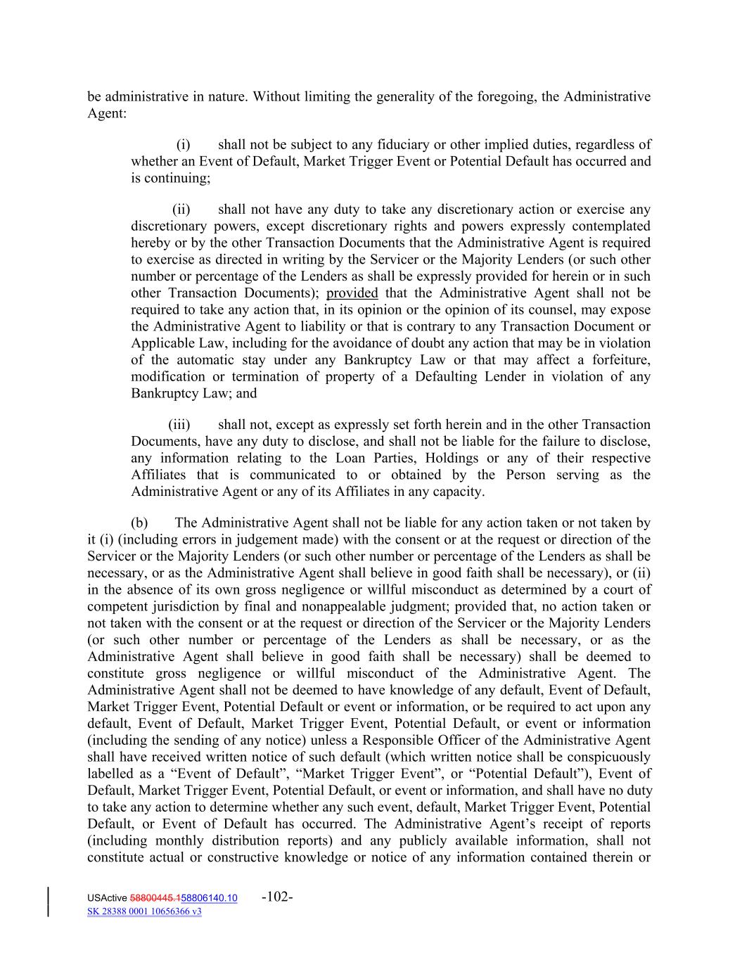 be administrative in nature. Without limiting the generality of the foregoing, the Administrative Agent: (i) shall not be subject to any fiduciary or other implied duties, regardless of whether an Event of Default, Market Trigger Event or Potential Default has occurred and is continuing; (ii) shall not have any duty to take any discretionary action or exercise any discretionary powers, except discretionary rights and powers expressly contemplated hereby or by the other Transaction Documents that the Administrative Agent is required to exercise as directed in writing by the Servicer or the Majority Lenders (or such other number or percentage of the Lenders as shall be expressly provided for herein or in such other Transaction Documents); provided that the Administrative Agent shall not be required to take any action that, in its opinion or the opinion of its counsel, may expose the Administrative Agent to liability or that is contrary to any Transaction Document or Applicable Law, including for the avoidance of doubt any action that may be in violation of the automatic stay under any Bankruptcy Law or that may affect a forfeiture, modification or termination of property of a Defaulting Lender in violation of any Bankruptcy Law; and (iii) shall not, except as expressly set forth herein and in the other Transaction Documents, have any duty to disclose, and shall not be liable for the failure to disclose, any information relating to the Loan Parties, Holdings or any of their respective Affiliates that is communicated to or obtained by the Person serving as the Administrative Agent or any of its Affiliates in any capacity. (b) The Administrative Agent shall not be liable for any action taken or not taken by it (i) (including errors in judgement made) with the consent or at the request or direction of the Servicer or the Majority Lenders (or such other number or percentage of the Lenders as shall be necessary, or as the Administrative Agent shall believe in good faith shall be necessary), or (ii) in the absence of its own gross negligence or willful misconduct as determined by a court of competent jurisdiction by final and nonappealable judgment; provided that, no action taken or not taken with the consent or at the request or direction of the Servicer or the Majority Lenders (or such other number or percentage of the Lenders as shall be necessary, or as the Administrative Agent shall believe in good faith shall be necessary) shall be deemed to constitute gross negligence or willful misconduct of the Administrative Agent. The Administrative Agent shall not be deemed to have knowledge of any default, Event of Default, Market Trigger Event, Potential Default or event or information, or be required to act upon any default, Event of Default, Market Trigger Event, Potential Default, or event or information (including the sending of any notice) unless a Responsible Officer of the Administrative Agent shall have received written notice of such default (which written notice shall be conspicuously labelled as a “Event of Default”, “Market Trigger Event”, or “Potential Default”), Event of Default, Market Trigger Event, Potential Default, or event or information, and shall have no duty to take any action to determine whether any such event, default, Market Trigger Event, Potential Default, or Event of Default has occurred. The Administrative Agent’s receipt of reports (including monthly distribution reports) and any publicly available information, shall not constitute actual or constructive knowledge or notice of any information contained therein or USActive 58800445.158806140.10 -102- SK 28388 0001 10656366 v3