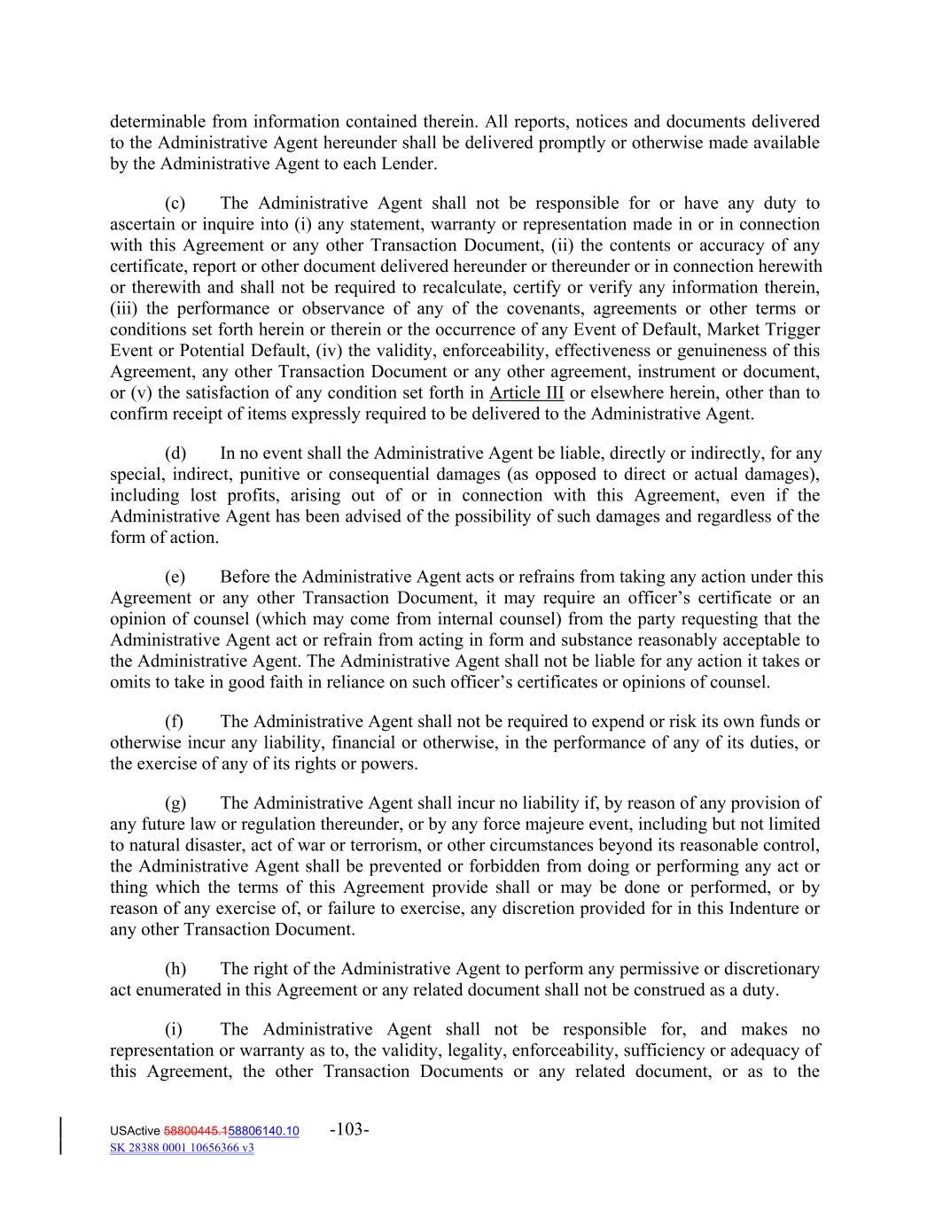 determinable from information contained therein. All reports, notices and documents delivered to the Administrative Agent hereunder shall be delivered promptly or otherwise made available by the Administrative Agent to each Lender. (c) The Administrative Agent shall not be responsible for or have any duty to ascertain or inquire into (i) any statement, warranty or representation made in or in connection with this Agreement or any other Transaction Document, (ii) the contents or accuracy of any certificate, report or other document delivered hereunder or thereunder or in connection herewith or therewith and shall not be required to recalculate, certify or verify any information therein, (iii) the performance or observance of any of the covenants, agreements or other terms or conditions set forth herein or therein or the occurrence of any Event of Default, Market Trigger Event or Potential Default, (iv) the validity, enforceability, effectiveness or genuineness of this Agreement, any other Transaction Document or any other agreement, instrument or document, or (v) the satisfaction of any condition set forth in Article III or elsewhere herein, other than to confirm receipt of items expressly required to be delivered to the Administrative Agent. (d) In no event shall the Administrative Agent be liable, directly or indirectly, for any special, indirect, punitive or consequential damages (as opposed to direct or actual damages), including lost profits, arising out of or in connection with this Agreement, even if the Administrative Agent has been advised of the possibility of such damages and regardless of the form of action. (e) Before the Administrative Agent acts or refrains from taking any action under this Agreement or any other Transaction Document, it may require an officer’s certificate or an opinion of counsel (which may come from internal counsel) from the party requesting that the Administrative Agent act or refrain from acting in form and substance reasonably acceptable to the Administrative Agent. The Administrative Agent shall not be liable for any action it takes or omits to take in good faith in reliance on such officer’s certificates or opinions of counsel. (f) The Administrative Agent shall not be required to expend or risk its own funds or otherwise incur any liability, financial or otherwise, in the performance of any of its duties, or the exercise of any of its rights or powers. (g) The Administrative Agent shall incur no liability if, by reason of any provision of any future law or regulation thereunder, or by any force majeure event, including but not limited to natural disaster, act of war or terrorism, or other circumstances beyond its reasonable control, the Administrative Agent shall be prevented or forbidden from doing or performing any act or thing which the terms of this Agreement provide shall or may be done or performed, or by reason of any exercise of, or failure to exercise, any discretion provided for in this Indenture or any other Transaction Document. (h) The right of the Administrative Agent to perform any permissive or discretionary act enumerated in this Agreement or any related document shall not be construed as a duty. (i) The Administrative Agent shall not be responsible for, and makes no representation or warranty as to, the validity, legality, enforceability, sufficiency or adequacy of this Agreement, the other Transaction Documents or any related document, or as to the USActive 58800445.158806140.10 -103- SK 28388 0001 10656366 v3