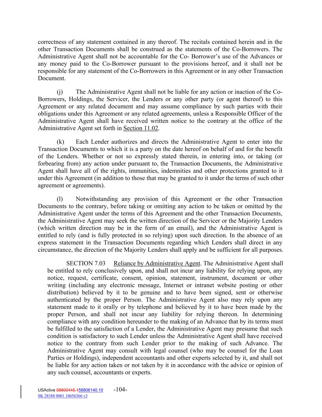 correctness of any statement contained in any thereof. The recitals contained herein and in the other Transaction Documents shall be construed as the statements of the Co‐Borrowers. The Administrative Agent shall not be accountable for the Co‐ Borrower’s use of the Advances or any money paid to the Co‐Borrower pursuant to the provisions hereof, and it shall not be responsible for any statement of the Co‐Borrowers in this Agreement or in any other Transaction Document. (j) The Administrative Agent shall not be liable for any action or inaction of the Co‐ Borrowers, Holdings, the Servicer, the Lenders or any other party (or agent thereof) to this Agreement or any related document and may assume compliance by such parties with their obligations under this Agreement or any related agreements, unless a Responsible Officer of the Administrative Agent shall have received written notice to the contrary at the office of the Administrative Agent set forth in Section 11.02. (k) Each Lender authorizes and directs the Administrative Agent to enter into the Transaction Documents to which it is a party on the date hereof on behalf of and for the benefit of the Lenders. Whether or not so expressly stated therein, in entering into, or taking (or forbearing from) any action under pursuant to, the Transaction Documents, the Administrative Agent shall have all of the rights, immunities, indemnities and other protections granted to it under this Agreement (in addition to those that may be granted to it under the terms of such other agreement or agreements). (l) Notwithstanding any provision of this Agreement or the other Transaction Documents to the contrary, before taking or omitting any action to be taken or omitted by the Administrative Agent under the terms of this Agreement and the other Transaction Documents, the Administrative Agent may seek the written direction of the Servicer or the Majority Lenders (which written direction may be in the form of an email), and the Administrative Agent is entitled to rely (and is fully protected in so relying) upon such direction. In the absence of an express statement in the Transaction Documents regarding which Lenders shall direct in any circumstance, the direction of the Majority Lenders shall apply and be sufficient for all purposes. SECTION 7.03 Reliance by Administrative Agent. The Administrative Agent shall be entitled to rely conclusively upon, and shall not incur any liability for relying upon, any notice, request, certificate, consent, opinion, statement, instrument, document or other writing (including any electronic message, Internet or intranet website posting or other distribution) believed by it to be genuine and to have been signed, sent or otherwise authenticated by the proper Person. The Administrative Agent also may rely upon any statement made to it orally or by telephone and believed by it to have been made by the proper Person, and shall not incur any liability for relying thereon. In determining compliance with any condition hereunder to the making of an Advance that by its terms must be fulfilled to the satisfaction of a Lender, the Administrative Agent may presume that such condition is satisfactory to such Lender unless the Administrative Agent shall have received notice to the contrary from such Lender prior to the making of such Advance. The Administrative Agent may consult with legal counsel (who may be counsel for the Loan Parties or Holdings), independent accountants and other experts selected by it, and shall not be liable for any action taken or not taken by it in accordance with the advice or opinion of any such counsel, accountants or experts. USActive 58800445.158806140.10 -104- SK 28388 0001 10656366 v3