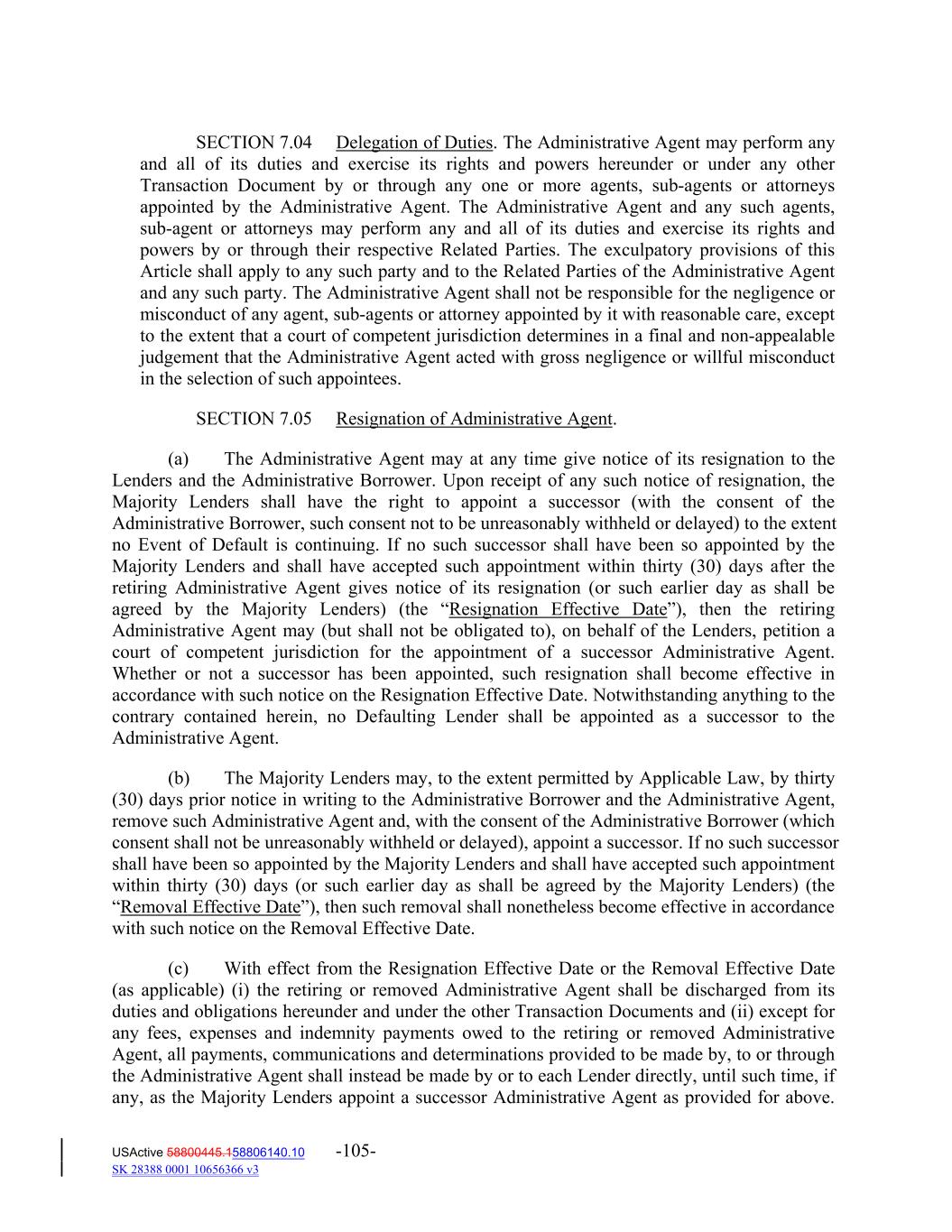 SECTION 7.04 Delegation of Duties. The Administrative Agent may perform any and all of its duties and exercise its rights and powers hereunder or under any other Transaction Document by or through any one or more agents, sub‐agents or attorneys appointed by the Administrative Agent. The Administrative Agent and any such agents, sub‐agent or attorneys may perform any and all of its duties and exercise its rights and powers by or through their respective Related Parties. The exculpatory provisions of this Article shall apply to any such party and to the Related Parties of the Administrative Agent and any such party. The Administrative Agent shall not be responsible for the negligence or misconduct of any agent, sub‐agents or attorney appointed by it with reasonable care, except to the extent that a court of competent jurisdiction determines in a final and non‐appealable judgement that the Administrative Agent acted with gross negligence or willful misconduct in the selection of such appointees. SECTION 7.05 Resignation of Administrative Agent. (a) The Administrative Agent may at any time give notice of its resignation to the Lenders and the Administrative Borrower. Upon receipt of any such notice of resignation, the Majority Lenders shall have the right to appoint a successor (with the consent of the Administrative Borrower, such consent not to be unreasonably withheld or delayed) to the extent no Event of Default is continuing. If no such successor shall have been so appointed by the Majority Lenders and shall have accepted such appointment within thirty (30) days after the retiring Administrative Agent gives notice of its resignation (or such earlier day as shall be agreed by the Majority Lenders) (the “Resignation Effective Date”), then the retiring Administrative Agent may (but shall not be obligated to), on behalf of the Lenders, petition a court of competent jurisdiction for the appointment of a successor Administrative Agent. Whether or not a successor has been appointed, such resignation shall become effective in accordance with such notice on the Resignation Effective Date. Notwithstanding anything to the contrary contained herein, no Defaulting Lender shall be appointed as a successor to the Administrative Agent. (b) The Majority Lenders may, to the extent permitted by Applicable Law, by thirty (30) days prior notice in writing to the Administrative Borrower and the Administrative Agent, remove such Administrative Agent and, with the consent of the Administrative Borrower (which consent shall not be unreasonably withheld or delayed), appoint a successor. If no such successor shall have been so appointed by the Majority Lenders and shall have accepted such appointment within thirty (30) days (or such earlier day as shall be agreed by the Majority Lenders) (the “Removal Effective Date”), then such removal shall nonetheless become effective in accordance with such notice on the Removal Effective Date. (c) With effect from the Resignation Effective Date or the Removal Effective Date (as applicable) (i) the retiring or removed Administrative Agent shall be discharged from its duties and obligations hereunder and under the other Transaction Documents and (ii) except for any fees, expenses and indemnity payments owed to the retiring or removed Administrative Agent, all payments, communications and determinations provided to be made by, to or through the Administrative Agent shall instead be made by or to each Lender directly, until such time, if any, as the Majority Lenders appoint a successor Administrative Agent as provided for above. USActive 58800445.158806140.10 -105- SK 28388 0001 10656366 v3