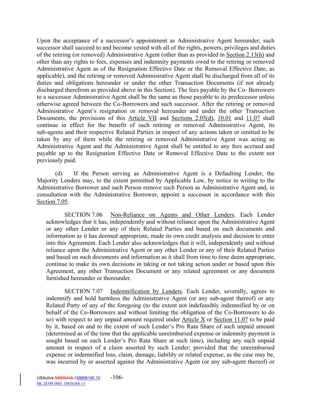 Upon the acceptance of a successor’s appointment as Administrative Agent hereunder, such successor shall succeed to and become vested with all of the rights, powers, privileges and duties of the retiring (or removed) Administrative Agent (other than as provided in Section 2.13(h) and other than any rights to fees, expenses and indemnity payments owed to the retiring or removed Administrative Agent as of the Resignation Effective Date or the Removal Effective Date, as applicable), and the retiring or removed Administrative Agent shall be discharged from all of its duties and obligations hereunder or under the other Transaction Documents (if not already discharged therefrom as provided above in this Section). The fees payable by the Co‐ Borrowers to a successor Administrative Agent shall be the same as those payable to its predecessor unless otherwise agreed between the Co‐Borrowers and such successor. After the retiring or removed Administrative Agent’s resignation or removal hereunder and under the other Transaction Documents, the provisions of this Article VII and Sections 2.05(d), 10.01 and 11.07 shall continue in effect for the benefit of such retiring or removed Administrative Agent, its sub‐agents and their respective Related Parties in respect of any actions taken or omitted to be taken by any of them while the retiring or removed Administrative Agent was acting as Administrative Agent and the Administrative Agent shall be entitled to any fees accrued and payable up to the Resignation Effective Date or Removal Effective Date to the extent not previously paid. (d) If the Person serving as Administrative Agent is a Defaulting Lender, the Majority Lenders may, to the extent permitted by Applicable Law, by notice in writing to the Administrative Borrower and such Person remove such Person as Administrative Agent and, in consultation with the Administrative Borrower, appoint a successor in accordance with this Section 7.05. SECTION 7.06 Non‐Reliance on Agents and Other Lenders. Each Lender acknowledges that it has, independently and without reliance upon the Administrative Agent or any other Lender or any of their Related Parties and based on such documents and information as it has deemed appropriate, made its own credit analysis and decision to enter into this Agreement. Each Lender also acknowledges that it will, independently and without reliance upon the Administrative Agent or any other Lender or any of their Related Parties and based on such documents and information as it shall from time to time deem appropriate, continue to make its own decisions in taking or not taking action under or based upon this Agreement, any other Transaction Document or any related agreement or any document furnished hereunder or thereunder. SECTION 7.07 Indemnification by Lenders. Each Lender, severally, agrees to indemnify and hold harmless the Administrative Agent (or any sub‐agent thereof) or any Related Party of any of the foregoing (to the extent not indefeasibly indemnified by or on behalf of the Co‐Borrowers and without limiting the obligation of the Co‐Borrowers to do so) with respect to any unpaid amount required under Article X or Section 11.07 to be paid by it, based on and to the extent of such Lender’s Pro Rata Share of such unpaid amount (determined as of the time that the applicable unreimbursed expense or indemnity payment is sought based on each Lender’s Pro Rata Share at such time), including any such unpaid amount in respect of a claim asserted by such Lender; provided that the unreimbursed expense or indemnified loss, claim, damage, liability or related expense, as the case may be, was incurred by or asserted against the Administrative Agent (or any sub‐agent thereof) or USActive 58800445.158806140.10 -106- SK 28388 0001 10656366 v3
