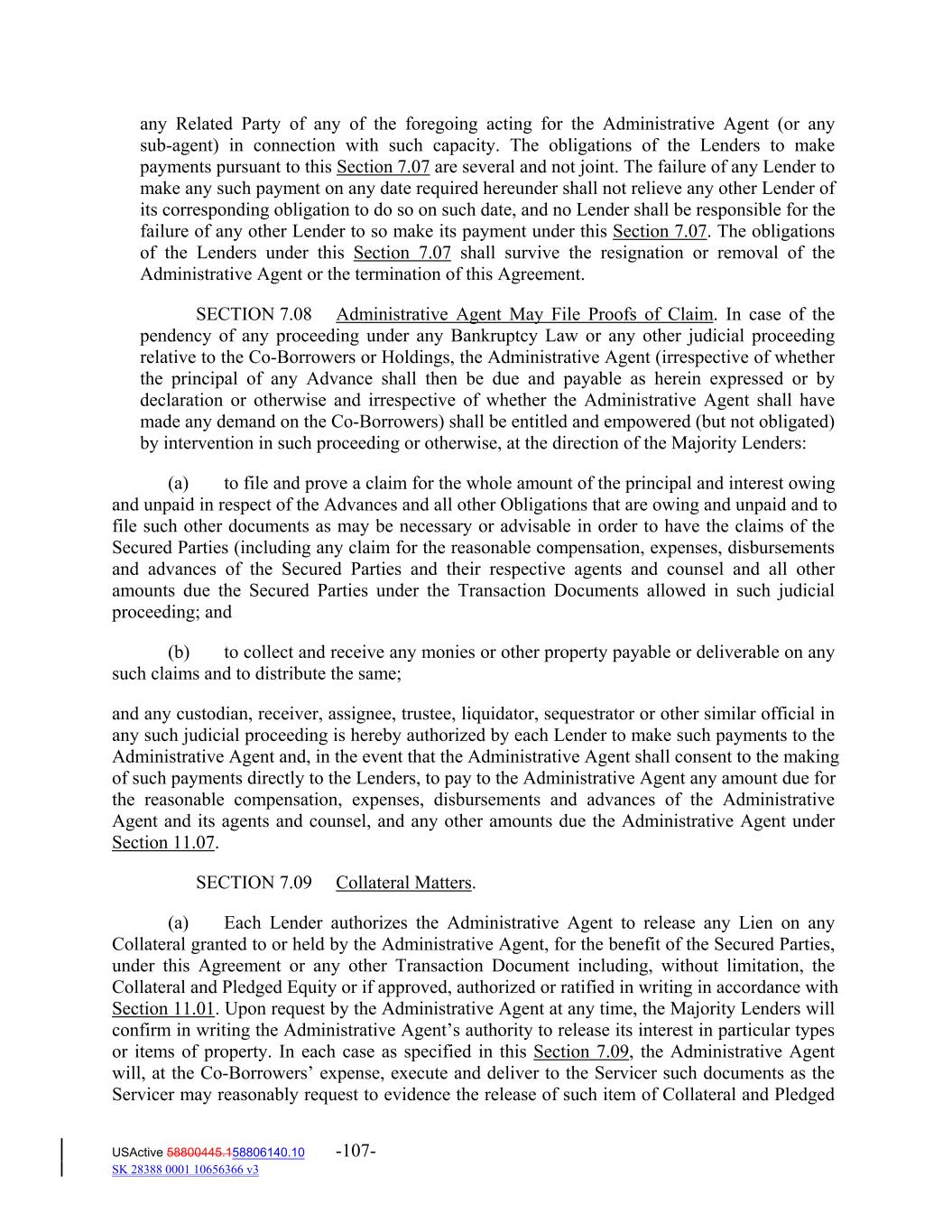 any Related Party of any of the foregoing acting for the Administrative Agent (or any sub‐agent) in connection with such capacity. The obligations of the Lenders to make payments pursuant to this Section 7.07 are several and not joint. The failure of any Lender to make any such payment on any date required hereunder shall not relieve any other Lender of its corresponding obligation to do so on such date, and no Lender shall be responsible for the failure of any other Lender to so make its payment under this Section 7.07. The obligations of the Lenders under this Section 7.07 shall survive the resignation or removal of the Administrative Agent or the termination of this Agreement. SECTION 7.08 Administrative Agent May File Proofs of Claim. In case of the pendency of any proceeding under any Bankruptcy Law or any other judicial proceeding relative to the Co‐Borrowers or Holdings, the Administrative Agent (irrespective of whether the principal of any Advance shall then be due and payable as herein expressed or by declaration or otherwise and irrespective of whether the Administrative Agent shall have made any demand on the Co‐Borrowers) shall be entitled and empowered (but not obligated) by intervention in such proceeding or otherwise, at the direction of the Majority Lenders: (a) to file and prove a claim for the whole amount of the principal and interest owing and unpaid in respect of the Advances and all other Obligations that are owing and unpaid and to file such other documents as may be necessary or advisable in order to have the claims of the Secured Parties (including any claim for the reasonable compensation, expenses, disbursements and advances of the Secured Parties and their respective agents and counsel and all other amounts due the Secured Parties under the Transaction Documents allowed in such judicial proceeding; and (b) to collect and receive any monies or other property payable or deliverable on any such claims and to distribute the same; and any custodian, receiver, assignee, trustee, liquidator, sequestrator or other similar official in any such judicial proceeding is hereby authorized by each Lender to make such payments to the Administrative Agent and, in the event that the Administrative Agent shall consent to the making of such payments directly to the Lenders, to pay to the Administrative Agent any amount due for the reasonable compensation, expenses, disbursements and advances of the Administrative Agent and its agents and counsel, and any other amounts due the Administrative Agent under Section 11.07. SECTION 7.09 Collateral Matters. (a) Each Lender authorizes the Administrative Agent to release any Lien on any Collateral granted to or held by the Administrative Agent, for the benefit of the Secured Parties, under this Agreement or any other Transaction Document including, without limitation, the Collateral and Pledged Equity or if approved, authorized or ratified in writing in accordance with Section 11.01. Upon request by the Administrative Agent at any time, the Majority Lenders will confirm in writing the Administrative Agent’s authority to release its interest in particular types or items of property. In each case as specified in this Section 7.09, the Administrative Agent will, at the Co‐Borrowers’ expense, execute and deliver to the Servicer such documents as the Servicer may reasonably request to evidence the release of such item of Collateral and Pledged USActive 58800445.158806140.10 -107- SK 28388 0001 10656366 v3