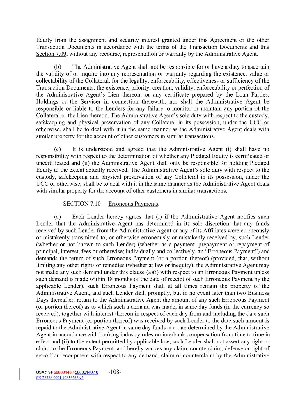 Equity from the assignment and security interest granted under this Agreement or the other Transaction Documents in accordance with the terms of the Transaction Documents and this Section 7.09, without any recourse, representation or warranty by the Administrative Agent. (b) The Administrative Agent shall not be responsible for or have a duty to ascertain the validity of or inquire into any representation or warranty regarding the existence, value or collectability of the Collateral, for the legality, enforceability, effectiveness or sufficiency of the Transaction Documents, the existence, priority, creation, validity, enforceability or perfection of the Administrative Agent’s Lien thereon, or any certificate prepared by the Loan Parties, Holdings or the Servicer in connection therewith, nor shall the Administrative Agent be responsible or liable to the Lenders for any failure to monitor or maintain any portion of the Collateral or the Lien thereon. The Administrative Agent’s sole duty with respect to the custody, safekeeping and physical preservation of any Collateral in its possession, under the UCC or otherwise, shall be to deal with it in the same manner as the Administrative Agent deals with similar property for the account of other customers in similar transactions. (c) It is understood and agreed that the Administrative Agent (i) shall have no responsibility with respect to the determination of whether any Pledged Equity is certificated or uncertificated and (ii) the Administrative Agent shall only be responsible for holding Pledged Equity to the extent actually received. The Administrative Agent’s sole duty with respect to the custody, safekeeping and physical preservation of any Collateral in its possession, under the UCC or otherwise, shall be to deal with it in the same manner as the Administrative Agent deals with similar property for the account of other customers in similar transactions. SECTION 7.10 Erroneous Payments. (a) Each Lender hereby agrees that (i) if the Administrative Agent notifies such Lender that the Administrative Agent has determined in its sole discretion that any funds received by such Lender from the Administrative Agent or any of its Affiliates were erroneously or mistakenly transmitted to, or otherwise erroneously or mistakenly received by, such Lender (whether or not known to such Lender) (whether as a payment, prepayment or repayment of principal, interest, fees or otherwise; individually and collectively, an “Erroneous Payment”) and demands the return of such Erroneous Payment (or a portion thereof) (provided, that, without limiting any other rights or remedies (whether at law or inequity), the Administrative Agent may not make any such demand under this clause (a)(i) with respect to an Erroneous Payment unless such demand is made within 18 months of the date of receipt of such Erroneous Payment by the applicable Lender), such Erroneous Payment shall at all times remain the property of the Administrative Agent, and such Lender shall promptly, but in no event later than two Business Days thereafter, return to the Administrative Agent the amount of any such Erroneous Payment (or portion thereof) as to which such a demand was made, in same day funds (in the currency so received), together with interest thereon in respect of each day from and including the date such Erroneous Payment (or portion thereof) was received by such Lender to the date such amount is repaid to the Administrative Agent in same day funds at a rate determined by the Administrative Agent in accordance with banking industry rules on interbank compensation from time to time in effect and (ii) to the extent permitted by applicable law, such Lender shall not assert any right or claim to the Erroneous Payment, and hereby waives any claim, counterclaim, defense or right of set‐off or recoupment with respect to any demand, claim or counterclaim by the Administrative USActive 58800445.158806140.10 -108- SK 28388 0001 10656366 v3