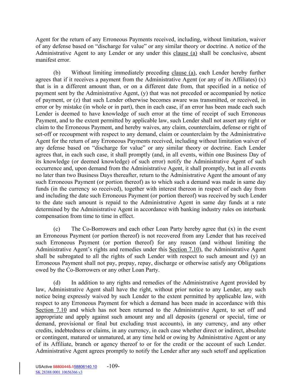 Agent for the return of any Erroneous Payments received, including, without limitation, waiver of any defense based on “discharge for value” or any similar theory or doctrine. A notice of the Administrative Agent to any Lender or any under this clause (a) shall be conclusive, absent manifest error. (b) Without limiting immediately preceding clause (a), each Lender hereby further agrees that if it receives a payment from the Administrative Agent (or any of its Affiliates) (x) that is in a different amount than, or on a different date from, that specified in a notice of payment sent by the Administrative Agent, (y) that was not preceded or accompanied by notice of payment, or (z) that such Lender otherwise becomes aware was transmitted, or received, in error or by mistake (in whole or in part), then in each case, if an error has been made each such Lender is deemed to have knowledge of such error at the time of receipt of such Erroneous Payment, and to the extent permitted by applicable law, such Lender shall not assert any right or claim to the Erroneous Payment, and hereby waives, any claim, counterclaim, defense or right of set‐off or recoupment with respect to any demand, claim or counterclaim by the Administrative Agent for the return of any Erroneous Payments received, including without limitation waiver of any defense based on “discharge for value” or any similar theory or doctrine. Each Lender agrees that, in each such case, it shall promptly (and, in all events, within one Business Day of its knowledge (or deemed knowledge) of such error) notify the Administrative Agent of such occurrence and, upon demand from the Administrative Agent, it shall promptly, but in all events no later than two Business Days thereafter, return to the Administrative Agent the amount of any such Erroneous Payment (or portion thereof) as to which such a demand was made in same day funds (in the currency so received), together with interest thereon in respect of each day from and including the date such Erroneous Payment (or portion thereof) was received by such Lender to the date such amount is repaid to the Administrative Agent in same day funds at a rate determined by the Administrative Agent in accordance with banking industry rules on interbank compensation from time to time in effect. (c) The Co‐Borrowers and each other Loan Party hereby agree that (x) in the event an Erroneous Payment (or portion thereof) is not recovered from any Lender that has received such Erroneous Payment (or portion thereof) for any reason (and without limiting the Administrative Agent’s rights and remedies under this Section 7.10), the Administrative Agent shall be subrogated to all the rights of such Lender with respect to such amount and (y) an Erroneous Payment shall not pay, prepay, repay, discharge or otherwise satisfy any Obligations owed by the Co‐Borrowers or any other Loan Party. (d) In addition to any rights and remedies of the Administrative Agent provided by law, Administrative Agent shall have the right, without prior notice to any Lender, any such notice being expressly waived by such Lender to the extent permitted by applicable law, with respect to any Erroneous Payment for which a demand has been made in accordance with this Section 7.10 and which has not been returned to the Administrative Agent, to set off and appropriate and apply against such amount any and all deposits (general or special, time or demand, provisional or final but excluding trust accounts), in any currency, and any other credits, indebtedness or claims, in any currency, in each case whether direct or indirect, absolute or contingent, matured or unmatured, at any time held or owing by Administrative Agent or any of its Affiliate, branch or agency thereof to or for the credit or the account of such Lender. Administrative Agent agrees promptly to notify the Lender after any such setoff and application USActive 58800445.158806140.10 -109- SK 28388 0001 10656366 v3