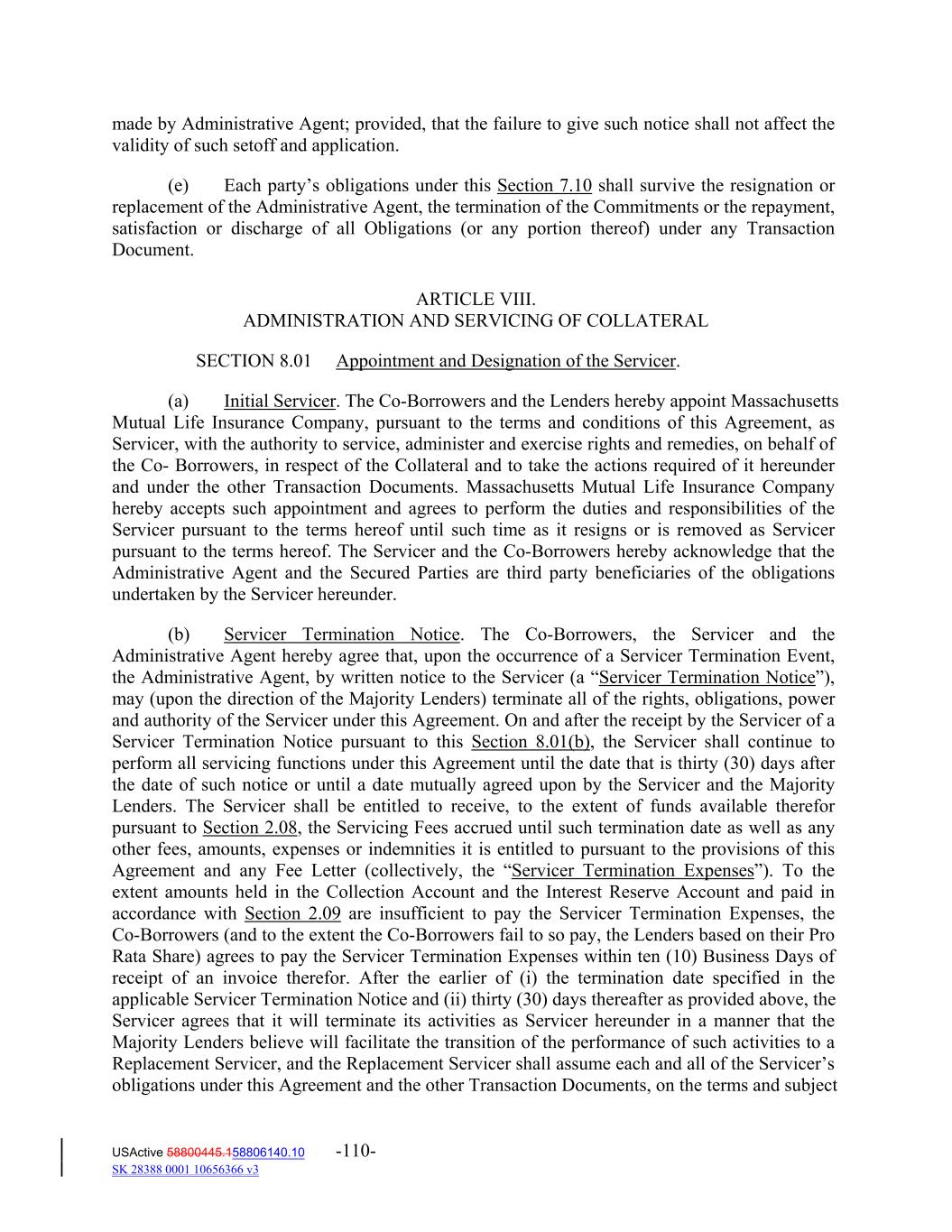 made by Administrative Agent; provided, that the failure to give such notice shall not affect the validity of such setoff and application. (e) Each party’s obligations under this Section 7.10 shall survive the resignation or replacement of the Administrative Agent, the termination of the Commitments or the repayment, satisfaction or discharge of all Obligations (or any portion thereof) under any Transaction Document. ARTICLE VIII. ADMINISTRATION AND SERVICING OF COLLATERAL SECTION 8.01 Appointment and Designation of the Servicer. (a) Initial Servicer. The Co‐Borrowers and the Lenders hereby appoint Massachusetts Mutual Life Insurance Company, pursuant to the terms and conditions of this Agreement, as Servicer, with the authority to service, administer and exercise rights and remedies, on behalf of the Co‐ Borrowers, in respect of the Collateral and to take the actions required of it hereunder and under the other Transaction Documents. Massachusetts Mutual Life Insurance Company hereby accepts such appointment and agrees to perform the duties and responsibilities of the Servicer pursuant to the terms hereof until such time as it resigns or is removed as Servicer pursuant to the terms hereof. The Servicer and the Co‐Borrowers hereby acknowledge that the Administrative Agent and the Secured Parties are third party beneficiaries of the obligations undertaken by the Servicer hereunder. (b) Servicer Termination Notice. The Co‐Borrowers, the Servicer and the Administrative Agent hereby agree that, upon the occurrence of a Servicer Termination Event, the Administrative Agent, by written notice to the Servicer (a “Servicer Termination Notice”), may (upon the direction of the Majority Lenders) terminate all of the rights, obligations, power and authority of the Servicer under this Agreement. On and after the receipt by the Servicer of a Servicer Termination Notice pursuant to this Section 8.01(b), the Servicer shall continue to perform all servicing functions under this Agreement until the date that is thirty (30) days after the date of such notice or until a date mutually agreed upon by the Servicer and the Majority Lenders. The Servicer shall be entitled to receive, to the extent of funds available therefor pursuant to Section 2.08, the Servicing Fees accrued until such termination date as well as any other fees, amounts, expenses or indemnities it is entitled to pursuant to the provisions of this Agreement and any Fee Letter (collectively, the “Servicer Termination Expenses”). To the extent amounts held in the Collection Account and the Interest Reserve Account and paid in accordance with Section 2.09 are insufficient to pay the Servicer Termination Expenses, the Co‐Borrowers (and to the extent the Co‐Borrowers fail to so pay, the Lenders based on their Pro Rata Share) agrees to pay the Servicer Termination Expenses within ten (10) Business Days of receipt of an invoice therefor. After the earlier of (i) the termination date specified in the applicable Servicer Termination Notice and (ii) thirty (30) days thereafter as provided above, the Servicer agrees that it will terminate its activities as Servicer hereunder in a manner that the Majority Lenders believe will facilitate the transition of the performance of such activities to a Replacement Servicer, and the Replacement Servicer shall assume each and all of the Servicer’s obligations under this Agreement and the other Transaction Documents, on the terms and subject USActive 58800445.158806140.10 -110- SK 28388 0001 10656366 v3