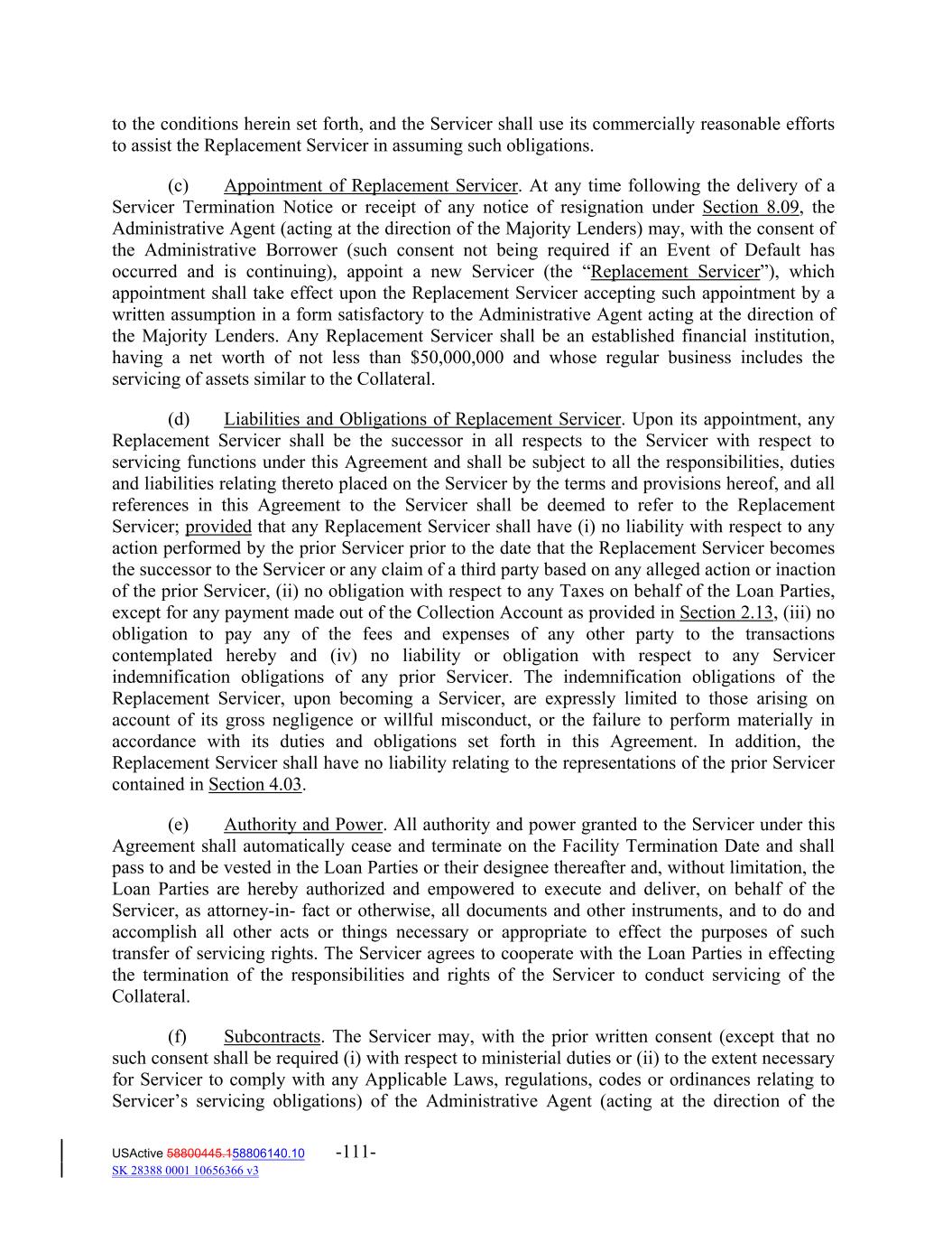 to the conditions herein set forth, and the Servicer shall use its commercially reasonable efforts to assist the Replacement Servicer in assuming such obligations. (c) Appointment of Replacement Servicer. At any time following the delivery of a Servicer Termination Notice or receipt of any notice of resignation under Section 8.09, the Administrative Agent (acting at the direction of the Majority Lenders) may, with the consent of the Administrative Borrower (such consent not being required if an Event of Default has occurred and is continuing), appoint a new Servicer (the “Replacement Servicer”), which appointment shall take effect upon the Replacement Servicer accepting such appointment by a written assumption in a form satisfactory to the Administrative Agent acting at the direction of the Majority Lenders. Any Replacement Servicer shall be an established financial institution, having a net worth of not less than $50,000,000 and whose regular business includes the servicing of assets similar to the Collateral. (d) Liabilities and Obligations of Replacement Servicer. Upon its appointment, any Replacement Servicer shall be the successor in all respects to the Servicer with respect to servicing functions under this Agreement and shall be subject to all the responsibilities, duties and liabilities relating thereto placed on the Servicer by the terms and provisions hereof, and all references in this Agreement to the Servicer shall be deemed to refer to the Replacement Servicer; provided that any Replacement Servicer shall have (i) no liability with respect to any action performed by the prior Servicer prior to the date that the Replacement Servicer becomes the successor to the Servicer or any claim of a third party based on any alleged action or inaction of the prior Servicer, (ii) no obligation with respect to any Taxes on behalf of the Loan Parties, except for any payment made out of the Collection Account as provided in Section 2.13, (iii) no obligation to pay any of the fees and expenses of any other party to the transactions contemplated hereby and (iv) no liability or obligation with respect to any Servicer indemnification obligations of any prior Servicer. The indemnification obligations of the Replacement Servicer, upon becoming a Servicer, are expressly limited to those arising on account of its gross negligence or willful misconduct, or the failure to perform materially in accordance with its duties and obligations set forth in this Agreement. In addition, the Replacement Servicer shall have no liability relating to the representations of the prior Servicer contained in Section 4.03. (e) Authority and Power. All authority and power granted to the Servicer under this Agreement shall automatically cease and terminate on the Facility Termination Date and shall pass to and be vested in the Loan Parties or their designee thereafter and, without limitation, the Loan Parties are hereby authorized and empowered to execute and deliver, on behalf of the Servicer, as attorney‐in‐ fact or otherwise, all documents and other instruments, and to do and accomplish all other acts or things necessary or appropriate to effect the purposes of such transfer of servicing rights. The Servicer agrees to cooperate with the Loan Parties in effecting the termination of the responsibilities and rights of the Servicer to conduct servicing of the Collateral. (f) Subcontracts. The Servicer may, with the prior written consent (except that no such consent shall be required (i) with respect to ministerial duties or (ii) to the extent necessary for Servicer to comply with any Applicable Laws, regulations, codes or ordinances relating to Servicer’s servicing obligations) of the Administrative Agent (acting at the direction of the USActive 58800445.158806140.10 -111- SK 28388 0001 10656366 v3