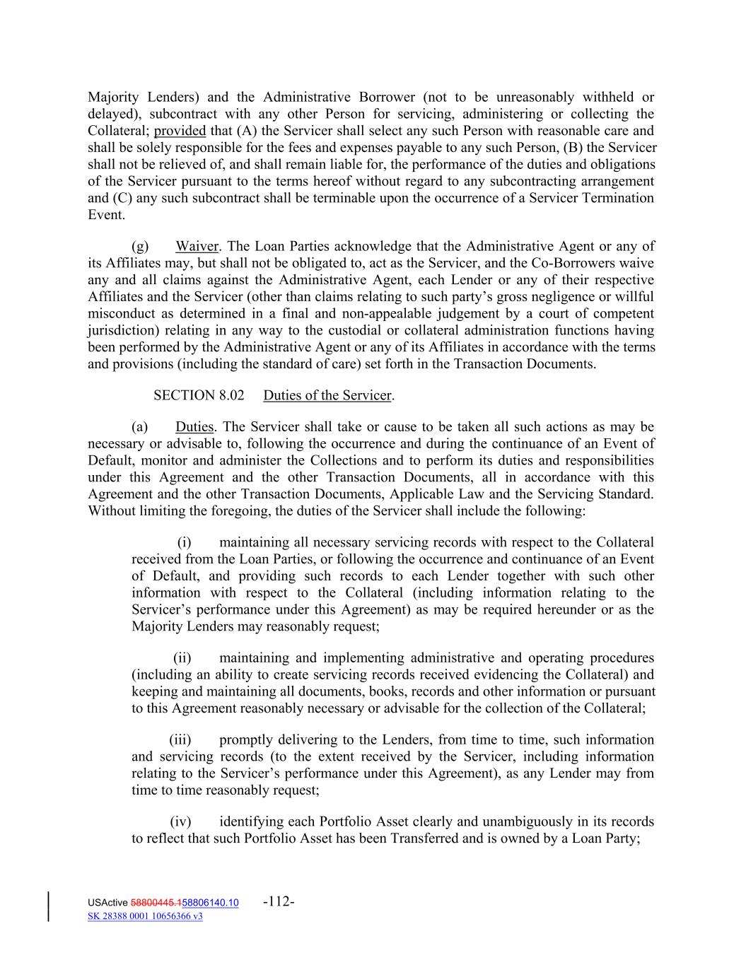 Majority Lenders) and the Administrative Borrower (not to be unreasonably withheld or delayed), subcontract with any other Person for servicing, administering or collecting the Collateral; provided that (A) the Servicer shall select any such Person with reasonable care and shall be solely responsible for the fees and expenses payable to any such Person, (B) the Servicer shall not be relieved of, and shall remain liable for, the performance of the duties and obligations of the Servicer pursuant to the terms hereof without regard to any subcontracting arrangement and (C) any such subcontract shall be terminable upon the occurrence of a Servicer Termination Event. (g) Waiver. The Loan Parties acknowledge that the Administrative Agent or any of its Affiliates may, but shall not be obligated to, act as the Servicer, and the Co‐Borrowers waive any and all claims against the Administrative Agent, each Lender or any of their respective Affiliates and the Servicer (other than claims relating to such party’s gross negligence or willful misconduct as determined in a final and non‐appealable judgement by a court of competent jurisdiction) relating in any way to the custodial or collateral administration functions having been performed by the Administrative Agent or any of its Affiliates in accordance with the terms and provisions (including the standard of care) set forth in the Transaction Documents. SECTION 8.02 Duties of the Servicer. (a) Duties. The Servicer shall take or cause to be taken all such actions as may be necessary or advisable to, following the occurrence and during the continuance of an Event of Default, monitor and administer the Collections and to perform its duties and responsibilities under this Agreement and the other Transaction Documents, all in accordance with this Agreement and the other Transaction Documents, Applicable Law and the Servicing Standard. Without limiting the foregoing, the duties of the Servicer shall include the following: (i) maintaining all necessary servicing records with respect to the Collateral received from the Loan Parties, or following the occurrence and continuance of an Event of Default, and providing such records to each Lender together with such other information with respect to the Collateral (including information relating to the Servicer’s performance under this Agreement) as may be required hereunder or as the Majority Lenders may reasonably request; (ii) maintaining and implementing administrative and operating procedures (including an ability to create servicing records received evidencing the Collateral) and keeping and maintaining all documents, books, records and other information or pursuant to this Agreement reasonably necessary or advisable for the collection of the Collateral; (iii) promptly delivering to the Lenders, from time to time, such information and servicing records (to the extent received by the Servicer, including information relating to the Servicer’s performance under this Agreement), as any Lender may from time to time reasonably request; (iv) identifying each Portfolio Asset clearly and unambiguously in its records to reflect that such Portfolio Asset has been Transferred and is owned by a Loan Party; USActive 58800445.158806140.10 -112- SK 28388 0001 10656366 v3