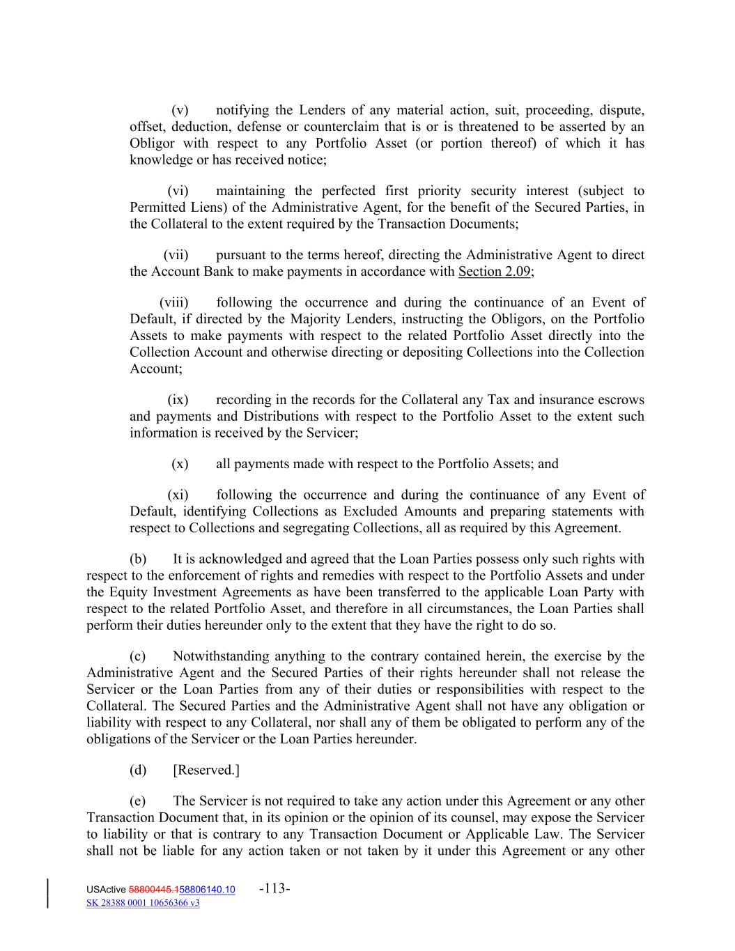 (v) notifying the Lenders of any material action, suit, proceeding, dispute, offset, deduction, defense or counterclaim that is or is threatened to be asserted by an Obligor with respect to any Portfolio Asset (or portion thereof) of which it has knowledge or has received notice; (vi) maintaining the perfected first priority security interest (subject to Permitted Liens) of the Administrative Agent, for the benefit of the Secured Parties, in the Collateral to the extent required by the Transaction Documents; (vii) pursuant to the terms hereof, directing the Administrative Agent to direct the Account Bank to make payments in accordance with Section 2.09; (viii) following the occurrence and during the continuance of an Event of Default, if directed by the Majority Lenders, instructing the Obligors, on the Portfolio Assets to make payments with respect to the related Portfolio Asset directly into the Collection Account and otherwise directing or depositing Collections into the Collection Account; (ix) recording in the records for the Collateral any Tax and insurance escrows and payments and Distributions with respect to the Portfolio Asset to the extent such information is received by the Servicer; (x) all payments made with respect to the Portfolio Assets; and (xi) following the occurrence and during the continuance of any Event of Default, identifying Collections as Excluded Amounts and preparing statements with respect to Collections and segregating Collections, all as required by this Agreement. (b) It is acknowledged and agreed that the Loan Parties possess only such rights with respect to the enforcement of rights and remedies with respect to the Portfolio Assets and under the Equity Investment Agreements as have been transferred to the applicable Loan Party with respect to the related Portfolio Asset, and therefore in all circumstances, the Loan Parties shall perform their duties hereunder only to the extent that they have the right to do so. (c) Notwithstanding anything to the contrary contained herein, the exercise by the Administrative Agent and the Secured Parties of their rights hereunder shall not release the Servicer or the Loan Parties from any of their duties or responsibilities with respect to the Collateral. The Secured Parties and the Administrative Agent shall not have any obligation or liability with respect to any Collateral, nor shall any of them be obligated to perform any of the obligations of the Servicer or the Loan Parties hereunder. (d) [Reserved.] (e) The Servicer is not required to take any action under this Agreement or any other Transaction Document that, in its opinion or the opinion of its counsel, may expose the Servicer to liability or that is contrary to any Transaction Document or Applicable Law. The Servicer shall not be liable for any action taken or not taken by it under this Agreement or any other USActive 58800445.158806140.10 -113- SK 28388 0001 10656366 v3