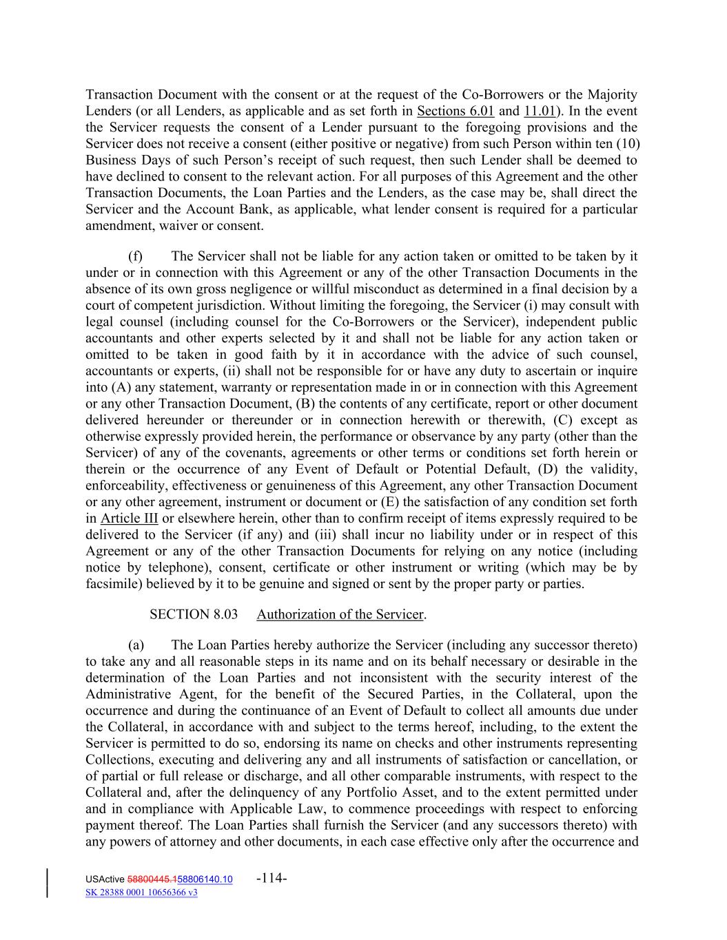 Transaction Document with the consent or at the request of the Co‐Borrowers or the Majority Lenders (or all Lenders, as applicable and as set forth in Sections 6.01 and 11.01). In the event the Servicer requests the consent of a Lender pursuant to the foregoing provisions and the Servicer does not receive a consent (either positive or negative) from such Person within ten (10) Business Days of such Person’s receipt of such request, then such Lender shall be deemed to have declined to consent to the relevant action. For all purposes of this Agreement and the other Transaction Documents, the Loan Parties and the Lenders, as the case may be, shall direct the Servicer and the Account Bank, as applicable, what lender consent is required for a particular amendment, waiver or consent. (f) The Servicer shall not be liable for any action taken or omitted to be taken by it under or in connection with this Agreement or any of the other Transaction Documents in the absence of its own gross negligence or willful misconduct as determined in a final decision by a court of competent jurisdiction. Without limiting the foregoing, the Servicer (i) may consult with legal counsel (including counsel for the Co‐Borrowers or the Servicer), independent public accountants and other experts selected by it and shall not be liable for any action taken or omitted to be taken in good faith by it in accordance with the advice of such counsel, accountants or experts, (ii) shall not be responsible for or have any duty to ascertain or inquire into (A) any statement, warranty or representation made in or in connection with this Agreement or any other Transaction Document, (B) the contents of any certificate, report or other document delivered hereunder or thereunder or in connection herewith or therewith, (C) except as otherwise expressly provided herein, the performance or observance by any party (other than the Servicer) of any of the covenants, agreements or other terms or conditions set forth herein or therein or the occurrence of any Event of Default or Potential Default, (D) the validity, enforceability, effectiveness or genuineness of this Agreement, any other Transaction Document or any other agreement, instrument or document or (E) the satisfaction of any condition set forth in Article III or elsewhere herein, other than to confirm receipt of items expressly required to be delivered to the Servicer (if any) and (iii) shall incur no liability under or in respect of this Agreement or any of the other Transaction Documents for relying on any notice (including notice by telephone), consent, certificate or other instrument or writing (which may be by facsimile) believed by it to be genuine and signed or sent by the proper party or parties. SECTION 8.03 Authorization of the Servicer. (a) The Loan Parties hereby authorize the Servicer (including any successor thereto) to take any and all reasonable steps in its name and on its behalf necessary or desirable in the determination of the Loan Parties and not inconsistent with the security interest of the Administrative Agent, for the benefit of the Secured Parties, in the Collateral, upon the occurrence and during the continuance of an Event of Default to collect all amounts due under the Collateral, in accordance with and subject to the terms hereof, including, to the extent the Servicer is permitted to do so, endorsing its name on checks and other instruments representing Collections, executing and delivering any and all instruments of satisfaction or cancellation, or of partial or full release or discharge, and all other comparable instruments, with respect to the Collateral and, after the delinquency of any Portfolio Asset, and to the extent permitted under and in compliance with Applicable Law, to commence proceedings with respect to enforcing payment thereof. The Loan Parties shall furnish the Servicer (and any successors thereto) with any powers of attorney and other documents, in each case effective only after the occurrence and USActive 58800445.158806140.10 -114- SK 28388 0001 10656366 v3