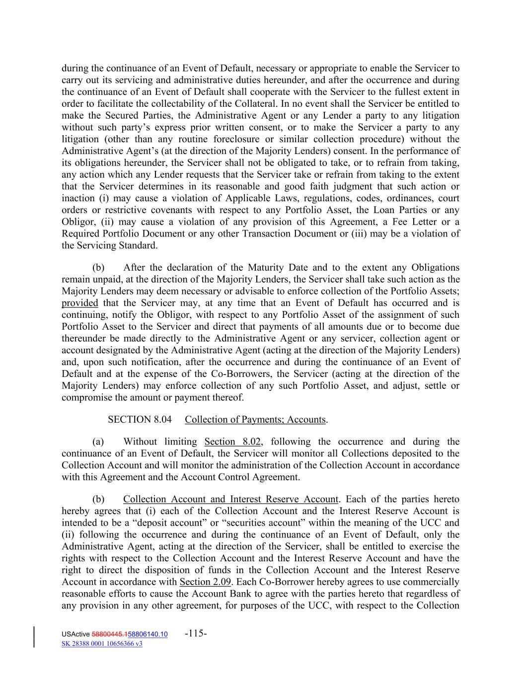during the continuance of an Event of Default, necessary or appropriate to enable the Servicer to carry out its servicing and administrative duties hereunder, and after the occurrence and during the continuance of an Event of Default shall cooperate with the Servicer to the fullest extent in order to facilitate the collectability of the Collateral. In no event shall the Servicer be entitled to make the Secured Parties, the Administrative Agent or any Lender a party to any litigation without such party’s express prior written consent, or to make the Servicer a party to any litigation (other than any routine foreclosure or similar collection procedure) without the Administrative Agent’s (at the direction of the Majority Lenders) consent. In the performance of its obligations hereunder, the Servicer shall not be obligated to take, or to refrain from taking, any action which any Lender requests that the Servicer take or refrain from taking to the extent that the Servicer determines in its reasonable and good faith judgment that such action or inaction (i) may cause a violation of Applicable Laws, regulations, codes, ordinances, court orders or restrictive covenants with respect to any Portfolio Asset, the Loan Parties or any Obligor, (ii) may cause a violation of any provision of this Agreement, a Fee Letter or a Required Portfolio Document or any other Transaction Document or (iii) may be a violation of the Servicing Standard. (b) After the declaration of the Maturity Date and to the extent any Obligations remain unpaid, at the direction of the Majority Lenders, the Servicer shall take such action as the Majority Lenders may deem necessary or advisable to enforce collection of the Portfolio Assets; provided that the Servicer may, at any time that an Event of Default has occurred and is continuing, notify the Obligor, with respect to any Portfolio Asset of the assignment of such Portfolio Asset to the Servicer and direct that payments of all amounts due or to become due thereunder be made directly to the Administrative Agent or any servicer, collection agent or account designated by the Administrative Agent (acting at the direction of the Majority Lenders) and, upon such notification, after the occurrence and during the continuance of an Event of Default and at the expense of the Co‐Borrowers, the Servicer (acting at the direction of the Majority Lenders) may enforce collection of any such Portfolio Asset, and adjust, settle or compromise the amount or payment thereof. SECTION 8.04 Collection of Payments; Accounts. (a) Without limiting Section 8.02, following the occurrence and during the continuance of an Event of Default, the Servicer will monitor all Collections deposited to the Collection Account and will monitor the administration of the Collection Account in accordance with this Agreement and the Account Control Agreement. (b) Collection Account and Interest Reserve Account. Each of the parties hereto hereby agrees that (i) each of the Collection Account and the Interest Reserve Account is intended to be a “deposit account” or “securities account” within the meaning of the UCC and (ii) following the occurrence and during the continuance of an Event of Default, only the Administrative Agent, acting at the direction of the Servicer, shall be entitled to exercise the rights with respect to the Collection Account and the Interest Reserve Account and have the right to direct the disposition of funds in the Collection Account and the Interest Reserve Account in accordance with Section 2.09. Each Co‐Borrower hereby agrees to use commercially reasonable efforts to cause the Account Bank to agree with the parties hereto that regardless of any provision in any other agreement, for purposes of the UCC, with respect to the Collection USActive 58800445.158806140.10 -115- SK 28388 0001 10656366 v3