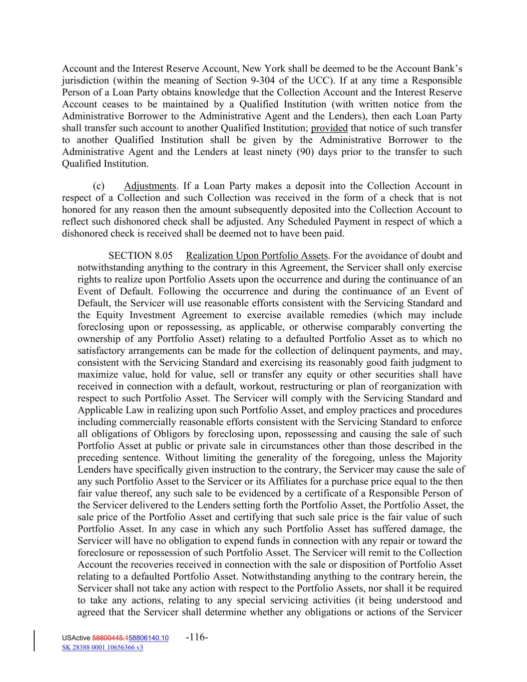 Account and the Interest Reserve Account, New York shall be deemed to be the Account Bank’s jurisdiction (within the meaning of Section 9‐304 of the UCC). If at any time a Responsible Person of a Loan Party obtains knowledge that the Collection Account and the Interest Reserve Account ceases to be maintained by a Qualified Institution (with written notice from the Administrative Borrower to the Administrative Agent and the Lenders), then each Loan Party shall transfer such account to another Qualified Institution; provided that notice of such transfer to another Qualified Institution shall be given by the Administrative Borrower to the Administrative Agent and the Lenders at least ninety (90) days prior to the transfer to such Qualified Institution. (c) Adjustments. If a Loan Party makes a deposit into the Collection Account in respect of a Collection and such Collection was received in the form of a check that is not honored for any reason then the amount subsequently deposited into the Collection Account to reflect such dishonored check shall be adjusted. Any Scheduled Payment in respect of which a dishonored check is received shall be deemed not to have been paid. SECTION 8.05 Realization Upon Portfolio Assets. For the avoidance of doubt and notwithstanding anything to the contrary in this Agreement, the Servicer shall only exercise rights to realize upon Portfolio Assets upon the occurrence and during the continuance of an Event of Default. Following the occurrence and during the continuance of an Event of Default, the Servicer will use reasonable efforts consistent with the Servicing Standard and the Equity Investment Agreement to exercise available remedies (which may include foreclosing upon or repossessing, as applicable, or otherwise comparably converting the ownership of any Portfolio Asset) relating to a defaulted Portfolio Asset as to which no satisfactory arrangements can be made for the collection of delinquent payments, and may, consistent with the Servicing Standard and exercising its reasonably good faith judgment to maximize value, hold for value, sell or transfer any equity or other securities shall have received in connection with a default, workout, restructuring or plan of reorganization with respect to such Portfolio Asset. The Servicer will comply with the Servicing Standard and Applicable Law in realizing upon such Portfolio Asset, and employ practices and procedures including commercially reasonable efforts consistent with the Servicing Standard to enforce all obligations of Obligors by foreclosing upon, repossessing and causing the sale of such Portfolio Asset at public or private sale in circumstances other than those described in the preceding sentence. Without limiting the generality of the foregoing, unless the Majority Lenders have specifically given instruction to the contrary, the Servicer may cause the sale of any such Portfolio Asset to the Servicer or its Affiliates for a purchase price equal to the then fair value thereof, any such sale to be evidenced by a certificate of a Responsible Person of the Servicer delivered to the Lenders setting forth the Portfolio Asset, the Portfolio Asset, the sale price of the Portfolio Asset and certifying that such sale price is the fair value of such Portfolio Asset. In any case in which any such Portfolio Asset has suffered damage, the Servicer will have no obligation to expend funds in connection with any repair or toward the foreclosure or repossession of such Portfolio Asset. The Servicer will remit to the Collection Account the recoveries received in connection with the sale or disposition of Portfolio Asset relating to a defaulted Portfolio Asset. Notwithstanding anything to the contrary herein, the Servicer shall not take any action with respect to the Portfolio Assets, nor shall it be required to take any actions, relating to any special servicing activities (it being understood and agreed that the Servicer shall determine whether any obligations or actions of the Servicer USActive 58800445.158806140.10 -116- SK 28388 0001 10656366 v3
