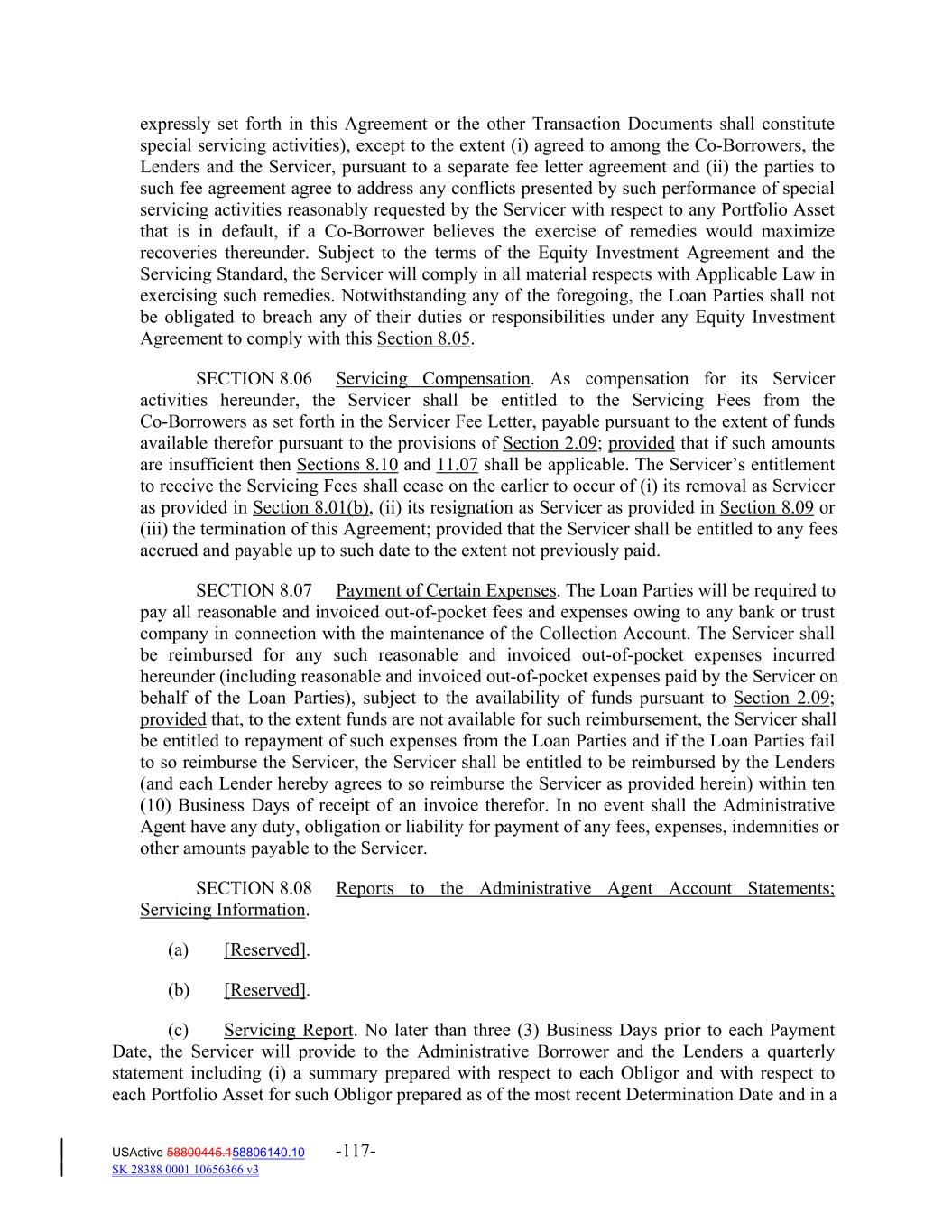 expressly set forth in this Agreement or the other Transaction Documents shall constitute special servicing activities), except to the extent (i) agreed to among the Co‐Borrowers, the Lenders and the Servicer, pursuant to a separate fee letter agreement and (ii) the parties to such fee agreement agree to address any conflicts presented by such performance of special servicing activities reasonably requested by the Servicer with respect to any Portfolio Asset that is in default, if a Co‐Borrower believes the exercise of remedies would maximize recoveries thereunder. Subject to the terms of the Equity Investment Agreement and the Servicing Standard, the Servicer will comply in all material respects with Applicable Law in exercising such remedies. Notwithstanding any of the foregoing, the Loan Parties shall not be obligated to breach any of their duties or responsibilities under any Equity Investment Agreement to comply with this Section 8.05. SECTION 8.06 Servicing Compensation. As compensation for its Servicer activities hereunder, the Servicer shall be entitled to the Servicing Fees from the Co‐Borrowers as set forth in the Servicer Fee Letter, payable pursuant to the extent of funds available therefor pursuant to the provisions of Section 2.09; provided that if such amounts are insufficient then Sections 8.10 and 11.07 shall be applicable. The Servicer’s entitlement to receive the Servicing Fees shall cease on the earlier to occur of (i) its removal as Servicer as provided in Section 8.01(b), (ii) its resignation as Servicer as provided in Section 8.09 or (iii) the termination of this Agreement; provided that the Servicer shall be entitled to any fees accrued and payable up to such date to the extent not previously paid. SECTION 8.07 Payment of Certain Expenses. The Loan Parties will be required to pay all reasonable and invoiced out‐of‐pocket fees and expenses owing to any bank or trust company in connection with the maintenance of the Collection Account. The Servicer shall be reimbursed for any such reasonable and invoiced out‐of‐pocket expenses incurred hereunder (including reasonable and invoiced out‐of‐pocket expenses paid by the Servicer on behalf of the Loan Parties), subject to the availability of funds pursuant to Section 2.09; provided that, to the extent funds are not available for such reimbursement, the Servicer shall be entitled to repayment of such expenses from the Loan Parties and if the Loan Parties fail to so reimburse the Servicer, the Servicer shall be entitled to be reimbursed by the Lenders (and each Lender hereby agrees to so reimburse the Servicer as provided herein) within ten (10) Business Days of receipt of an invoice therefor. In no event shall the Administrative Agent have any duty, obligation or liability for payment of any fees, expenses, indemnities or other amounts payable to the Servicer. SECTION 8.08 Reports to the Administrative Agent Account Statements; Servicing Information. (a) [Reserved]. (b) [Reserved]. (c) Servicing Report. No later than three (3) Business Days prior to each Payment Date, the Servicer will provide to the Administrative Borrower and the Lenders a quarterly statement including (i) a summary prepared with respect to each Obligor and with respect to each Portfolio Asset for such Obligor prepared as of the most recent Determination Date and in a USActive 58800445.158806140.10 -117- SK 28388 0001 10656366 v3