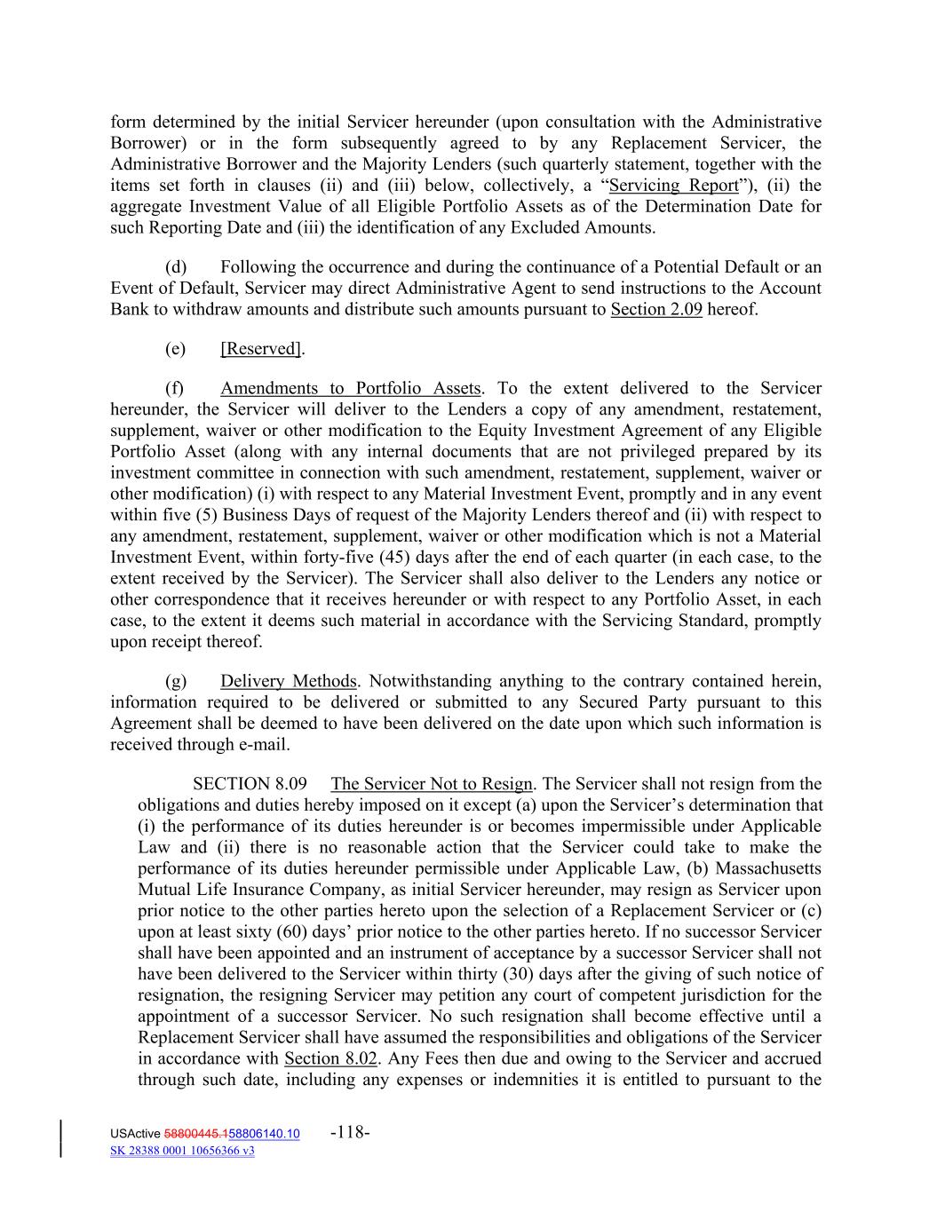 form determined by the initial Servicer hereunder (upon consultation with the Administrative Borrower) or in the form subsequently agreed to by any Replacement Servicer, the Administrative Borrower and the Majority Lenders (such quarterly statement, together with the items set forth in clauses (ii) and (iii) below, collectively, a “Servicing Report”), (ii) the aggregate Investment Value of all Eligible Portfolio Assets as of the Determination Date for such Reporting Date and (iii) the identification of any Excluded Amounts. (d) Following the occurrence and during the continuance of a Potential Default or an Event of Default, Servicer may direct Administrative Agent to send instructions to the Account Bank to withdraw amounts and distribute such amounts pursuant to Section 2.09 hereof. (e) [Reserved]. (f) Amendments to Portfolio Assets. To the extent delivered to the Servicer hereunder, the Servicer will deliver to the Lenders a copy of any amendment, restatement, supplement, waiver or other modification to the Equity Investment Agreement of any Eligible Portfolio Asset (along with any internal documents that are not privileged prepared by its investment committee in connection with such amendment, restatement, supplement, waiver or other modification) (i) with respect to any Material Investment Event, promptly and in any event within five (5) Business Days of request of the Majority Lenders thereof and (ii) with respect to any amendment, restatement, supplement, waiver or other modification which is not a Material Investment Event, within forty‐five (45) days after the end of each quarter (in each case, to the extent received by the Servicer). The Servicer shall also deliver to the Lenders any notice or other correspondence that it receives hereunder or with respect to any Portfolio Asset, in each case, to the extent it deems such material in accordance with the Servicing Standard, promptly upon receipt thereof. (g) Delivery Methods. Notwithstanding anything to the contrary contained herein, information required to be delivered or submitted to any Secured Party pursuant to this Agreement shall be deemed to have been delivered on the date upon which such information is received through e‐mail. SECTION 8.09 The Servicer Not to Resign. The Servicer shall not resign from the obligations and duties hereby imposed on it except (a) upon the Servicer’s determination that (i) the performance of its duties hereunder is or becomes impermissible under Applicable Law and (ii) there is no reasonable action that the Servicer could take to make the performance of its duties hereunder permissible under Applicable Law, (b) Massachusetts Mutual Life Insurance Company, as initial Servicer hereunder, may resign as Servicer upon prior notice to the other parties hereto upon the selection of a Replacement Servicer or (c) upon at least sixty (60) days’ prior notice to the other parties hereto. If no successor Servicer shall have been appointed and an instrument of acceptance by a successor Servicer shall not have been delivered to the Servicer within thirty (30) days after the giving of such notice of resignation, the resigning Servicer may petition any court of competent jurisdiction for the appointment of a successor Servicer. No such resignation shall become effective until a Replacement Servicer shall have assumed the responsibilities and obligations of the Servicer in accordance with Section 8.02. Any Fees then due and owing to the Servicer and accrued through such date, including any expenses or indemnities it is entitled to pursuant to the USActive 58800445.158806140.10 -118- SK 28388 0001 10656366 v3