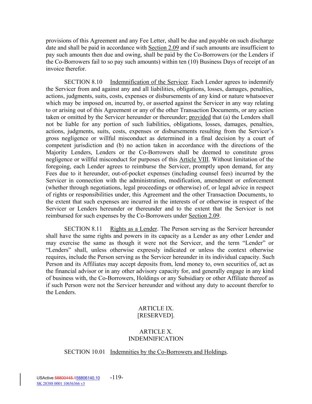 provisions of this Agreement and any Fee Letter, shall be due and payable on such discharge date and shall be paid in accordance with Section 2.09 and if such amounts are insufficient to pay such amounts then due and owing, shall be paid by the Co‐Borrowers (or the Lenders if the Co‐Borrowers fail to so pay such amounts) within ten (10) Business Days of receipt of an invoice therefor. SECTION 8.10 Indemnification of the Servicer. Each Lender agrees to indemnify the Servicer from and against any and all liabilities, obligations, losses, damages, penalties, actions, judgments, suits, costs, expenses or disbursements of any kind or nature whatsoever which may be imposed on, incurred by, or asserted against the Servicer in any way relating to or arising out of this Agreement or any of the other Transaction Documents, or any action taken or omitted by the Servicer hereunder or thereunder; provided that (a) the Lenders shall not be liable for any portion of such liabilities, obligations, losses, damages, penalties, actions, judgments, suits, costs, expenses or disbursements resulting from the Servicer’s gross negligence or willful misconduct as determined in a final decision by a court of competent jurisdiction and (b) no action taken in accordance with the directions of the Majority Lenders, Lenders or the Co‐Borrowers shall be deemed to constitute gross negligence or willful misconduct for purposes of this Article VIII. Without limitation of the foregoing, each Lender agrees to reimburse the Servicer, promptly upon demand, for any Fees due to it hereunder, out‐of‐pocket expenses (including counsel fees) incurred by the Servicer in connection with the administration, modification, amendment or enforcement (whether through negotiations, legal proceedings or otherwise) of, or legal advice in respect of rights or responsibilities under, this Agreement and the other Transaction Documents, to the extent that such expenses are incurred in the interests of or otherwise in respect of the Servicer or Lenders hereunder or thereunder and to the extent that the Servicer is not reimbursed for such expenses by the Co‐Borrowers under Section 2.09. SECTION 8.11 Rights as a Lender. The Person serving as the Servicer hereunder shall have the same rights and powers in its capacity as a Lender as any other Lender and may exercise the same as though it were not the Servicer, and the term “Lender” or “Lenders” shall, unless otherwise expressly indicated or unless the context otherwise requires, include the Person serving as the Servicer hereunder in its individual capacity. Such Person and its Affiliates may accept deposits from, lend money to, own securities of, act as the financial advisor or in any other advisory capacity for, and generally engage in any kind of business with, the Co‐Borrowers, Holdings or any Subsidiary or other Affiliate thereof as if such Person were not the Servicer hereunder and without any duty to account therefor to the Lenders. ARTICLE IX. [RESERVED]. ARTICLE X. INDEMNIFICATION SECTION 10.01 Indemnities by the Co‐Borrowers and Holdings. USActive 58800445.158806140.10 -119- SK 28388 0001 10656366 v3