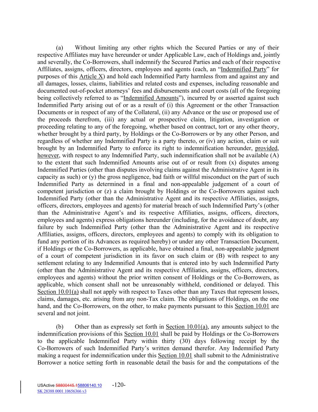 (a) Without limiting any other rights which the Secured Parties or any of their respective Affiliates may have hereunder or under Applicable Law, each of Holdings and, jointly and severally, the Co‐Borrowers, shall indemnify the Secured Parties and each of their respective Affiliates, assigns, officers, directors, employees and agents (each, an “Indemnified Party” for purposes of this Article X) and hold each Indemnified Party harmless from and against any and all damages, losses, claims, liabilities and related costs and expenses, including reasonable and documented out‐of‐pocket attorneys’ fees and disbursements and court costs (all of the foregoing being collectively referred to as “Indemnified Amounts”), incurred by or asserted against such Indemnified Party arising out of or as a result of (i) this Agreement or the other Transaction Documents or in respect of any of the Collateral, (ii) any Advance or the use or proposed use of the proceeds therefrom, (iii) any actual or prospective claim, litigation, investigation or proceeding relating to any of the foregoing, whether based on contract, tort or any other theory, whether brought by a third party, by Holdings or the Co‐Borrowers or by any other Person, and regardless of whether any Indemnified Party is a party thereto, or (iv) any action, claim or suit brought by an Indemnified Party to enforce its right to indemnification hereunder, provided, however, with respect to any Indemnified Party, such indemnification shall not be available (A) to the extent that such Indemnified Amounts arise out of or result from (x) disputes among Indemnified Parties (other than disputes involving claims against the Administrative Agent in its capacity as such) or (y) the gross negligence, bad faith or willful misconduct on the part of such Indemnified Party as determined in a final and non‐appealable judgement of a court of competent jurisdiction or (z) a claim brought by Holdings or the Co‐Borrowers against such Indemnified Party (other than the Administrative Agent and its respective Affiliaties, assigns, officers, directors, employees and agents) for material breach of such Indemnified Party’s (other than the Administrative Agent’s and its respective Affiliaties, assigns, officers, directors, employees and agents) express obligations hereunder (including, for the avoidance of doubt, any failure by such Indemnified Party (other than the Administrative Agent and its respective Affiliaties, assigns, officers, directors, employees and agents) to comply with its obligation to fund any portion of its Advances as required hereby) or under any other Transaction Document, if Holdings or the Co‐Borrowers, as applicable, have obtained a final, non‐appealable judgment of a court of competent jurisdiction in its favor on such claim or (B) with respect to any settlement relating to any Indemnified Amounts that is entered into by such Indemnified Party (other than the Administrative Agent and its respective Affiliaties, assigns, officers, directors, employees and agents) without the prior written consent of Holdings or the Co‐Borrowers, as applicable, which consent shall not be unreasonably withheld, conditioned or delayed. This Section 10.01(a) shall not apply with respect to Taxes other than any Taxes that represent losses, claims, damages, etc. arising from any non‐Tax claim. The obligations of Holdings, on the one hand, and the Co‐Borrowers, on the other, to make payments pursuant to this Section 10.01 are several and not joint. (b) Other than as expressly set forth in Section 10.01(a), any amounts subject to the indemnification provisions of this Section 10.01 shall be paid by Holdings or the Co‐Borrowers to the applicable Indemnified Party within thirty (30) days following receipt by the Co‐Borrowers of such Indemnified Party’s written demand therefor. Any Indemnified Party making a request for indemnification under this Section 10.01 shall submit to the Administrative Borrower a notice setting forth in reasonable detail the basis for and the computations of the USActive 58800445.158806140.10 -120- SK 28388 0001 10656366 v3