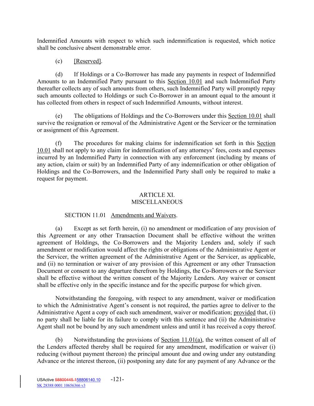 Indemnified Amounts with respect to which such indemnification is requested, which notice shall be conclusive absent demonstrable error. (c) [Reserved]. (d) If Holdings or a Co‐Borrower has made any payments in respect of Indemnified Amounts to an Indemnified Party pursuant to this Section 10.01 and such Indemnified Party thereafter collects any of such amounts from others, such Indemnified Party will promptly repay such amounts collected to Holdings or such Co‐Borrower in an amount equal to the amount it has collected from others in respect of such Indemnified Amounts, without interest. (e) The obligations of Holdings and the Co‐Borrowers under this Section 10.01 shall survive the resignation or removal of the Administrative Agent or the Servicer or the termination or assignment of this Agreement. (f) The procedures for making claims for indemnification set forth in this Section 10.01 shall not apply to any claim for indemnification of any attorneys’ fees, costs and expenses incurred by an Indemnified Party in connection with any enforcement (including by means of any action, claim or suit) by an Indemnified Party of any indemnification or other obligation of Holdings and the Co‐Borrowers, and the Indemnified Party shall only be required to make a request for payment. ARTICLE XI. MISCELLANEOUS SECTION 11.01 Amendments and Waivers. (a) Except as set forth herein, (i) no amendment or modification of any provision of this Agreement or any other Transaction Document shall be effective without the written agreement of Holdings, the Co‐Borrowers and the Majority Lenders and, solely if such amendment or modification would affect the rights or obligations of the Administrative Agent or the Servicer, the written agreement of the Administrative Agent or the Servicer, as applicable, and (ii) no termination or waiver of any provision of this Agreement or any other Transaction Document or consent to any departure therefrom by Holdings, the Co‐Borrowers or the Servicer shall be effective without the written consent of the Majority Lenders. Any waiver or consent shall be effective only in the specific instance and for the specific purpose for which given. Notwithstanding the foregoing, with respect to any amendment, waiver or modification to which the Administrative Agent’s consent is not required, the parties agree to deliver to the Administrative Agent a copy of each such amendment, waiver or modification; provided that, (i) no party shall be liable for its failure to comply with this sentence and (ii) the Administrative Agent shall not be bound by any such amendment unless and until it has received a copy thereof. (b) Notwithstanding the provisions of Section 11.01(a), the written consent of all of the Lenders affected thereby shall be required for any amendment, modification or waiver (i) reducing (without payment thereon) the principal amount due and owing under any outstanding Advance or the interest thereon, (ii) postponing any date for any payment of any Advance or the USActive 58800445.158806140.10 -121- SK 28388 0001 10656366 v3