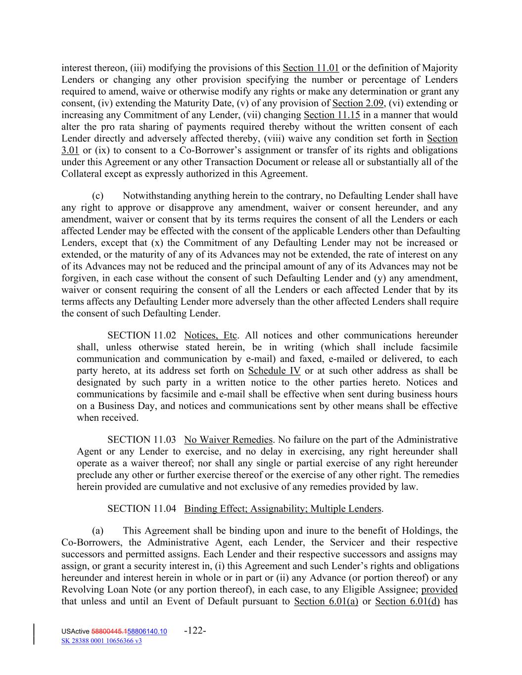 interest thereon, (iii) modifying the provisions of this Section 11.01 or the definition of Majority Lenders or changing any other provision specifying the number or percentage of Lenders required to amend, waive or otherwise modify any rights or make any determination or grant any consent, (iv) extending the Maturity Date, (v) of any provision of Section 2.09, (vi) extending or increasing any Commitment of any Lender, (vii) changing Section 11.15 in a manner that would alter the pro rata sharing of payments required thereby without the written consent of each Lender directly and adversely affected thereby, (viii) waive any condition set forth in Section 3.01 or (ix) to consent to a Co‐Borrower’s assignment or transfer of its rights and obligations under this Agreement or any other Transaction Document or release all or substantially all of the Collateral except as expressly authorized in this Agreement. (c) Notwithstanding anything herein to the contrary, no Defaulting Lender shall have any right to approve or disapprove any amendment, waiver or consent hereunder, and any amendment, waiver or consent that by its terms requires the consent of all the Lenders or each affected Lender may be effected with the consent of the applicable Lenders other than Defaulting Lenders, except that (x) the Commitment of any Defaulting Lender may not be increased or extended, or the maturity of any of its Advances may not be extended, the rate of interest on any of its Advances may not be reduced and the principal amount of any of its Advances may not be forgiven, in each case without the consent of such Defaulting Lender and (y) any amendment, waiver or consent requiring the consent of all the Lenders or each affected Lender that by its terms affects any Defaulting Lender more adversely than the other affected Lenders shall require the consent of such Defaulting Lender. SECTION 11.02 Notices, Etc. All notices and other communications hereunder shall, unless otherwise stated herein, be in writing (which shall include facsimile communication and communication by e‐mail) and faxed, e‐mailed or delivered, to each party hereto, at its address set forth on Schedule IV or at such other address as shall be designated by such party in a written notice to the other parties hereto. Notices and communications by facsimile and e‐mail shall be effective when sent during business hours on a Business Day, and notices and communications sent by other means shall be effective when received. SECTION 11.03 No Waiver Remedies. No failure on the part of the Administrative Agent or any Lender to exercise, and no delay in exercising, any right hereunder shall operate as a waiver thereof; nor shall any single or partial exercise of any right hereunder preclude any other or further exercise thereof or the exercise of any other right. The remedies herein provided are cumulative and not exclusive of any remedies provided by law. SECTION 11.04 Binding Effect; Assignability; Multiple Lenders. (a) This Agreement shall be binding upon and inure to the benefit of Holdings, the Co‐Borrowers, the Administrative Agent, each Lender, the Servicer and their respective successors and permitted assigns. Each Lender and their respective successors and assigns may assign, or grant a security interest in, (i) this Agreement and such Lender’s rights and obligations hereunder and interest herein in whole or in part or (ii) any Advance (or portion thereof) or any Revolving Loan Note (or any portion thereof), in each case, to any Eligible Assignee; provided that unless and until an Event of Default pursuant to Section 6.01(a) or Section 6.01(d) has USActive 58800445.158806140.10 -122- SK 28388 0001 10656366 v3