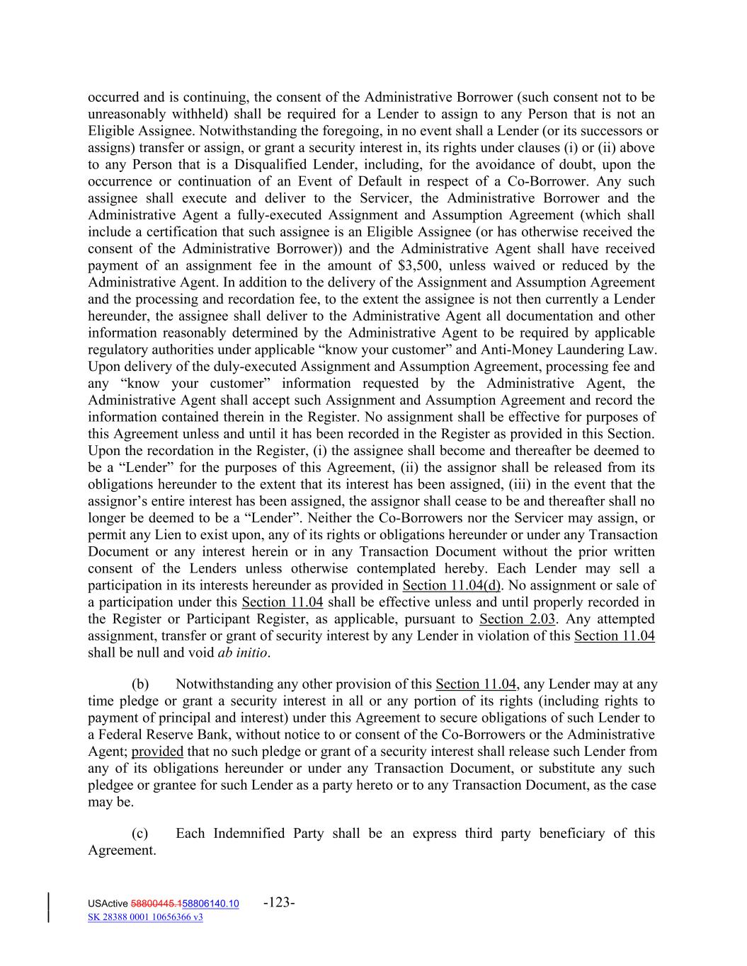 occurred and is continuing, the consent of the Administrative Borrower (such consent not to be unreasonably withheld) shall be required for a Lender to assign to any Person that is not an Eligible Assignee. Notwithstanding the foregoing, in no event shall a Lender (or its successors or assigns) transfer or assign, or grant a security interest in, its rights under clauses (i) or (ii) above to any Person that is a Disqualified Lender, including, for the avoidance of doubt, upon the occurrence or continuation of an Event of Default in respect of a Co‐Borrower. Any such assignee shall execute and deliver to the Servicer, the Administrative Borrower and the Administrative Agent a fully‐executed Assignment and Assumption Agreement (which shall include a certification that such assignee is an Eligible Assignee (or has otherwise received the consent of the Administrative Borrower)) and the Administrative Agent shall have received payment of an assignment fee in the amount of $3,500, unless waived or reduced by the Administrative Agent. In addition to the delivery of the Assignment and Assumption Agreement and the processing and recordation fee, to the extent the assignee is not then currently a Lender hereunder, the assignee shall deliver to the Administrative Agent all documentation and other information reasonably determined by the Administrative Agent to be required by applicable regulatory authorities under applicable “know your customer” and Anti‐Money Laundering Law. Upon delivery of the duly‐executed Assignment and Assumption Agreement, processing fee and any “know your customer” information requested by the Administrative Agent, the Administrative Agent shall accept such Assignment and Assumption Agreement and record the information contained therein in the Register. No assignment shall be effective for purposes of this Agreement unless and until it has been recorded in the Register as provided in this Section. Upon the recordation in the Register, (i) the assignee shall become and thereafter be deemed to be a “Lender” for the purposes of this Agreement, (ii) the assignor shall be released from its obligations hereunder to the extent that its interest has been assigned, (iii) in the event that the assignor’s entire interest has been assigned, the assignor shall cease to be and thereafter shall no longer be deemed to be a “Lender”. Neither the Co‐Borrowers nor the Servicer may assign, or permit any Lien to exist upon, any of its rights or obligations hereunder or under any Transaction Document or any interest herein or in any Transaction Document without the prior written consent of the Lenders unless otherwise contemplated hereby. Each Lender may sell a participation in its interests hereunder as provided in Section 11.04(d). No assignment or sale of a participation under this Section 11.04 shall be effective unless and until properly recorded in the Register or Participant Register, as applicable, pursuant to Section 2.03. Any attempted assignment, transfer or grant of security interest by any Lender in violation of this Section 11.04 shall be null and void ab initio. (b) Notwithstanding any other provision of this Section 11.04, any Lender may at any time pledge or grant a security interest in all or any portion of its rights (including rights to payment of principal and interest) under this Agreement to secure obligations of such Lender to a Federal Reserve Bank, without notice to or consent of the Co‐Borrowers or the Administrative Agent; provided that no such pledge or grant of a security interest shall release such Lender from any of its obligations hereunder or under any Transaction Document, or substitute any such pledgee or grantee for such Lender as a party hereto or to any Transaction Document, as the case may be. (c) Each Indemnified Party shall be an express third party beneficiary of this Agreement. USActive 58800445.158806140.10 -123- SK 28388 0001 10656366 v3