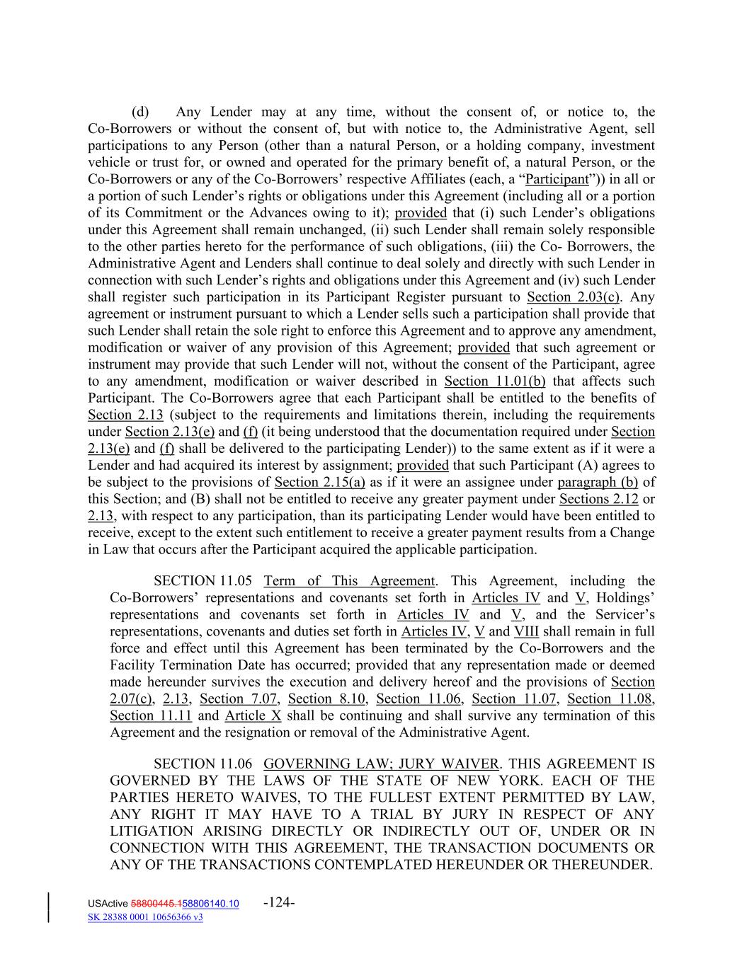 (d) Any Lender may at any time, without the consent of, or notice to, the Co‐Borrowers or without the consent of, but with notice to, the Administrative Agent, sell participations to any Person (other than a natural Person, or a holding company, investment vehicle or trust for, or owned and operated for the primary benefit of, a natural Person, or the Co‐Borrowers or any of the Co‐Borrowers’ respective Affiliates (each, a “Participant”)) in all or a portion of such Lender’s rights or obligations under this Agreement (including all or a portion of its Commitment or the Advances owing to it); provided that (i) such Lender’s obligations under this Agreement shall remain unchanged, (ii) such Lender shall remain solely responsible to the other parties hereto for the performance of such obligations, (iii) the Co‐ Borrowers, the Administrative Agent and Lenders shall continue to deal solely and directly with such Lender in connection with such Lender’s rights and obligations under this Agreement and (iv) such Lender shall register such participation in its Participant Register pursuant to Section 2.03(c). Any agreement or instrument pursuant to which a Lender sells such a participation shall provide that such Lender shall retain the sole right to enforce this Agreement and to approve any amendment, modification or waiver of any provision of this Agreement; provided that such agreement or instrument may provide that such Lender will not, without the consent of the Participant, agree to any amendment, modification or waiver described in Section 11.01(b) that affects such Participant. The Co‐Borrowers agree that each Participant shall be entitled to the benefits of Section 2.13 (subject to the requirements and limitations therein, including the requirements under Section 2.13(e) and (f) (it being understood that the documentation required under Section 2.13(e) and (f) shall be delivered to the participating Lender)) to the same extent as if it were a Lender and had acquired its interest by assignment; provided that such Participant (A) agrees to be subject to the provisions of Section 2.15(a) as if it were an assignee under paragraph (b) of this Section; and (B) shall not be entitled to receive any greater payment under Sections 2.12 or 2.13, with respect to any participation, than its participating Lender would have been entitled to receive, except to the extent such entitlement to receive a greater payment results from a Change in Law that occurs after the Participant acquired the applicable participation. SECTION 11.05 Term of This Agreement. This Agreement, including the Co‐Borrowers’ representations and covenants set forth in Articles IV and V, Holdings’ representations and covenants set forth in Articles IV and V, and the Servicer’s representations, covenants and duties set forth in Articles IV, V and VIII shall remain in full force and effect until this Agreement has been terminated by the Co‐Borrowers and the Facility Termination Date has occurred; provided that any representation made or deemed made hereunder survives the execution and delivery hereof and the provisions of Section 2.07(c), 2.13, Section 7.07, Section 8.10, Section 11.06, Section 11.07, Section 11.08, Section 11.11 and Article X shall be continuing and shall survive any termination of this Agreement and the resignation or removal of the Administrative Agent. SECTION 11.06 GOVERNING LAW; JURY WAIVER. THIS AGREEMENT IS GOVERNED BY THE LAWS OF THE STATE OF NEW YORK. EACH OF THE PARTIES HERETO WAIVES, TO THE FULLEST EXTENT PERMITTED BY LAW, ANY RIGHT IT MAY HAVE TO A TRIAL BY JURY IN RESPECT OF ANY LITIGATION ARISING DIRECTLY OR INDIRECTLY OUT OF, UNDER OR IN CONNECTION WITH THIS AGREEMENT, THE TRANSACTION DOCUMENTS OR ANY OF THE TRANSACTIONS CONTEMPLATED HEREUNDER OR THEREUNDER. USActive 58800445.158806140.10 -124- SK 28388 0001 10656366 v3