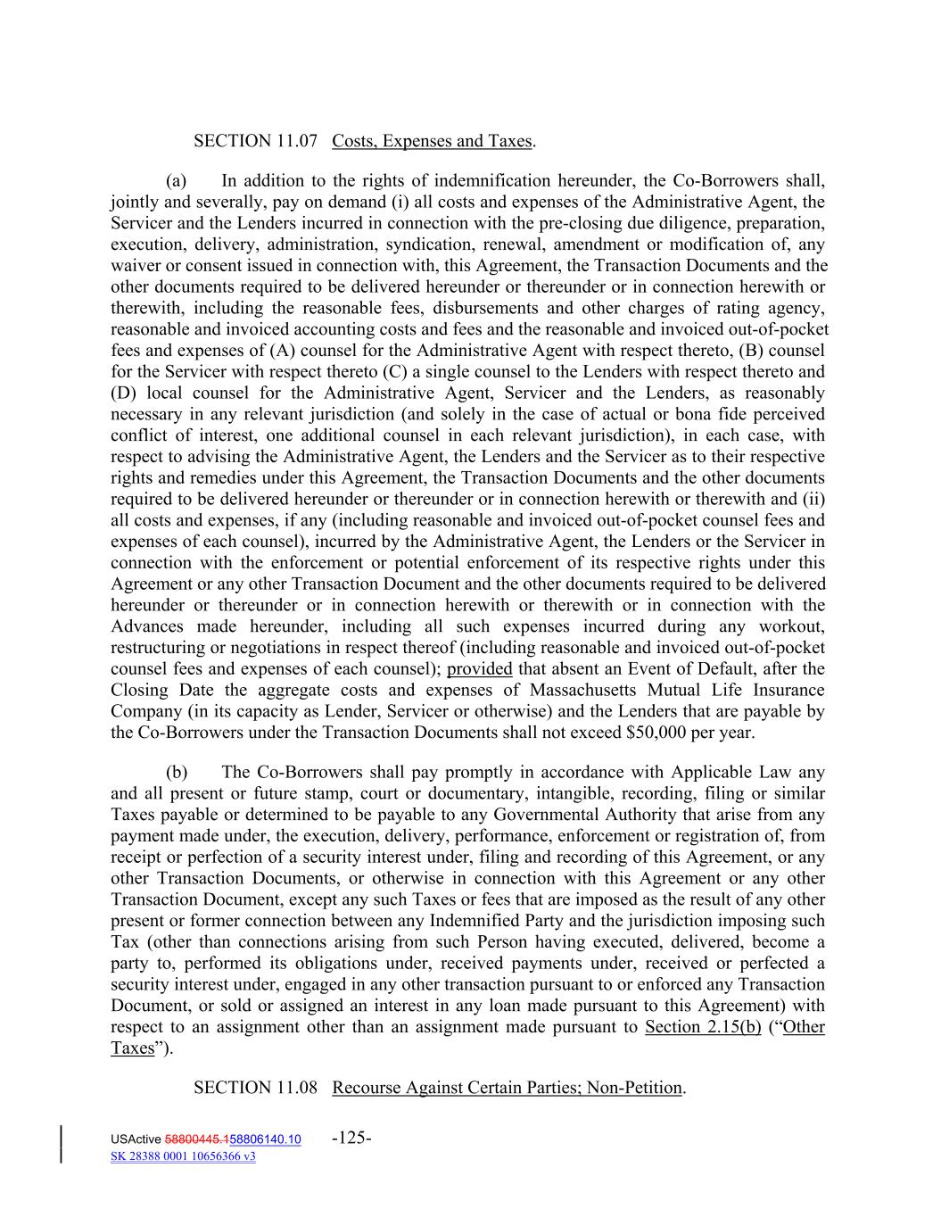 SECTION 11.07 Costs, Expenses and Taxes. (a) In addition to the rights of indemnification hereunder, the Co‐Borrowers shall, jointly and severally, pay on demand (i) all costs and expenses of the Administrative Agent, the Servicer and the Lenders incurred in connection with the pre‐closing due diligence, preparation, execution, delivery, administration, syndication, renewal, amendment or modification of, any waiver or consent issued in connection with, this Agreement, the Transaction Documents and the other documents required to be delivered hereunder or thereunder or in connection herewith or therewith, including the reasonable fees, disbursements and other charges of rating agency, reasonable and invoiced accounting costs and fees and the reasonable and invoiced out‐of‐pocket fees and expenses of (A) counsel for the Administrative Agent with respect thereto, (B) counsel for the Servicer with respect thereto (C) a single counsel to the Lenders with respect thereto and (D) local counsel for the Administrative Agent, Servicer and the Lenders, as reasonably necessary in any relevant jurisdiction (and solely in the case of actual or bona fide perceived conflict of interest, one additional counsel in each relevant jurisdiction), in each case, with respect to advising the Administrative Agent, the Lenders and the Servicer as to their respective rights and remedies under this Agreement, the Transaction Documents and the other documents required to be delivered hereunder or thereunder or in connection herewith or therewith and (ii) all costs and expenses, if any (including reasonable and invoiced out‐of‐pocket counsel fees and expenses of each counsel), incurred by the Administrative Agent, the Lenders or the Servicer in connection with the enforcement or potential enforcement of its respective rights under this Agreement or any other Transaction Document and the other documents required to be delivered hereunder or thereunder or in connection herewith or therewith or in connection with the Advances made hereunder, including all such expenses incurred during any workout, restructuring or negotiations in respect thereof (including reasonable and invoiced out‐of‐pocket counsel fees and expenses of each counsel); provided that absent an Event of Default, after the Closing Date the aggregate costs and expenses of Massachusetts Mutual Life Insurance Company (in its capacity as Lender, Servicer or otherwise) and the Lenders that are payable by the Co‐Borrowers under the Transaction Documents shall not exceed $50,000 per year. (b) The Co‐Borrowers shall pay promptly in accordance with Applicable Law any and all present or future stamp, court or documentary, intangible, recording, filing or similar Taxes payable or determined to be payable to any Governmental Authority that arise from any payment made under, the execution, delivery, performance, enforcement or registration of, from receipt or perfection of a security interest under, filing and recording of this Agreement, or any other Transaction Documents, or otherwise in connection with this Agreement or any other Transaction Document, except any such Taxes or fees that are imposed as the result of any other present or former connection between any Indemnified Party and the jurisdiction imposing such Tax (other than connections arising from such Person having executed, delivered, become a party to, performed its obligations under, received payments under, received or perfected a security interest under, engaged in any other transaction pursuant to or enforced any Transaction Document, or sold or assigned an interest in any loan made pursuant to this Agreement) with respect to an assignment other than an assignment made pursuant to Section 2.15(b) (“Other Taxes”). SECTION 11.08 Recourse Against Certain Parties; Non‐Petition. USActive 58800445.158806140.10 -125- SK 28388 0001 10656366 v3