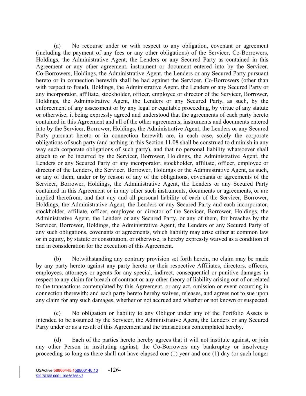 (a) No recourse under or with respect to any obligation, covenant or agreement (including the payment of any fees or any other obligations) of the Servicer, Co‐Borrowers, Holdings, the Administrative Agent, the Lenders or any Secured Party as contained in this Agreement or any other agreement, instrument or document entered into by the Servicer, Co‐Borrowers, Holdings, the Administrative Agent, the Lenders or any Secured Party pursuant hereto or in connection herewith shall be had against the Servicer, Co‐Borrowers (other than with respect to fraud), Holdings, the Administrative Agent, the Lenders or any Secured Party or any incorporator, affiliate, stockholder, officer, employee or director of the Servicer, Borrower, Holdings, the Administrative Agent, the Lenders or any Secured Party, as such, by the enforcement of any assessment or by any legal or equitable proceeding, by virtue of any statute or otherwise; it being expressly agreed and understood that the agreements of each party hereto contained in this Agreement and all of the other agreements, instruments and documents entered into by the Servicer, Borrower, Holdings, the Administrative Agent, the Lenders or any Secured Party pursuant hereto or in connection herewith are, in each case, solely the corporate obligations of such party (and nothing in this Section 11.08 shall be construed to diminish in any way such corporate obligations of such party), and that no personal liability whatsoever shall attach to or be incurred by the Servicer, Borrower, Holdings, the Administrative Agent, the Lenders or any Secured Party or any incorporator, stockholder, affiliate, officer, employee or director of the Lenders, the Servicer, Borrower, Holdings or the Administrative Agent, as such, or any of them, under or by reason of any of the obligations, covenants or agreements of the Servicer, Borrower, Holdings, the Administrative Agent, the Lenders or any Secured Party contained in this Agreement or in any other such instruments, documents or agreements, or are implied therefrom, and that any and all personal liability of each of the Servicer, Borrower, Holdings, the Administrative Agent, the Lenders or any Secured Party and each incorporator, stockholder, affiliate, officer, employee or director of the Servicer, Borrower, Holdings, the Administrative Agent, the Lenders or any Secured Party, or any of them, for breaches by the Servicer, Borrower, Holdings, the Administrative Agent, the Lenders or any Secured Party of any such obligations, covenants or agreements, which liability may arise either at common law or in equity, by statute or constitution, or otherwise, is hereby expressly waived as a condition of and in consideration for the execution of this Agreement. (b) Notwithstanding any contrary provision set forth herein, no claim may be made by any party hereto against any party hereto or their respective Affiliates, directors, officers, employees, attorneys or agents for any special, indirect, consequential or punitive damages in respect to any claim for breach of contract or any other theory of liability arising out of or related to the transactions contemplated by this Agreement, or any act, omission or event occurring in connection therewith; and each party hereto hereby waives, releases, and agrees not to sue upon any claim for any such damages, whether or not accrued and whether or not known or suspected. (c) No obligation or liability to any Obligor under any of the Portfolio Assets is intended to be assumed by the Servicer, the Administrative Agent, the Lenders or any Secured Party under or as a result of this Agreement and the transactions contemplated hereby. (d) Each of the parties hereto hereby agrees that it will not institute against, or join any other Person in instituting against, the Co‐Borrowers any bankruptcy or insolvency proceeding so long as there shall not have elapsed one (1) year and one (1) day (or such longer USActive 58800445.158806140.10 -126- SK 28388 0001 10656366 v3