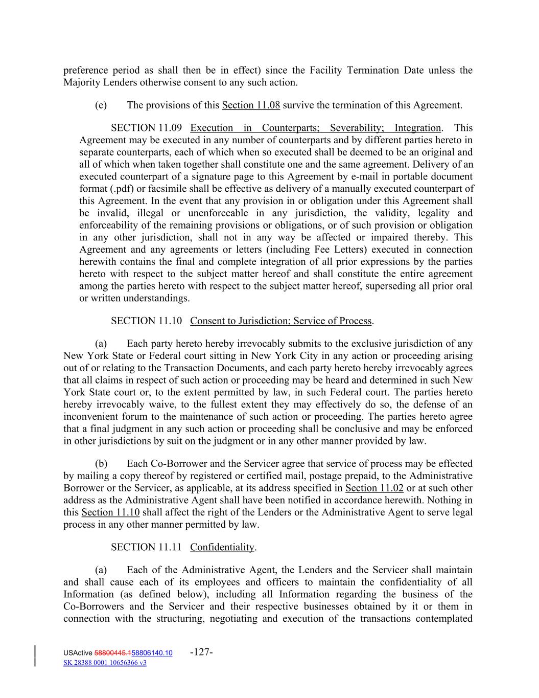 preference period as shall then be in effect) since the Facility Termination Date unless the Majority Lenders otherwise consent to any such action. (e) The provisions of this Section 11.08 survive the termination of this Agreement. SECTION 11.09 Execution in Counterparts; Severability; Integration. This Agreement may be executed in any number of counterparts and by different parties hereto in separate counterparts, each of which when so executed shall be deemed to be an original and all of which when taken together shall constitute one and the same agreement. Delivery of an executed counterpart of a signature page to this Agreement by e‐mail in portable document format (.pdf) or facsimile shall be effective as delivery of a manually executed counterpart of this Agreement. In the event that any provision in or obligation under this Agreement shall be invalid, illegal or unenforceable in any jurisdiction, the validity, legality and enforceability of the remaining provisions or obligations, or of such provision or obligation in any other jurisdiction, shall not in any way be affected or impaired thereby. This Agreement and any agreements or letters (including Fee Letters) executed in connection herewith contains the final and complete integration of all prior expressions by the parties hereto with respect to the subject matter hereof and shall constitute the entire agreement among the parties hereto with respect to the subject matter hereof, superseding all prior oral or written understandings. SECTION 11.10 Consent to Jurisdiction; Service of Process. (a) Each party hereto hereby irrevocably submits to the exclusive jurisdiction of any New York State or Federal court sitting in New York City in any action or proceeding arising out of or relating to the Transaction Documents, and each party hereto hereby irrevocably agrees that all claims in respect of such action or proceeding may be heard and determined in such New York State court or, to the extent permitted by law, in such Federal court. The parties hereto hereby irrevocably waive, to the fullest extent they may effectively do so, the defense of an inconvenient forum to the maintenance of such action or proceeding. The parties hereto agree that a final judgment in any such action or proceeding shall be conclusive and may be enforced in other jurisdictions by suit on the judgment or in any other manner provided by law. (b) Each Co‐Borrower and the Servicer agree that service of process may be effected by mailing a copy thereof by registered or certified mail, postage prepaid, to the Administrative Borrower or the Servicer, as applicable, at its address specified in Section 11.02 or at such other address as the Administrative Agent shall have been notified in accordance herewith. Nothing in this Section 11.10 shall affect the right of the Lenders or the Administrative Agent to serve legal process in any other manner permitted by law. SECTION 11.11 Confidentiality. (a) Each of the Administrative Agent, the Lenders and the Servicer shall maintain and shall cause each of its employees and officers to maintain the confidentiality of all Information (as defined below), including all Information regarding the business of the Co‐Borrowers and the Servicer and their respective businesses obtained by it or them in connection with the structuring, negotiating and execution of the transactions contemplated USActive 58800445.158806140.10 -127- SK 28388 0001 10656366 v3