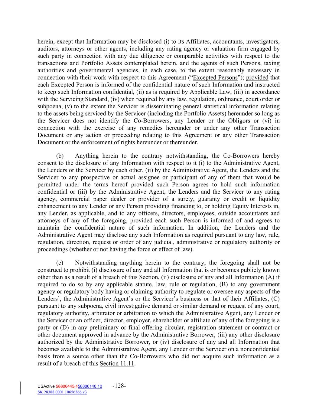 herein, except that Information may be disclosed (i) to its Affiliates, accountants, investigators, auditors, attorneys or other agents, including any rating agency or valuation firm engaged by such party in connection with any due diligence or comparable activities with respect to the transactions and Portfolio Assets contemplated herein, and the agents of such Persons, taxing authorities and governmental agencies, in each case, to the extent reasonably necessary in connection with their work with respect to this Agreement (“Excepted Persons”); provided that each Excepted Person is informed of the confidential nature of such Information and instructed to keep such Information confidential, (ii) as is required by Applicable Law, (iii) in accordance with the Servicing Standard, (iv) when required by any law, regulation, ordinance, court order or subpoena, (v) to the extent the Servicer is disseminating general statistical information relating to the assets being serviced by the Servicer (including the Portfolio Assets) hereunder so long as the Servicer does not identify the Co‐Borrowers, any Lender or the Obligors or (vi) in connection with the exercise of any remedies hereunder or under any other Transaction Document or any action or proceeding relating to this Agreement or any other Transaction Document or the enforcement of rights hereunder or thereunder. (b) Anything herein to the contrary notwithstanding, the Co‐Borrowers hereby consent to the disclosure of any Information with respect to it (i) to the Administrative Agent, the Lenders or the Servicer by each other, (ii) by the Administrative Agent, the Lenders and the Servicer to any prospective or actual assignee or participant of any of them that would be permitted under the terms hereof provided such Person agrees to hold such information confidential or (iii) by the Administrative Agent, the Lenders and the Servicer to any rating agency, commercial paper dealer or provider of a surety, guaranty or credit or liquidity enhancement to any Lender or any Person providing financing to, or holding Equity Interests in, any Lender, as applicable, and to any officers, directors, employees, outside accountants and attorneys of any of the foregoing, provided each such Person is informed of and agrees to maintain the confidential nature of such information. In addition, the Lenders and the Administrative Agent may disclose any such Information as required pursuant to any law, rule, regulation, direction, request or order of any judicial, administrative or regulatory authority or proceedings (whether or not having the force or effect of law). (c) Notwithstanding anything herein to the contrary, the foregoing shall not be construed to prohibit (i) disclosure of any and all Information that is or becomes publicly known other than as a result of a breach of this Section, (ii) disclosure of any and all Information (A) if required to do so by any applicable statute, law, rule or regulation, (B) to any government agency or regulatory body having or claiming authority to regulate or oversee any aspects of the Lenders’, the Administrative Agent’s or the Servicer’s business or that of their Affiliates, (C) pursuant to any subpoena, civil investigative demand or similar demand or request of any court, regulatory authority, arbitrator or arbitration to which the Administrative Agent, any Lender or the Servicer or an officer, director, employer, shareholder or affiliate of any of the foregoing is a party or (D) in any preliminary or final offering circular, registration statement or contract or other document approved in advance by the Administrative Borrower, (iii) any other disclosure authorized by the Administrative Borrower, or (iv) disclosure of any and all Information that becomes available to the Administrative Agent, any Lender or the Servicer on a nonconfidential basis from a source other than the Co‐Borrowers who did not acquire such information as a result of a breach of this Section 11.11. USActive 58800445.158806140.10 -128- SK 28388 0001 10656366 v3