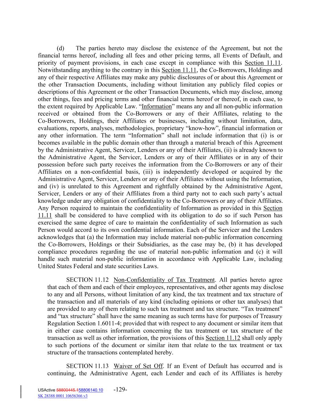 (d) The parties hereto may disclose the existence of the Agreement, but not the financial terms hereof, including all fees and other pricing terms, all Events of Default, and priority of payment provisions, in each case except in compliance with this Section 11.11. Notwithstanding anything to the contrary in this Section 11.11, the Co‐Borrowers, Holdings and any of their respective Affiliates may make any public disclosures of or about this Agreement or the other Transaction Documents, including without limitation any publicly filed copies or descriptions of this Agreement or the other Transaction Documents, which may disclose, among other things, fees and pricing terms and other financial terms hereof or thereof, in each case, to the extent required by Applicable Law. “Information” means any and all non‐public information received or obtained from the Co‐Borrowers or any of their Affiliates, relating to the Co‐Borrowers, Holdings, their Affiliates or businesses, including without limitation, data, evaluations, reports, analyses, methodologies, proprietary “know‐how”, financial information or any other information. The term “Information” shall not include information that (i) is or becomes available in the public domain other than through a material breach of this Agreement by the Administrative Agent, Servicer, Lenders or any of their Affiliates, (ii) is already known to the Administrative Agent, the Servicer, Lenders or any of their Affiliates or in any of their possession before such party receives the information from the Co‐Borrowers or any of their Affiliates on a non‐confidential basis, (iii) is independently developed or acquired by the Administrative Agent, Servicer, Lenders or any of their Affiliates without using the Information, and (iv) is unrelated to this Agreement and rightfully obtained by the Administrative Agent, Servicer, Lenders or any of their Affiliates from a third party not to each such party’s actual knowledge under any obligation of confidentiality to the Co‐Borrowers or any of their Affiliates. Any Person required to maintain the confidentiality of Information as provided in this Section 11.11 shall be considered to have complied with its obligation to do so if such Person has exercised the same degree of care to maintain the confidentiality of such Information as such Person would accord to its own confidential information. Each of the Servicer and the Lenders acknowledges that (a) the Information may include material non‐public information concerning the Co‐Borrowers, Holdings or their Subsidiaries, as the case may be, (b) it has developed compliance procedures regarding the use of material non‐public information and (c) it will handle such material non‐public information in accordance with Applicable Law, including United States Federal and state securities Laws. SECTION 11.12 Non‐Confidentiality of Tax Treatment. All parties hereto agree that each of them and each of their employees, representatives, and other agents may disclose to any and all Persons, without limitation of any kind, the tax treatment and tax structure of the transaction and all materials of any kind (including opinions or other tax analyses) that are provided to any of them relating to such tax treatment and tax structure. “Tax treatment” and “tax structure” shall have the same meaning as such terms have for purposes of Treasury Regulation Section 1.6011‐4; provided that with respect to any document or similar item that in either case contains information concerning the tax treatment or tax structure of the transaction as well as other information, the provisions of this Section 11.12 shall only apply to such portions of the document or similar item that relate to the tax treatment or tax structure of the transactions contemplated hereby. SECTION 11.13 Waiver of Set Off. If an Event of Default has occurred and is continuing, the Administrative Agent, each Lender and each of its Affiliates is hereby USActive 58800445.158806140.10 -129- SK 28388 0001 10656366 v3