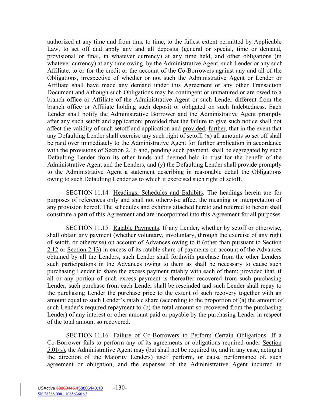 authorized at any time and from time to time, to the fullest extent permitted by Applicable Law, to set off and apply any and all deposits (general or special, time or demand, provisional or final, in whatever currency) at any time held, and other obligations (in whatever currency) at any time owing, by the Administrative Agent, such Lender or any such Affiliate, to or for the credit or the account of the Co‐Borrowers against any and all of the Obligations, irrespective of whether or not such the Administrative Agent or Lender or Affiliate shall have made any demand under this Agreement or any other Transaction Document and although such Obligations may be contingent or unmatured or are owed to a branch office or Affiliate of the Administrative Agent or such Lender different from the branch office or Affiliate holding such deposit or obligated on such Indebtedness. Each Lender shall notify the Administrative Borrower and the Administrative Agent promptly after any such setoff and application; provided that the failure to give such notice shall not affect the validity of such setoff and application and provided, further, that in the event that any Defaulting Lender shall exercise any such right of setoff, (x) all amounts so set off shall be paid over immediately to the Administrative Agent for further application in accordance with the provisions of Section 2.16 and, pending such payment, shall be segregated by such Defaulting Lender from its other funds and deemed held in trust for the benefit of the Administrative Agent and the Lenders, and (y) the Defaulting Lender shall provide promptly to the Administrative Agent a statement describing in reasonable detail the Obligations owing to such Defaulting Lender as to which it exercised such right of setoff. SECTION 11.14 Headings, Schedules and Exhibits. The headings herein are for purposes of references only and shall not otherwise affect the meaning or interpretation of any provision hereof. The schedules and exhibits attached hereto and referred to herein shall constitute a part of this Agreement and are incorporated into this Agreement for all purposes. SECTION 11.15 Ratable Payments. If any Lender, whether by setoff or otherwise, shall obtain any payment (whether voluntary, involuntary, through the exercise of any right of setoff, or otherwise) on account of Advances owing to it (other than pursuant to Section 2.12 or Section 2.13) in excess of its ratable share of payments on account of the Advances obtained by all the Lenders, such Lender shall forthwith purchase from the other Lenders such participations in the Advances owing to them as shall be necessary to cause such purchasing Lender to share the excess payment ratably with each of them; provided that, if all or any portion of such excess payment is thereafter recovered from such purchasing Lender, such purchase from each Lender shall be rescinded and such Lender shall repay to the purchasing Lender the purchase price to the extent of such recovery together with an amount equal to such Lender’s ratable share (according to the proportion of (a) the amount of such Lender’s required repayment to (b) the total amount so recovered from the purchasing Lender) of any interest or other amount paid or payable by the purchasing Lender in respect of the total amount so recovered. SECTION 11.16 Failure of Co‐Borrowers to Perform Certain Obligations. If a Co‐Borrower fails to perform any of its agreements or obligations required under Section 5.01(s), the Administrative Agent may (but shall not be required to, and in any case, acting at the direction of the Majority Lenders) itself perform, or cause performance of, such agreement or obligation, and the expenses of the Administrative Agent incurred in USActive 58800445.158806140.10 -130- SK 28388 0001 10656366 v3