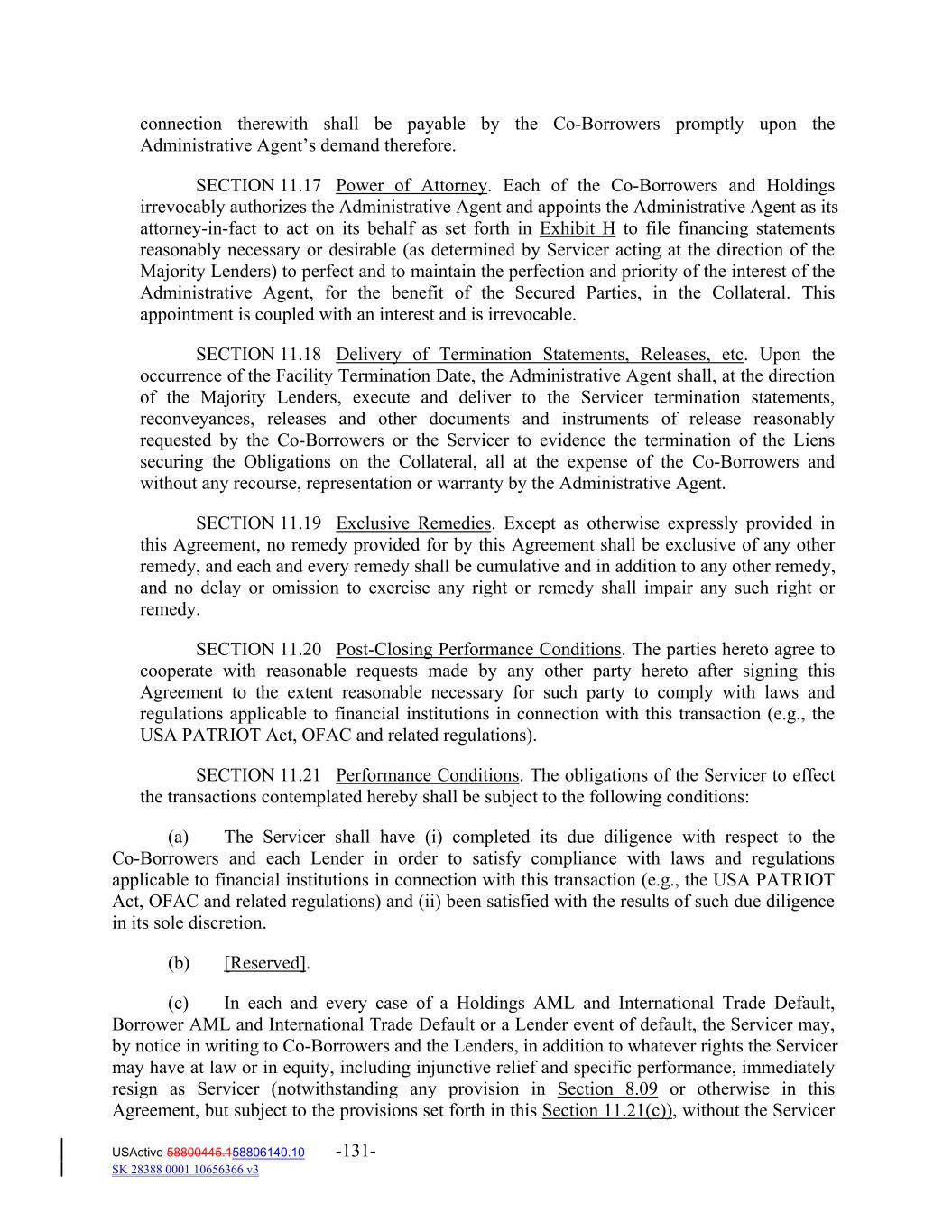 connection therewith shall be payable by the Co‐Borrowers promptly upon the Administrative Agent’s demand therefore. SECTION 11.17 Power of Attorney. Each of the Co‐Borrowers and Holdings irrevocably authorizes the Administrative Agent and appoints the Administrative Agent as its attorney‐in‐fact to act on its behalf as set forth in Exhibit H to file financing statements reasonably necessary or desirable (as determined by Servicer acting at the direction of the Majority Lenders) to perfect and to maintain the perfection and priority of the interest of the Administrative Agent, for the benefit of the Secured Parties, in the Collateral. This appointment is coupled with an interest and is irrevocable. SECTION 11.18 Delivery of Termination Statements, Releases, etc. Upon the occurrence of the Facility Termination Date, the Administrative Agent shall, at the direction of the Majority Lenders, execute and deliver to the Servicer termination statements, reconveyances, releases and other documents and instruments of release reasonably requested by the Co‐Borrowers or the Servicer to evidence the termination of the Liens securing the Obligations on the Collateral, all at the expense of the Co‐Borrowers and without any recourse, representation or warranty by the Administrative Agent. SECTION 11.19 Exclusive Remedies. Except as otherwise expressly provided in this Agreement, no remedy provided for by this Agreement shall be exclusive of any other remedy, and each and every remedy shall be cumulative and in addition to any other remedy, and no delay or omission to exercise any right or remedy shall impair any such right or remedy. SECTION 11.20 Post‐Closing Performance Conditions. The parties hereto agree to cooperate with reasonable requests made by any other party hereto after signing this Agreement to the extent reasonable necessary for such party to comply with laws and regulations applicable to financial institutions in connection with this transaction (e.g., the USA PATRIOT Act, OFAC and related regulations). SECTION 11.21 Performance Conditions. The obligations of the Servicer to effect the transactions contemplated hereby shall be subject to the following conditions: (a) The Servicer shall have (i) completed its due diligence with respect to the Co‐Borrowers and each Lender in order to satisfy compliance with laws and regulations applicable to financial institutions in connection with this transaction (e.g., the USA PATRIOT Act, OFAC and related regulations) and (ii) been satisfied with the results of such due diligence in its sole discretion. (b) [Reserved]. (c) In each and every case of a Holdings AML and International Trade Default, Borrower AML and International Trade Default or a Lender event of default, the Servicer may, by notice in writing to Co‐Borrowers and the Lenders, in addition to whatever rights the Servicer may have at law or in equity, including injunctive relief and specific performance, immediately resign as Servicer (notwithstanding any provision in Section 8.09 or otherwise in this Agreement, but subject to the provisions set forth in this Section 11.21(c)), without the Servicer USActive 58800445.158806140.10 -131- SK 28388 0001 10656366 v3