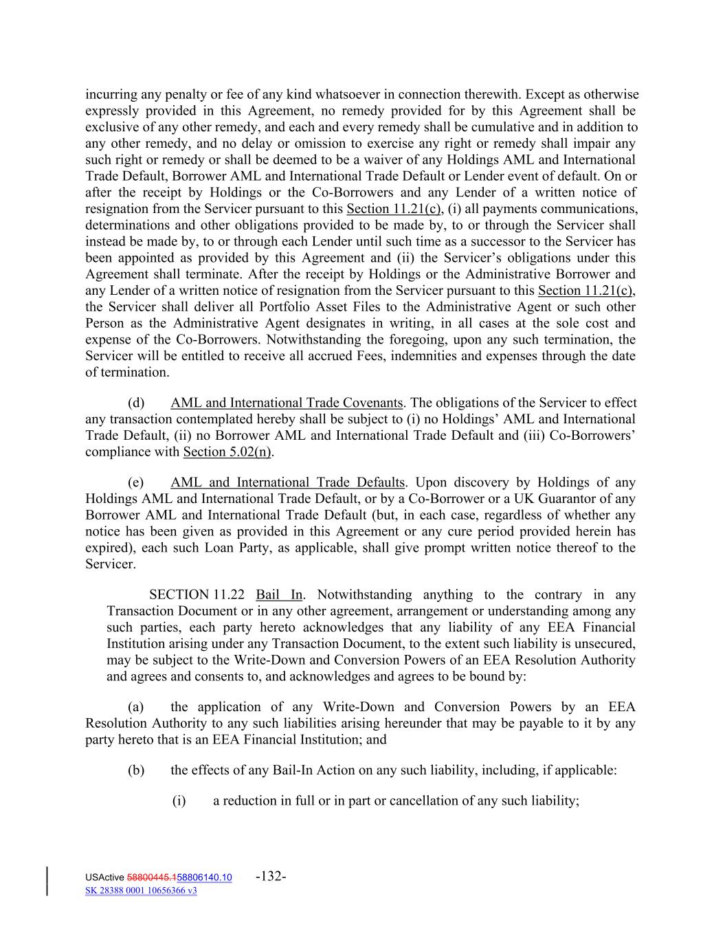 incurring any penalty or fee of any kind whatsoever in connection therewith. Except as otherwise expressly provided in this Agreement, no remedy provided for by this Agreement shall be exclusive of any other remedy, and each and every remedy shall be cumulative and in addition to any other remedy, and no delay or omission to exercise any right or remedy shall impair any such right or remedy or shall be deemed to be a waiver of any Holdings AML and International Trade Default, Borrower AML and International Trade Default or Lender event of default. On or after the receipt by Holdings or the Co‐Borrowers and any Lender of a written notice of resignation from the Servicer pursuant to this Section 11.21(c), (i) all payments communications, determinations and other obligations provided to be made by, to or through the Servicer shall instead be made by, to or through each Lender until such time as a successor to the Servicer has been appointed as provided by this Agreement and (ii) the Servicer’s obligations under this Agreement shall terminate. After the receipt by Holdings or the Administrative Borrower and any Lender of a written notice of resignation from the Servicer pursuant to this Section 11.21(c), the Servicer shall deliver all Portfolio Asset Files to the Administrative Agent or such other Person as the Administrative Agent designates in writing, in all cases at the sole cost and expense of the Co‐Borrowers. Notwithstanding the foregoing, upon any such termination, the Servicer will be entitled to receive all accrued Fees, indemnities and expenses through the date of termination. (d) AML and International Trade Covenants. The obligations of the Servicer to effect any transaction contemplated hereby shall be subject to (i) no Holdings’ AML and International Trade Default, (ii) no Borrower AML and International Trade Default and (iii) Co‐Borrowers’ compliance with Section 5.02(n). (e) AML and International Trade Defaults. Upon discovery by Holdings of any Holdings AML and International Trade Default, or by a Co‐Borrower or a UK Guarantor of any Borrower AML and International Trade Default (but, in each case, regardless of whether any notice has been given as provided in this Agreement or any cure period provided herein has expired), each such Loan Party, as applicable, shall give prompt written notice thereof to the Servicer. SECTION 11.22 Bail In. Notwithstanding anything to the contrary in any Transaction Document or in any other agreement, arrangement or understanding among any such parties, each party hereto acknowledges that any liability of any EEA Financial Institution arising under any Transaction Document, to the extent such liability is unsecured, may be subject to the Write‐Down and Conversion Powers of an EEA Resolution Authority and agrees and consents to, and acknowledges and agrees to be bound by: (a) the application of any Write‐Down and Conversion Powers by an EEA Resolution Authority to any such liabilities arising hereunder that may be payable to it by any party hereto that is an EEA Financial Institution; and (b) the effects of any Bail‐In Action on any such liability, including, if applicable: (i) a reduction in full or in part or cancellation of any such liability; USActive 58800445.158806140.10 -132- SK 28388 0001 10656366 v3