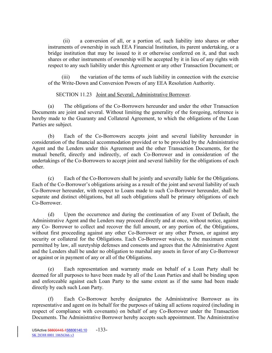 (ii) a conversion of all, or a portion of, such liability into shares or other instruments of ownership in such EEA Financial Institution, its parent undertaking, or a bridge institution that may be issued to it or otherwise conferred on it, and that such shares or other instruments of ownership will be accepted by it in lieu of any rights with respect to any such liability under this Agreement or any other Transaction Document; or (iii) the variation of the terms of such liability in connection with the exercise of the Write‐Down and Conversion Powers of any EEA Resolution Authority. SECTION 11.23 Joint and Several; Administrative Borrower. (a) The obligations of the Co‐Borrowers hereunder and under the other Transaction Documents are joint and several. Without limiting the generality of the foregoing, reference is hereby made to the Guaranty and Collateral Agreement, to which the obligations of the Loan Parties are subject. (b) Each of the Co‐Borrowers accepts joint and several liability hereunder in consideration of the financial accommodation provided or to be provided by the Administrative Agent and the Lenders under this Agreement and the other Transaction Documents, for the mutual benefit, directly and indirectly, of each Co‐Borrower and in consideration of the undertakings of the Co‐Borrowers to accept joint and several liability for the obligations of each other. (c) Each of the Co‐Borrowers shall be jointly and severally liable for the Obligations. Each of the Co‐Borrower’s obligations arising as a result of the joint and several liability of such Co‐Borrower hereunder, with respect to Loans made to such Co‐Borrower hereunder, shall be separate and distinct obligations, but all such obligations shall be primary obligations of each Co‐Borrower. (d) Upon the occurrence and during the continuation of any Event of Default, the Administrative Agent and the Lenders may proceed directly and at once, without notice, against any Co‐ Borrower to collect and recover the full amount, or any portion of, the Obligations, without first proceeding against any other Co‐Borrower or any other Person, or against any security or collateral for the Obligations. Each Co‐Borrower waives, to the maximum extent permitted by law, all suretyship defenses and consents and agrees that the Administrative Agent and the Lenders shall be under no obligation to marshal any assets in favor of any Co‐Borrower or against or in payment of any or all of the Obligations. (e) Each representation and warranty made on behalf of a Loan Party shall be deemed for all purposes to have been made by all of the Loan Parties and shall be binding upon and enforceable against each Loan Party to the same extent as if the same had been made directly by each such Loan Party. (f) Each Co‐Borrower hereby designates the Administrative Borrower as its representative and agent on its behalf for the purposes of taking all actions required (including in respect of compliance with covenants) on behalf of any Co‐Borrower under the Transaction Documents. The Administrative Borrower hereby accepts such appointment. The Administrative USActive 58800445.158806140.10 -133- SK 28388 0001 10656366 v3