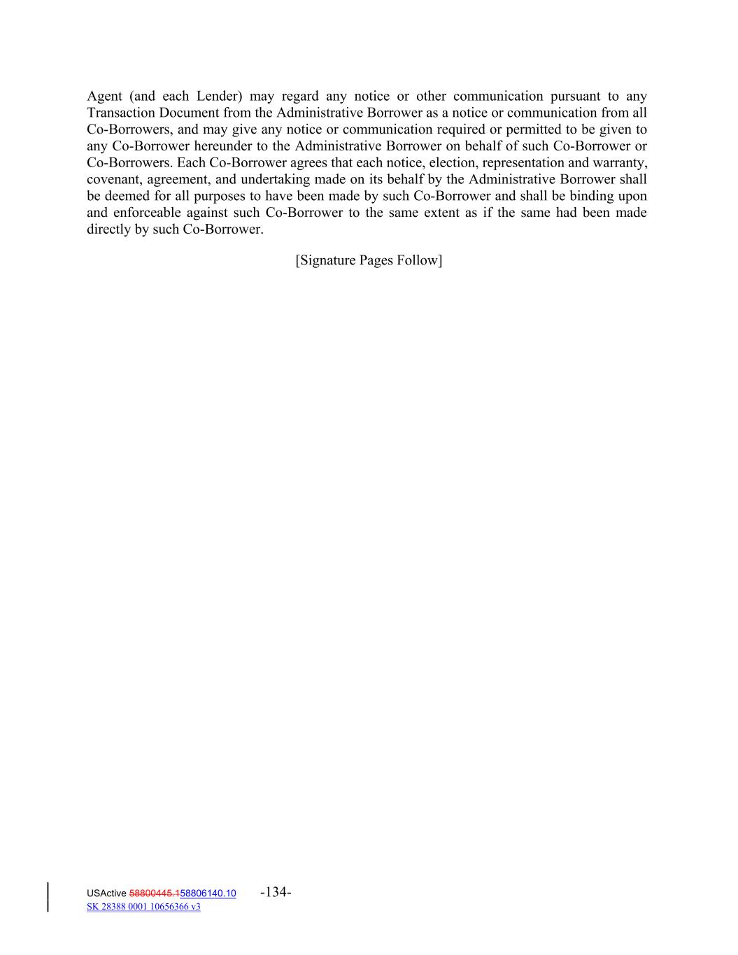 Agent (and each Lender) may regard any notice or other communication pursuant to any Transaction Document from the Administrative Borrower as a notice or communication from all Co‐Borrowers, and may give any notice or communication required or permitted to be given to any Co‐Borrower hereunder to the Administrative Borrower on behalf of such Co‐Borrower or Co‐Borrowers. Each Co‐Borrower agrees that each notice, election, representation and warranty, covenant, agreement, and undertaking made on its behalf by the Administrative Borrower shall be deemed for all purposes to have been made by such Co‐Borrower and shall be binding upon and enforceable against such Co‐Borrower to the same extent as if the same had been made directly by such Co‐Borrower. [Signature Pages Follow] USActive 58800445.158806140.10 -134- SK 28388 0001 10656366 v3
