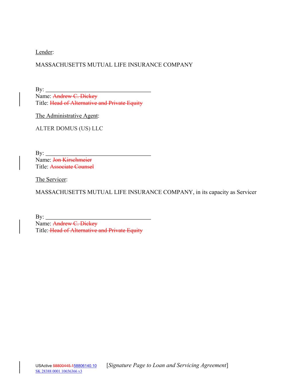 Lender: MASSACHUSETTS MUTUAL LIFE INSURANCE COMPANY By: Name: Andrew C. Dickey Title: Head of Alternative and Private Equity The Administrative Agent: ALTER DOMUS (US) LLC By: Name: Jon Kirschmeier Title: Associate Counsel The Servicer: MASSACHUSETTS MUTUAL LIFE INSURANCE COMPANY, in its capacity as Servicer By: Name: Andrew C. Dickey Title: Head of Alternative and Private Equity USActive 58800445.158806140.10 [Signature Page to Loan and Servicing Agreement] SK 28388 0001 10656366 v3