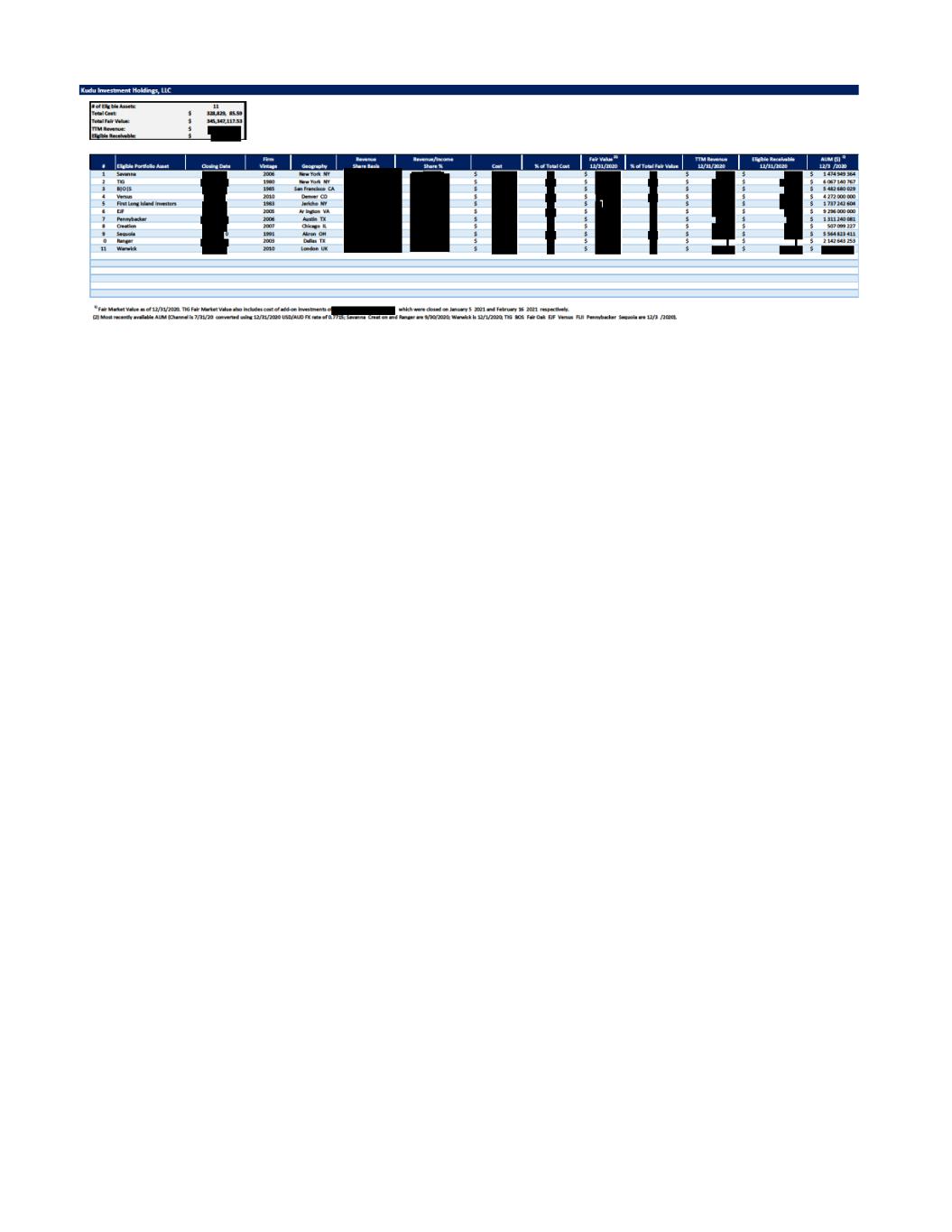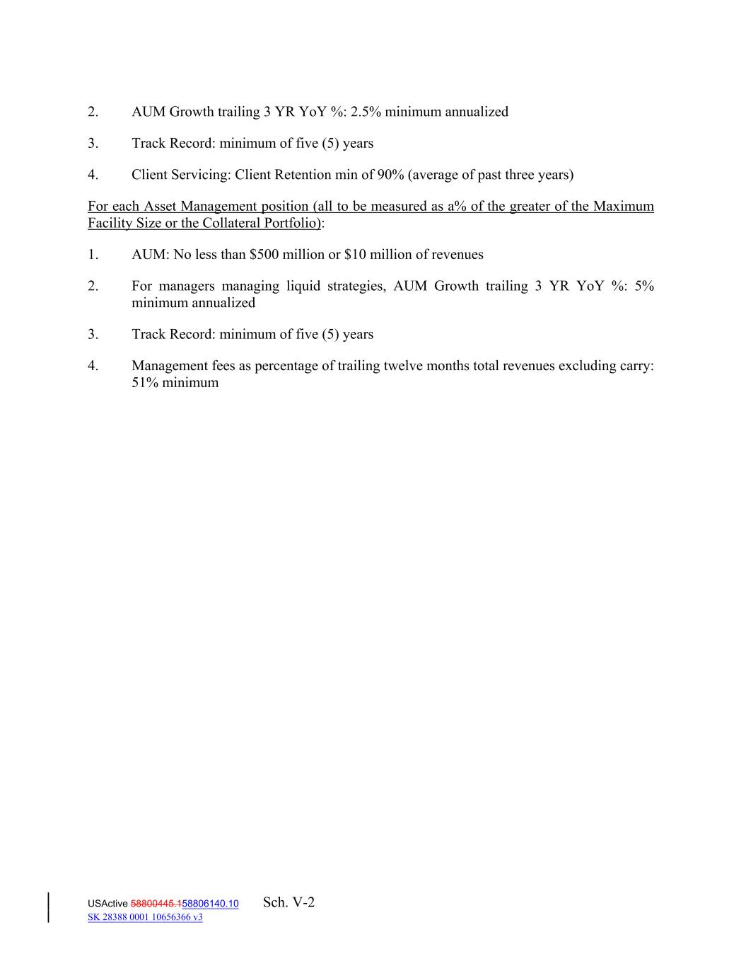 2. AUM Growth trailing 3 YR YoY %: 2.5% minimum annualized 3. Track Record: minimum of five (5) years 4. Client Servicing: Client Retention min of 90% (average of past three years) For each Asset Management position (all to be measured as a% of the greater of the Maximum Facility Size or the Collateral Portfolio): 1. AUM: No less than $500 million or $10 million of revenues 2. For managers managing liquid strategies, AUM Growth trailing 3 YR YoY %: 5% minimum annualized 3. Track Record: minimum of five (5) years 4. Management fees as percentage of trailing twelve months total revenues excluding carry: 51% minimum USActive 58800445.158806140.10 Sch. V-2 SK 28388 0001 10656366 v3