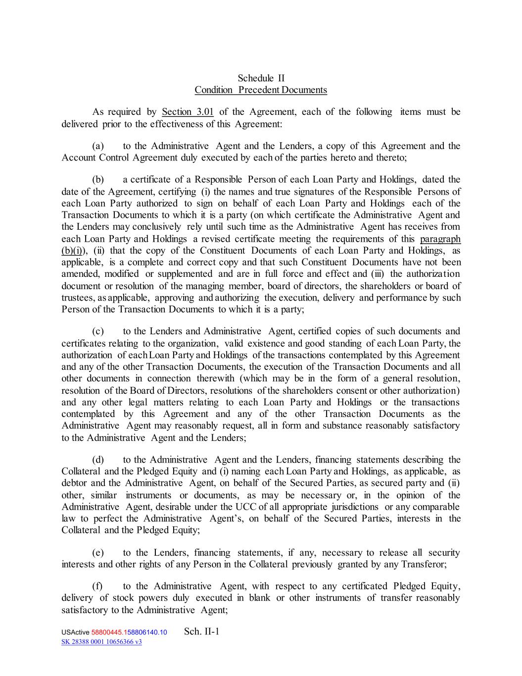 Schedule II Condition Precedent Documents As required by Section 3.01 of the Agreement, each of the following items must be delivered prior to the effectiveness of this Agreement: (a) to the Administrative Agent and the Lenders, a copy of this Agreement and the Account Control Agreement duly executed by each of the parties hereto and thereto; (b) a certificate of a Responsible Person of each Loan Party and Holdings, dated the date of the Agreement, certifying (i) the names and true signatures of the Responsible Persons of each Loan Party authorized to sign on behalf of each Loan Party and Holdings each of the Transaction Documents to which it is a party (on which certificate the Administrative Agent and the Lenders may conclusively rely until such time as the Administrative Agent has receives from each Loan Party and Holdings a revised certificate meeting the requirements of this paragraph (b)(i)), (ii) that the copy of the Constituent Documents of each Loan Party and Holdings, as applicable, is a complete and correct copy and that such Constituent Documents have not been amended, modified or supplemented and are in full force and effect and (iii) the authorization document or resolution of the managing member, board of directors, the shareholders or board of trustees, as applicable, approving and authorizing the execution, delivery and performance by such Person of the Transaction Documents to which it is a party; (c) to the Lenders and Administrative Agent, certified copies of such documents and certificates relating to the organization, valid existence and good standing of each Loan Party, the authorization of each Loan Party and Holdings of the transactions contemplated by this Agreement and any of the other Transaction Documents, the execution of the Transaction Documents and all other documents in connection therewith (which may be in the form of a general resolution, resolution of the Board of Directors, resolutions of the shareholders consent or other authorization) and any other legal matters relating to each Loan Party and Holdings or the transactions contemplated by this Agreement and any of the other Transaction Documents as the Administrative Agent may reasonably request, all in form and substance reasonably satisfactory to the Administrative Agent and the Lenders; (d) to the Administrative Agent and the Lenders, financing statements describing the Collateral and the Pledged Equity and (i) naming each Loan Party and Holdings, as applicable, as debtor and the Administrative Agent, on behalf of the Secured Parties, as secured party and (ii) other, similar instruments or documents, as may be necessary or, in the opinion of the Administrative Agent, desirable under the UCC of all appropriate jurisdictions or any comparable law to perfect the Administrative Agent’s, on behalf of the Secured Parties, interests in the Collateral and the Pledged Equity; (e) to the Lenders, financing statements, if any, necessary to release all security interests and other rights of any Person in the Collateral previously granted by any Transferor; (f) to the Administrative Agent, with respect to any certificated Pledged Equity, delivery of stock powers duly executed in blank or other instruments of transfer reasonably satisfactory to the Administrative Agent; USActive 58800445.158806140.10 SK 28388 0001 10656366 v3 Sch. II-1