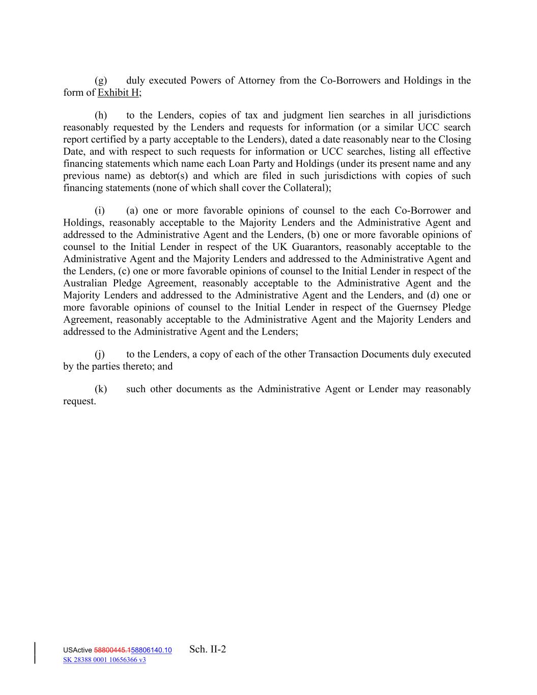 (g) duly executed Powers of Attorney from the Co‐Borrowers and Holdings in the form of Exhibit H; (h) to the Lenders, copies of tax and judgment lien searches in all jurisdictions reasonably requested by the Lenders and requests for information (or a similar UCC search report certified by a party acceptable to the Lenders), dated a date reasonably near to the Closing Date, and with respect to such requests for information or UCC searches, listing all effective financing statements which name each Loan Party and Holdings (under its present name and any previous name) as debtor(s) and which are filed in such jurisdictions with copies of such financing statements (none of which shall cover the Collateral); (i) (a) one or more favorable opinions of counsel to the each Co‐Borrower and Holdings, reasonably acceptable to the Majority Lenders and the Administrative Agent and addressed to the Administrative Agent and the Lenders, (b) one or more favorable opinions of counsel to the Initial Lender in respect of the UK Guarantors, reasonably acceptable to the Administrative Agent and the Majority Lenders and addressed to the Administrative Agent and the Lenders, (c) one or more favorable opinions of counsel to the Initial Lender in respect of the Australian Pledge Agreement, reasonably acceptable to the Administrative Agent and the Majority Lenders and addressed to the Administrative Agent and the Lenders, and (d) one or more favorable opinions of counsel to the Initial Lender in respect of the Guernsey Pledge Agreement, reasonably acceptable to the Administrative Agent and the Majority Lenders and addressed to the Administrative Agent and the Lenders; (j) to the Lenders, a copy of each of the other Transaction Documents duly executed by the parties thereto; and (k) such other documents as the Administrative Agent or Lender may reasonably request. USActive 58800445.158806140.10 SK 28388 0001 10656366 v3 Sch. II-2
