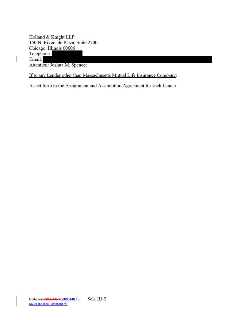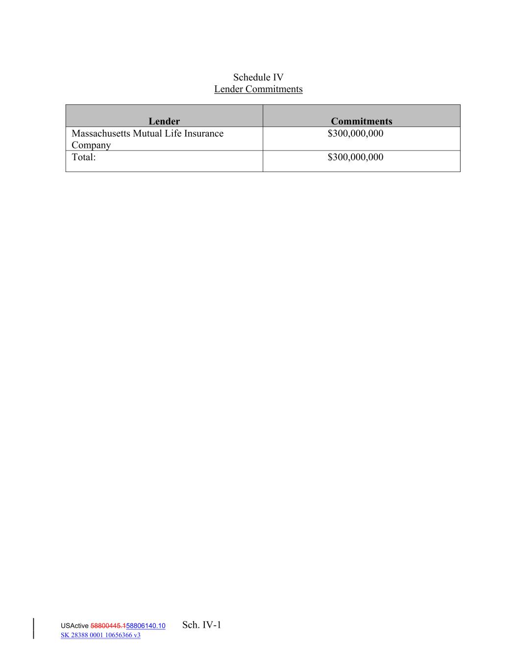 USActive 58800445.158806140.10 Sch. IV-1 SK 28388 0001 10656366 v3 Massachusetts Mutual Life Insurance Company $300,000,000 Lender Total: Commitments $300,000,000 Schedule IV Lender Commitments
