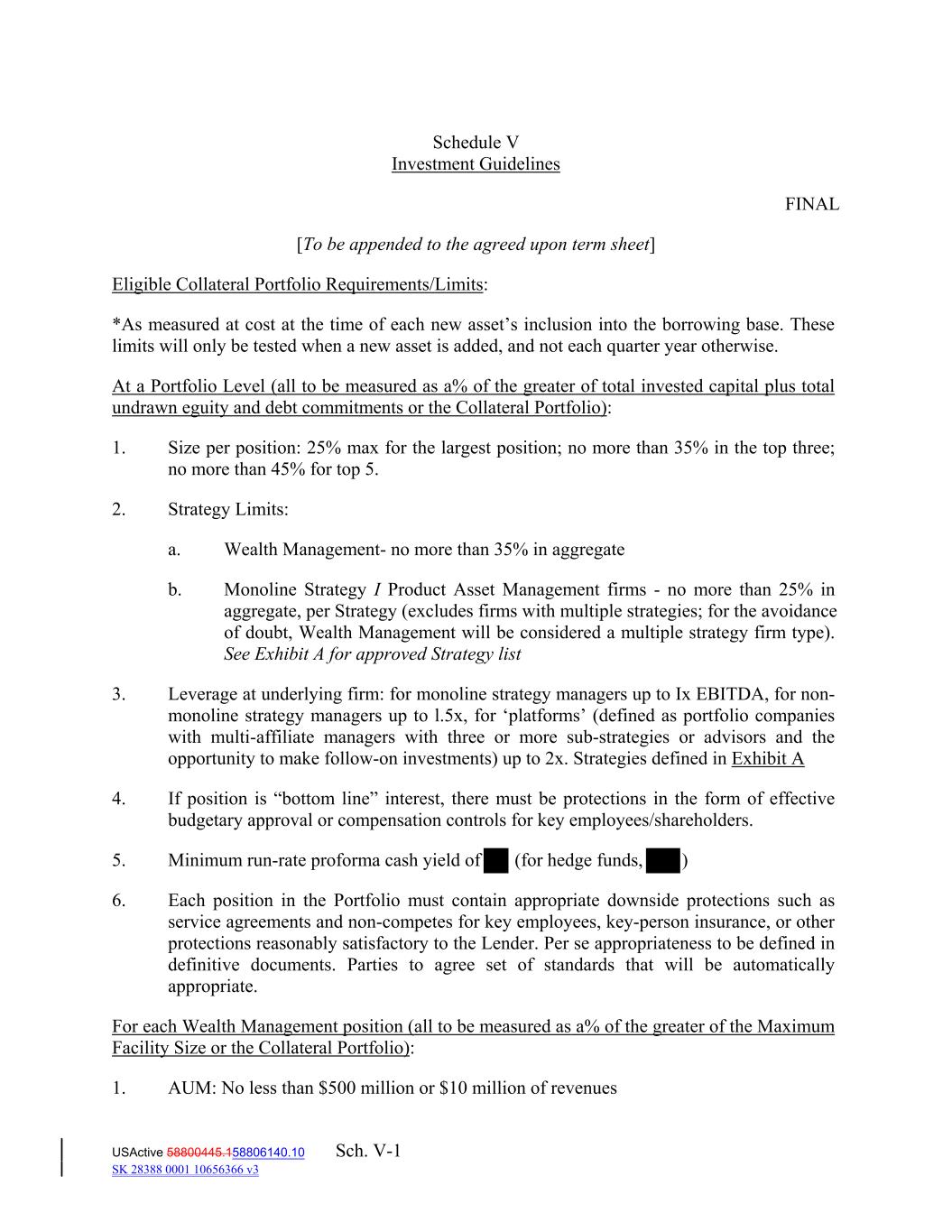 Schedule V Investment Guidelines FINAL [To be appended to the agreed upon term sheet] Eligible Collateral Portfolio Requirements/Limits: *As measured at cost at the time of each new asset’s inclusion into the borrowing base. These limits will only be tested when a new asset is added, and not each quarter year otherwise. At a Portfolio Level (all to be measured as a% of the greater of total invested capital plus total undrawn eguity and debt commitments or the Collateral Portfolio): 1. Size per position: 25% max for the largest position; no more than 35% in the top three; no more than 45% for top 5. 2. Strategy Limits: a. Wealth Management- no more than 35% in aggregate b. Monoline Strategy I Product Asset Management firms - no more than 25% in aggregate, per Strategy (excludes firms with multiple strategies; for the avoidance of doubt, Wealth Management will be considered a multiple strategy firm type). See Exhibit A for approved Strategy list 3. Leverage at underlying firm: for monoline strategy managers up to Ix EBITDA, for non- monoline strategy managers up to l.5x, for ‘platforms’ (defined as portfolio companies with multi-affiliate managers with three or more sub-strategies or advisors and the opportunity to make follow-on investments) up to 2x. Strategies defined in Exhibit A 4. If position is “bottom line” interest, there must be protections in the form of effective budgetary approval or compensation controls for key employees/shareholders. 5. Minimum run-rate proforma cash yield of (for hedge funds, ) 6. Each position in the Portfolio must contain appropriate downside protections such as service agreements and non-competes for key employees, key-person insurance, or other protections reasonably satisfactory to the Lender. Per se appropriateness to be defined in definitive documents. Parties to agree set of standards that will be automatically appropriate. For each Wealth Management position (all to be measured as a% of the greater of the Maximum Facility Size or the Collateral Portfolio): 1. AUM: No less than $500 million or $10 million of revenues USActive 58800445.158806140.10 Sch. V-1 SK 28388 0001 10656366 v3