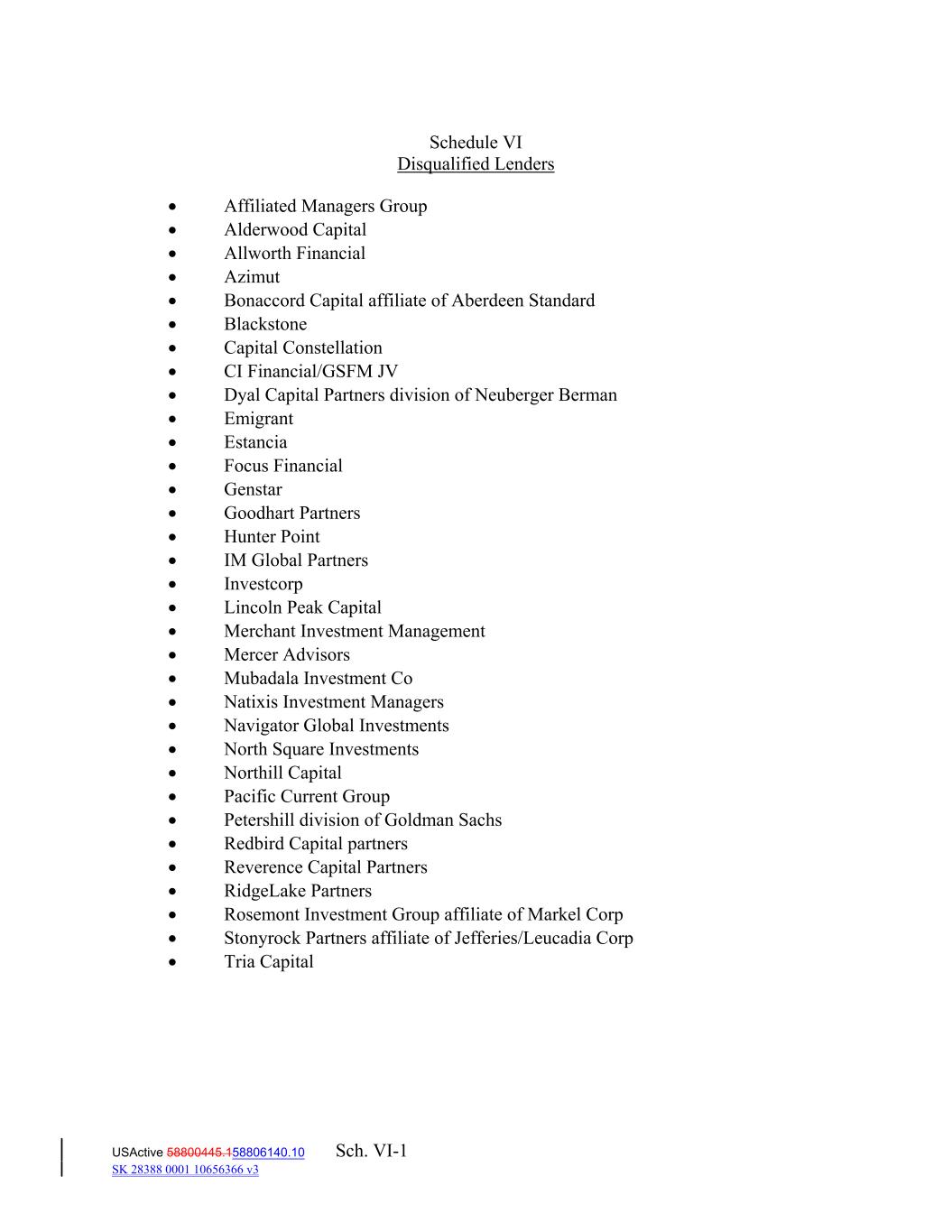 Schedule VI Disqualified Lenders  Affiliated Managers Group  Alderwood Capital  Allworth Financial  Azimut  Bonaccord Capital affiliate of Aberdeen Standard  Blackstone  Capital Constellation  CI Financial/GSFM JV  Dyal Capital Partners division of Neuberger Berman  Emigrant  Estancia  Focus Financial  Genstar  Goodhart Partners  Hunter Point  IM Global Partners  Investcorp  Lincoln Peak Capital  Merchant Investment Management  Mercer Advisors  Mubadala Investment Co  Natixis Investment Managers  Navigator Global Investments  North Square Investments  Northill Capital  Pacific Current Group  Petershill division of Goldman Sachs  Redbird Capital partners  Reverence Capital Partners  RidgeLake Partners  Rosemont Investment Group affiliate of Markel Corp  Stonyrock Partners affiliate of Jefferies/Leucadia Corp  Tria Capital USActive 58800445.158806140.10 Sch. VI-1 SK 28388 0001 10656366 v3