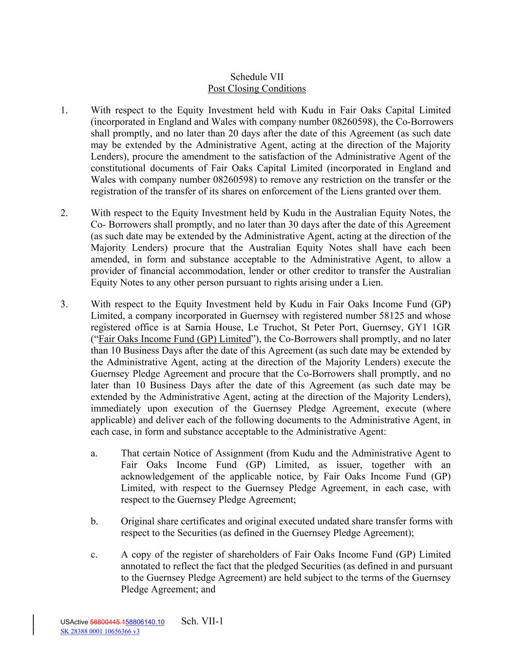 Schedule VII Post Closing Conditions 1. With respect to the Equity Investment held with Kudu in Fair Oaks Capital Limited (incorporated in England and Wales with company number 08260598), the Co‐Borrowers shall promptly, and no later than 20 days after the date of this Agreement (as such date may be extended by the Administrative Agent, acting at the direction of the Majority Lenders), procure the amendment to the satisfaction of the Administrative Agent of the constitutional documents of Fair Oaks Capital Limited (incorporated in England and Wales with company number 08260598) to remove any restriction on the transfer or the registration of the transfer of its shares on enforcement of the Liens granted over them. 2. With respect to the Equity Investment held by Kudu in the Australian Equity Notes, the Co‐ Borrowers shall promptly, and no later than 30 days after the date of this Agreement (as such date may be extended by the Administrative Agent, acting at the direction of the Majority Lenders) procure that the Australian Equity Notes shall have each been amended, in form and substance acceptable to the Administrative Agent, to allow a provider of financial accommodation, lender or other creditor to transfer the Australian Equity Notes to any other person pursuant to rights arising under a Lien. 3. With respect to the Equity Investment held by Kudu in Fair Oaks Income Fund (GP) Limited, a company incorporated in Guernsey with registered number 58125 and whose registered office is at Sarnia House, Le Truchot, St Peter Port, Guernsey, GY1 1GR (“Fair Oaks Income Fund (GP) Limited”), the Co‐Borrowers shall promptly, and no later than 10 Business Days after the date of this Agreement (as such date may be extended by the Administrative Agent, acting at the direction of the Majority Lenders) execute the Guernsey Pledge Agreement and procure that the Co‐Borrowers shall promptly, and no later than 10 Business Days after the date of this Agreement (as such date may be extended by the Administrative Agent, acting at the direction of the Majority Lenders), immediately upon execution of the Guernsey Pledge Agreement, execute (where applicable) and deliver each of the following documents to the Administrative Agent, in each case, in form and substance acceptable to the Administrative Agent: a. That certain Notice of Assignment (from Kudu and the Administrative Agent to Fair Oaks Income Fund (GP) Limited, as issuer, together with an acknowledgement of the applicable notice, by Fair Oaks Income Fund (GP) Limited, with respect to the Guernsey Pledge Agreement, in each case, with respect to the Guernsey Pledge Agreement; b. Original share certificates and original executed undated share transfer forms with respect to the Securities (as defined in the Guernsey Pledge Agreement); c. A copy of the register of shareholders of Fair Oaks Income Fund (GP) Limited annotated to reflect the fact that the pledged Securities (as defined in and pursuant to the Guernsey Pledge Agreement) are held subject to the terms of the Guernsey Pledge Agreement; and USActive 58800445.158806140.10 Sch. VII-1 SK 28388 0001 10656366 v3
