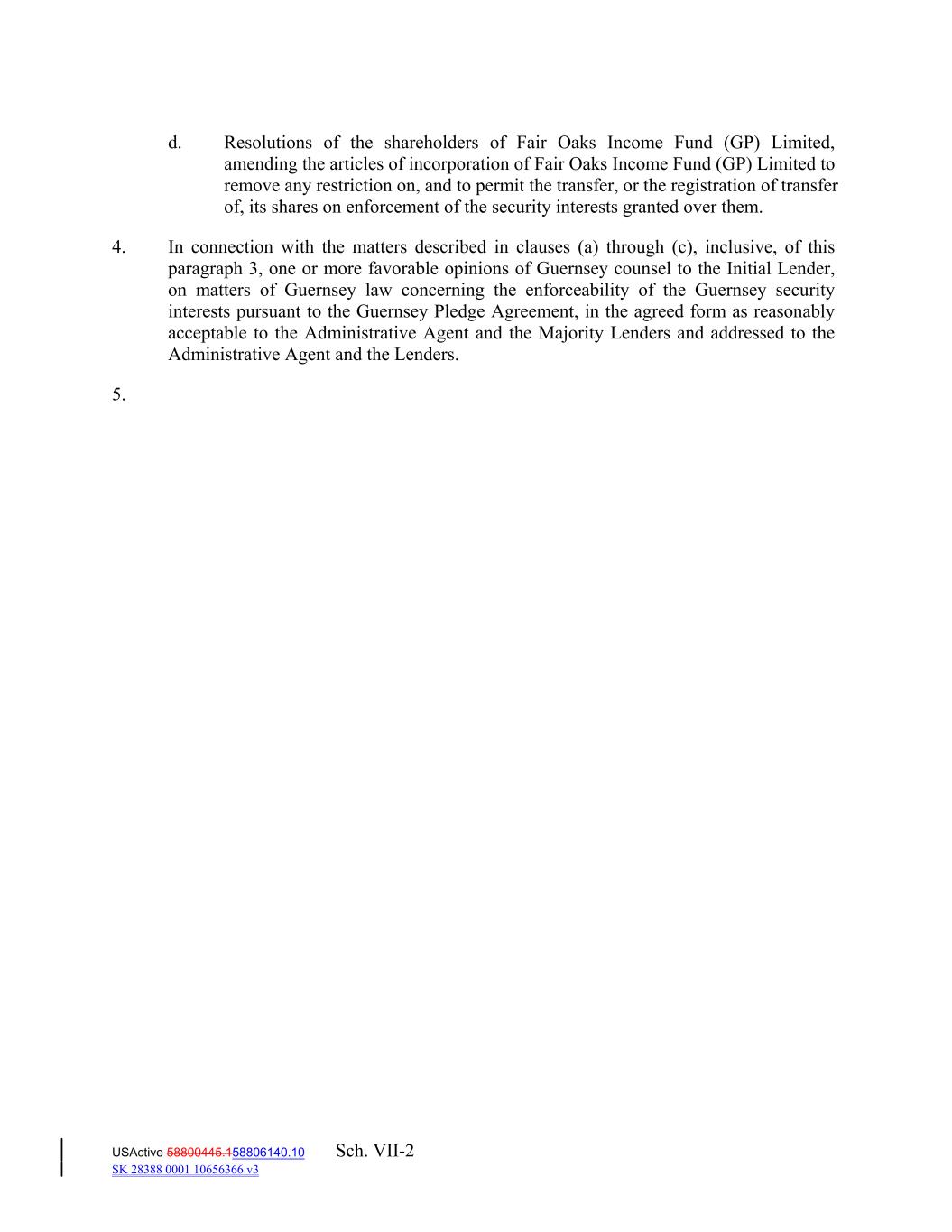 d. Resolutions of the shareholders of Fair Oaks Income Fund (GP) Limited, amending the articles of incorporation of Fair Oaks Income Fund (GP) Limited to remove any restriction on, and to permit the transfer, or the registration of transfer of, its shares on enforcement of the security interests granted over them. 4. In connection with the matters described in clauses (a) through (c), inclusive, of this paragraph 3, one or more favorable opinions of Guernsey counsel to the Initial Lender, on matters of Guernsey law concerning the enforceability of the Guernsey security interests pursuant to the Guernsey Pledge Agreement, in the agreed form as reasonably acceptable to the Administrative Agent and the Majority Lenders and addressed to the Administrative Agent and the Lenders. 5. USActive 58800445.158806140.10 Sch. VII-2 SK 28388 0001 10656366 v3