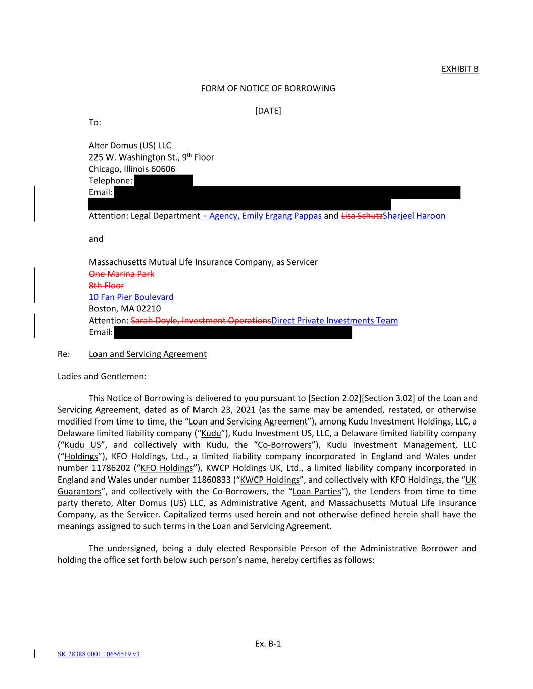 EXHIBIT B FORM OF NOTICE OF BORROWING [DATE] To: Alter Domus (US) LLC 225 W. Washington St., 9th Floor Chicago, Illinois 60606 Telephone:  Email: Attention: Legal Department – Agency, Emily Ergang Pappas and Lisa SchutzSharjeel Haroon and Massachusetts Mutual Life Insurance Company, as Servicer One Marina Park 8th Floor 10 Fan Pier Boulevard Boston, MA 02210 Attention: Sarah Doyle, Investment OperationsDirect Private Investments Team Email:  Re: Loan and Servicing Agreement Ladies and Gentlemen: This Notice of Borrowing is delivered to you pursuant to [Section 2.02][Section 3.02] of the Loan and Servicing Agreement, dated as of March 23, 2021  (as  the same may be amended, restated, or otherwise modified from time to time, the “Loan and Servicing Agreement”), among Kudu Investment Holdings, LLC, a Delaware limited liability company (“Kudu”), Kudu Investment US, LLC, a Delaware limited liability company (“Kudu  US”,  and  collectively  with  Kudu,  the  “Co‐Borrowers”),  Kudu  Investment  Management,  LLC (“Holdings”),  KFO  Holdings,  Ltd.,  a  limited  liability  company  incorporated  in  England  and Wales  under number 11786202  (“KFO Holdings”), KWCP Holdings UK, Ltd., a  limited  liability company  incorporated  in England and Wales under number 11860833 (“KWCP Holdings”, and collectively with KFO Holdings, the “UK Guarantors”, and collectively with  the Co‐Borrowers,  the “Loan Parties”),  the Lenders  from  time  to  time party  thereto, Alter Domus  (US)  LLC, as Administrative Agent, and Massachusetts Mutual  Life  Insurance Company, as the Servicer. Capitalized terms used herein and not otherwise defined herein shall have the meanings assigned to such terms in the Loan and Servicing Agreement. The  undersigned,  being  a  duly  elected  Responsible  Person  of  the  Administrative  Borrower  and holding the office set forth below such person’s name, hereby certifies as follows: Ex. B‐1 SK 28388 0001 10656519 v3